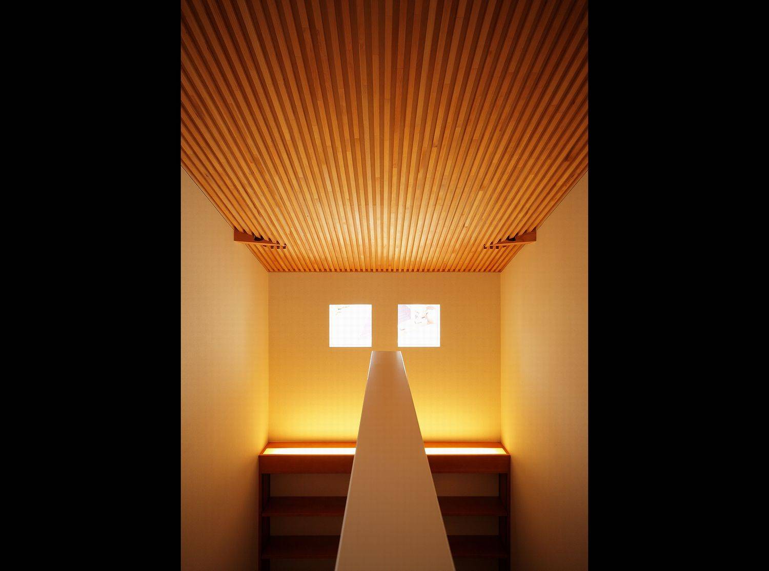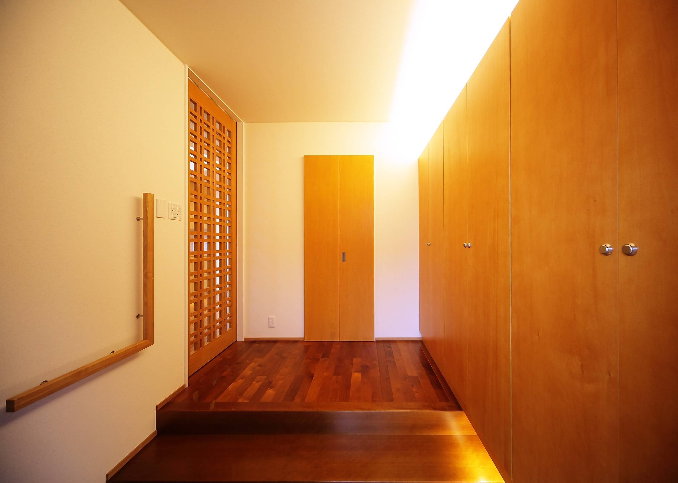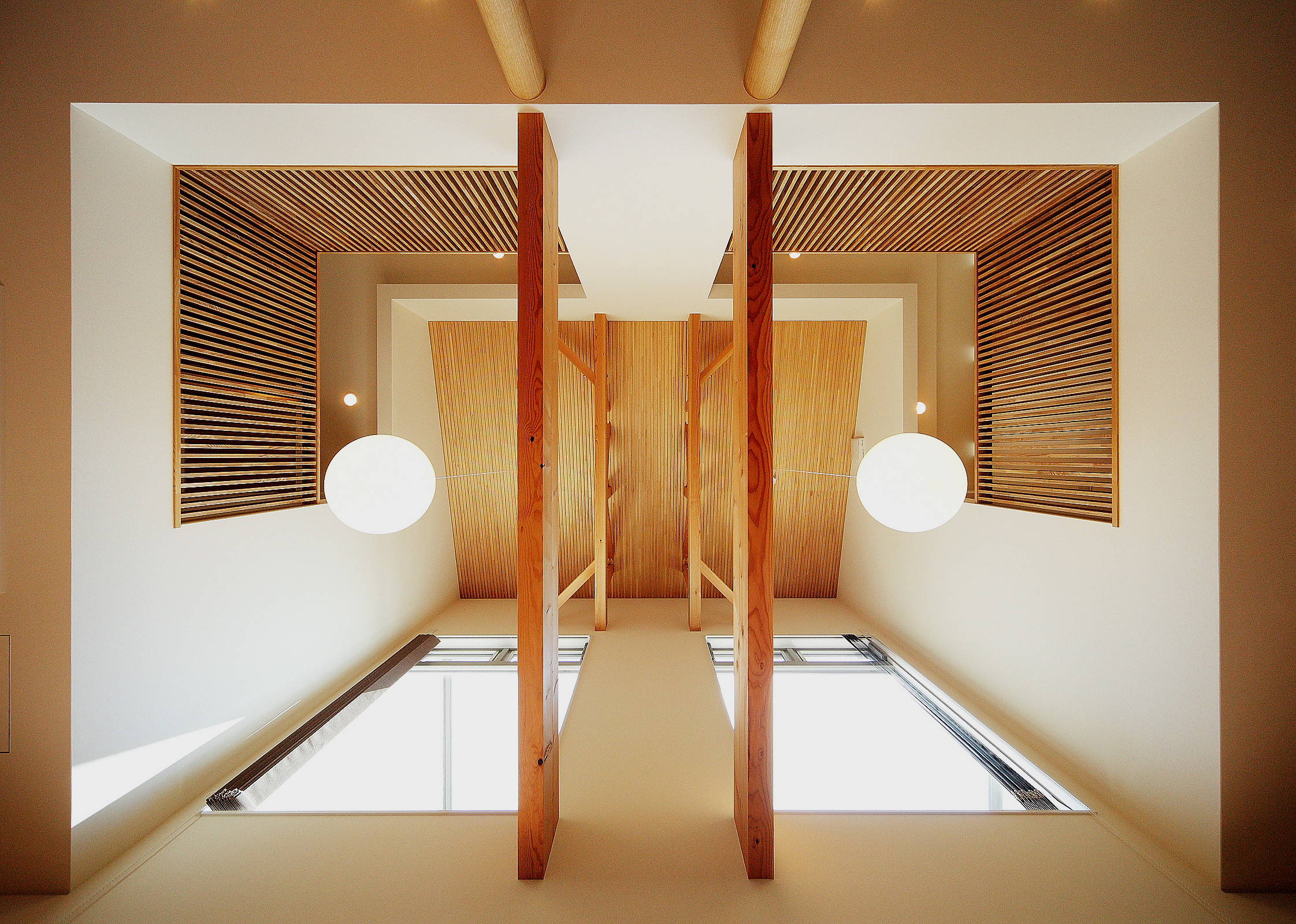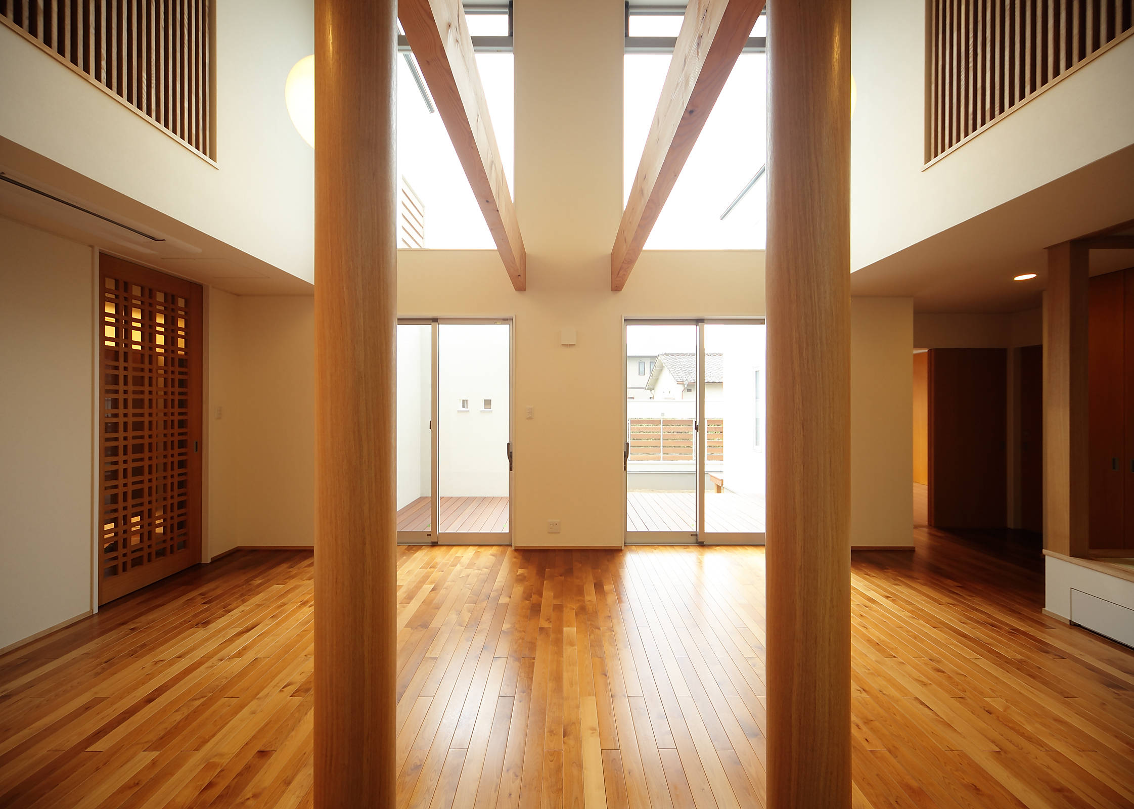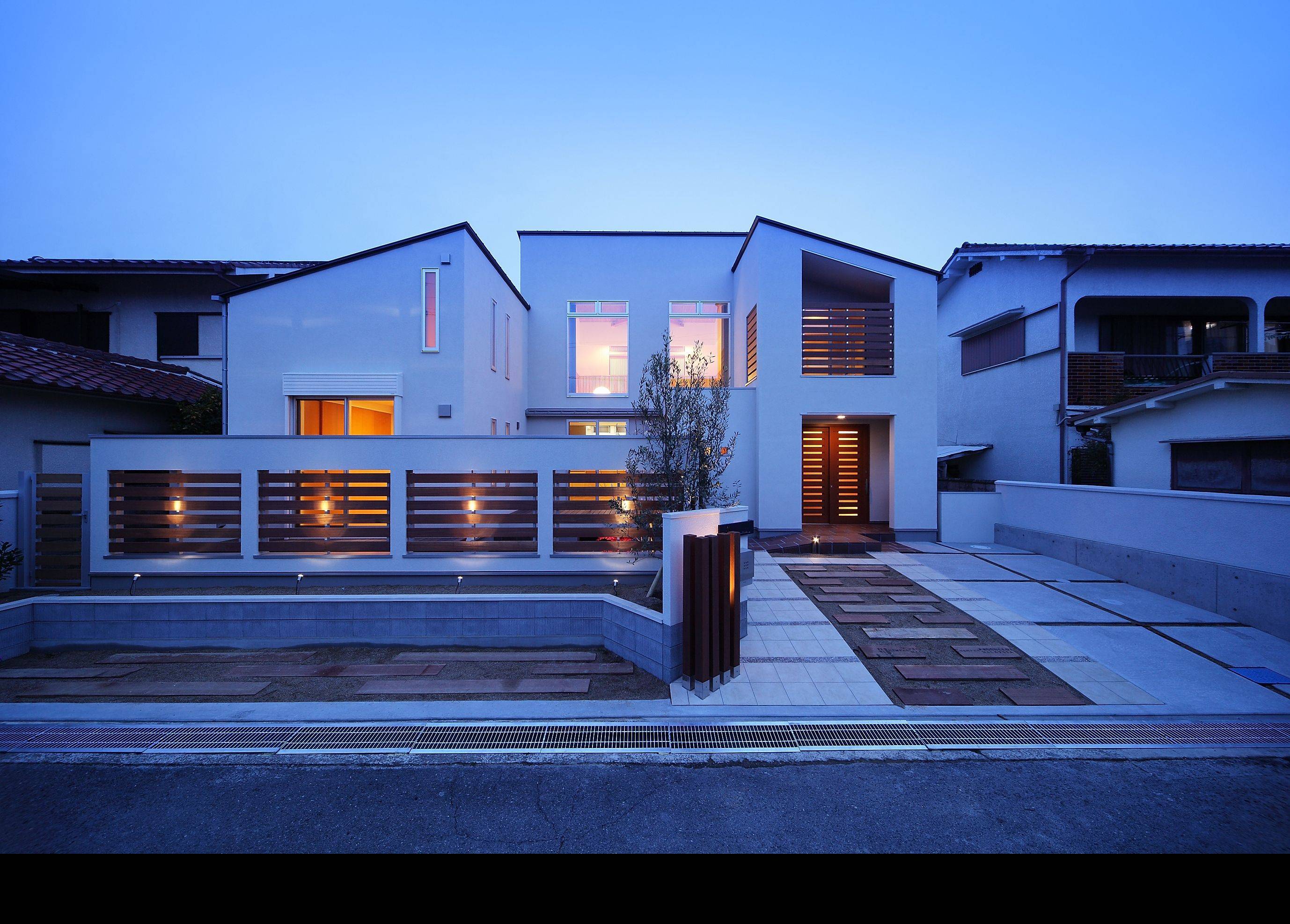 単世帯のような二世帯住宅。水周りや玄関を1箇所に集約することで、収納スペースやLDKの広さを確保する平面計画です。キッチンを家の中心に据え南側を向けて庭を眺めるようにし、リビングダイニングの吹抜けに向けて二階の各個室を配置、家族お互いが各々の気配を感じられるような断面計画としました。親子間で共通の趣味、ガーデニングであることを生かし外構の各所に植栽スペースを確保、家族どおしのコミュニケーションの一助となるように、との願いを込めてプラン提案しました。