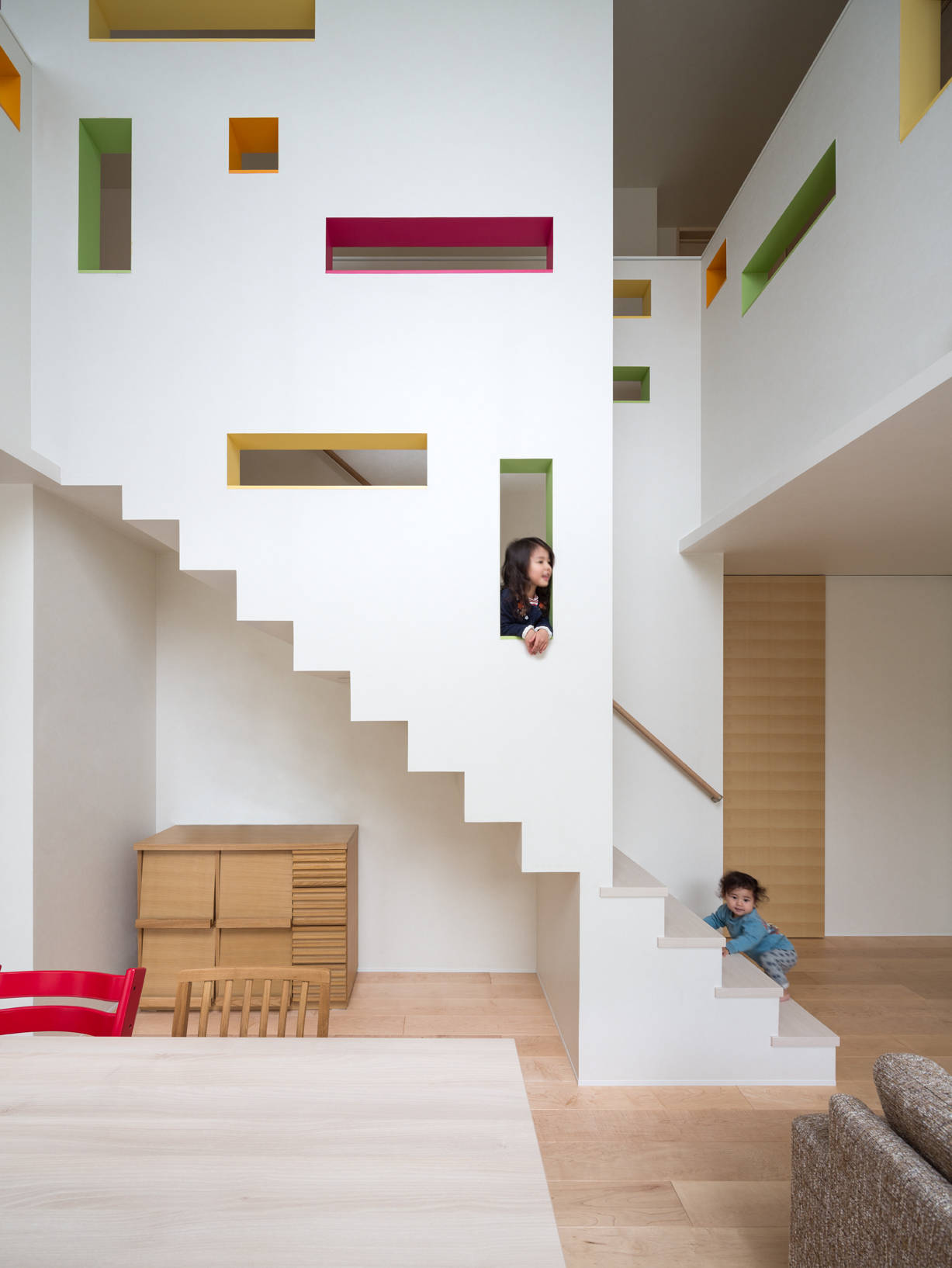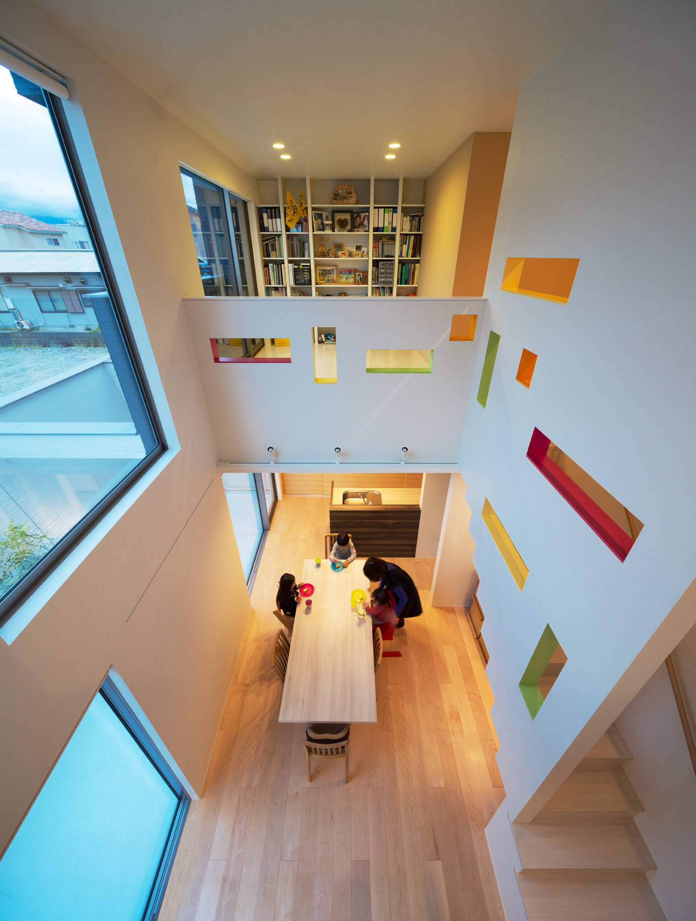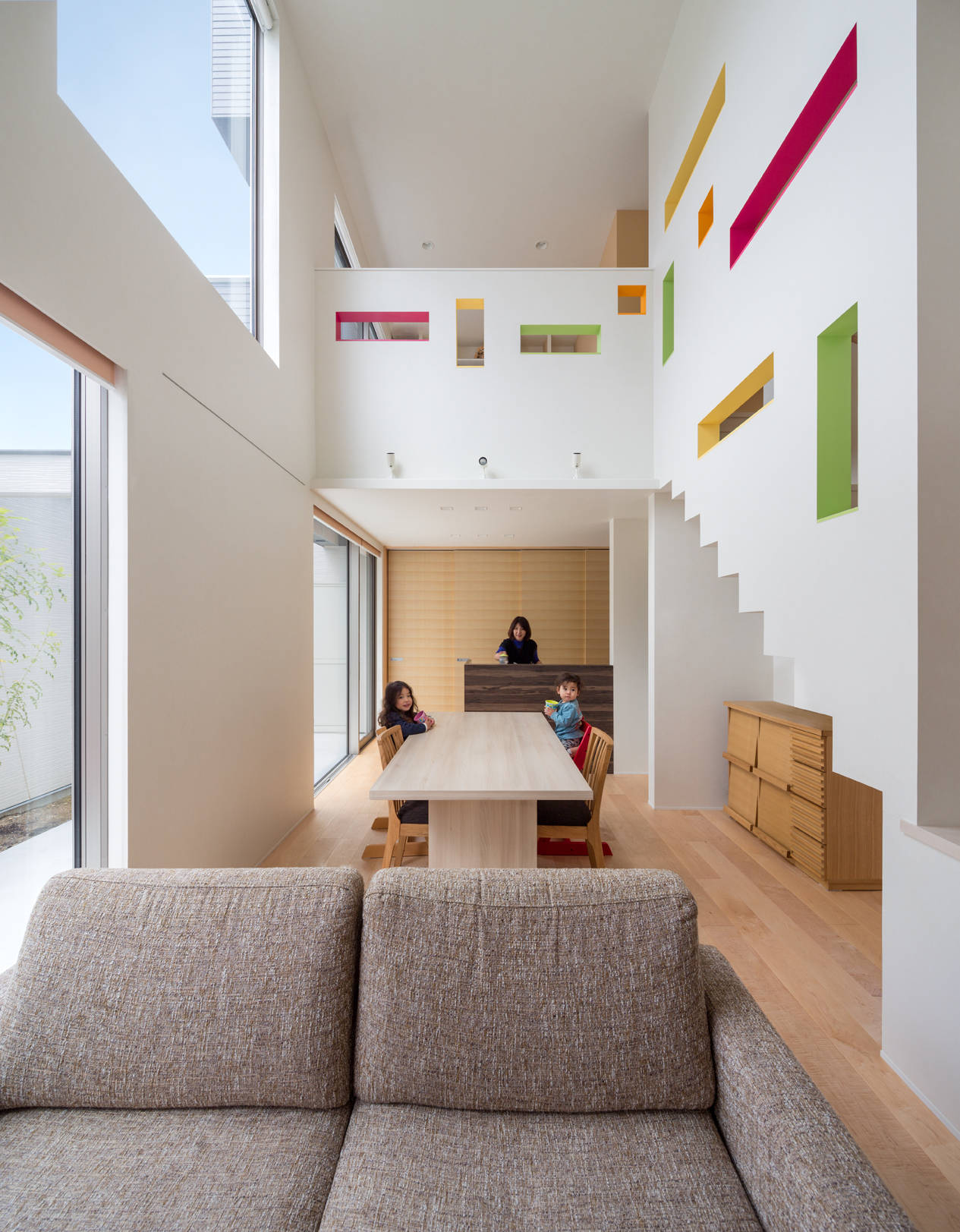 住宅の中に入るとホワイトの壁に計画したカラフルなカラーの不規則なスリットがリズム感のある明るいリビング・ダイニングを造り出しています。
