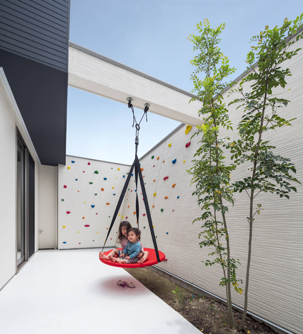 リビング・ダイニングの外部には、家の壁に囲まれたプライバシーを守れる安全なテラスバルコニーと繋がっています。ここにはブランコやフリークライミングなど子供たちが遊べる工夫があります。