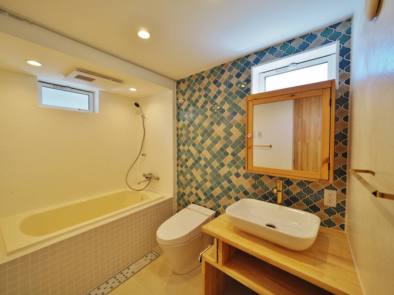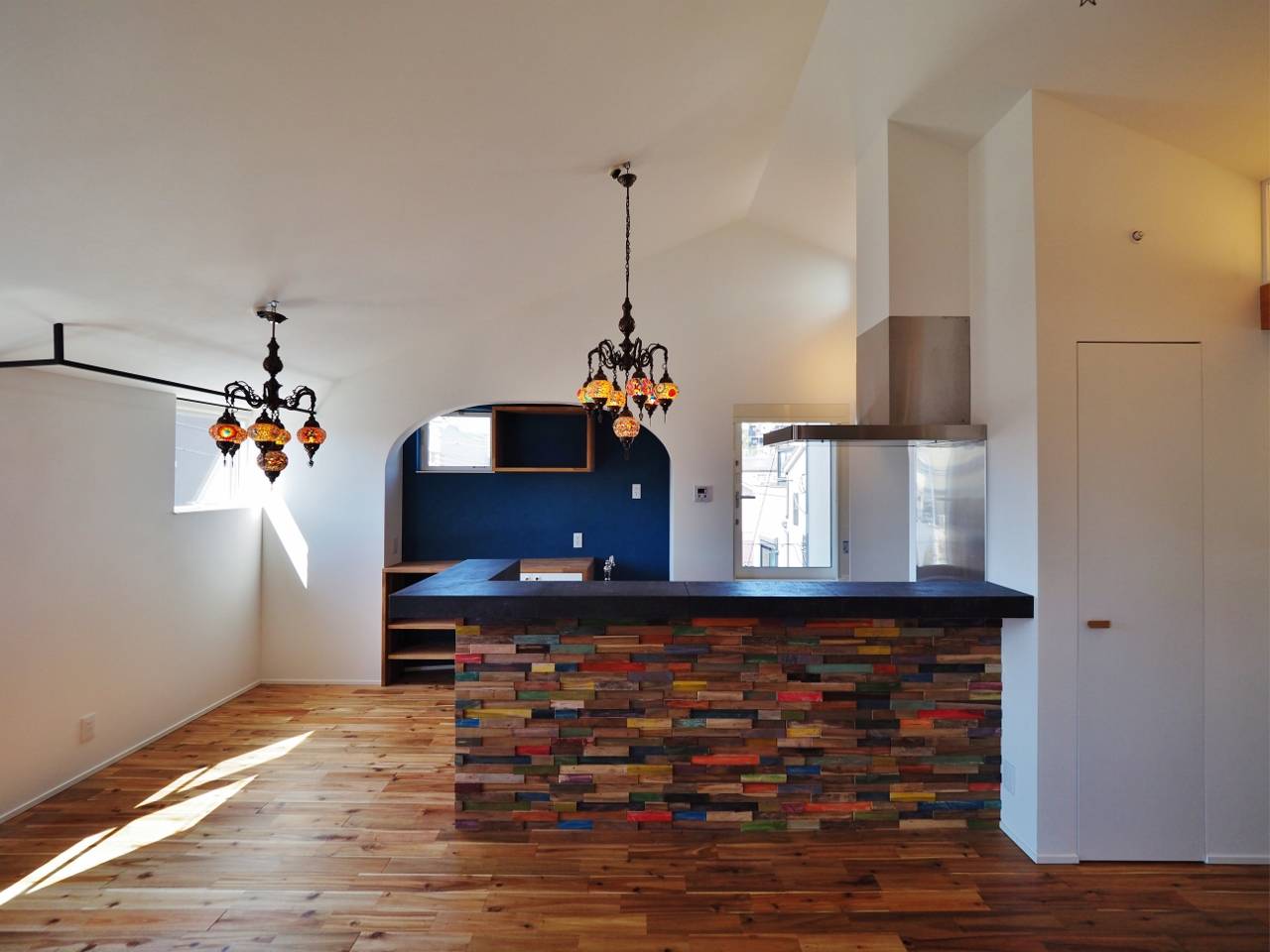 内部については、賃貸部分はシンプルな作りとすることを心掛けて、オーナー宅については、依頼主の好みであるモロカンスタイルをイメージして計画しました。ビビットな赤や青などの塗り壁をアクセントで取り入れ、垂れ壁はアール形状としています。また、狭い面積でも広く感じるように間仕切りをできる限り少なくし、空間に広がりが感じられるように考慮しています。