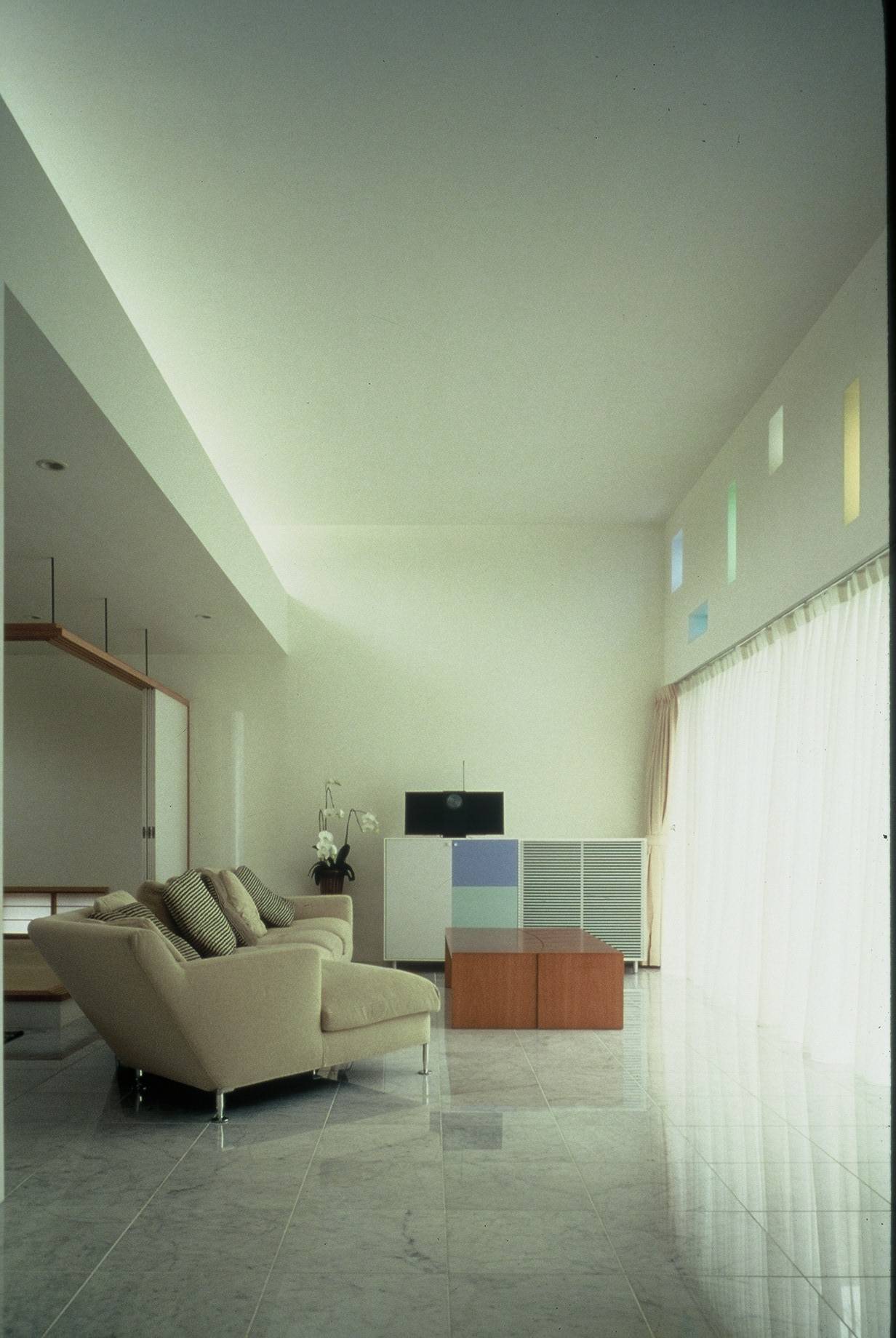 リビング:吹き抜け部分にはハイサイドライトがとられ、閉じた外観とは違った開放的な光と風が穏やかに取り入れられています。
