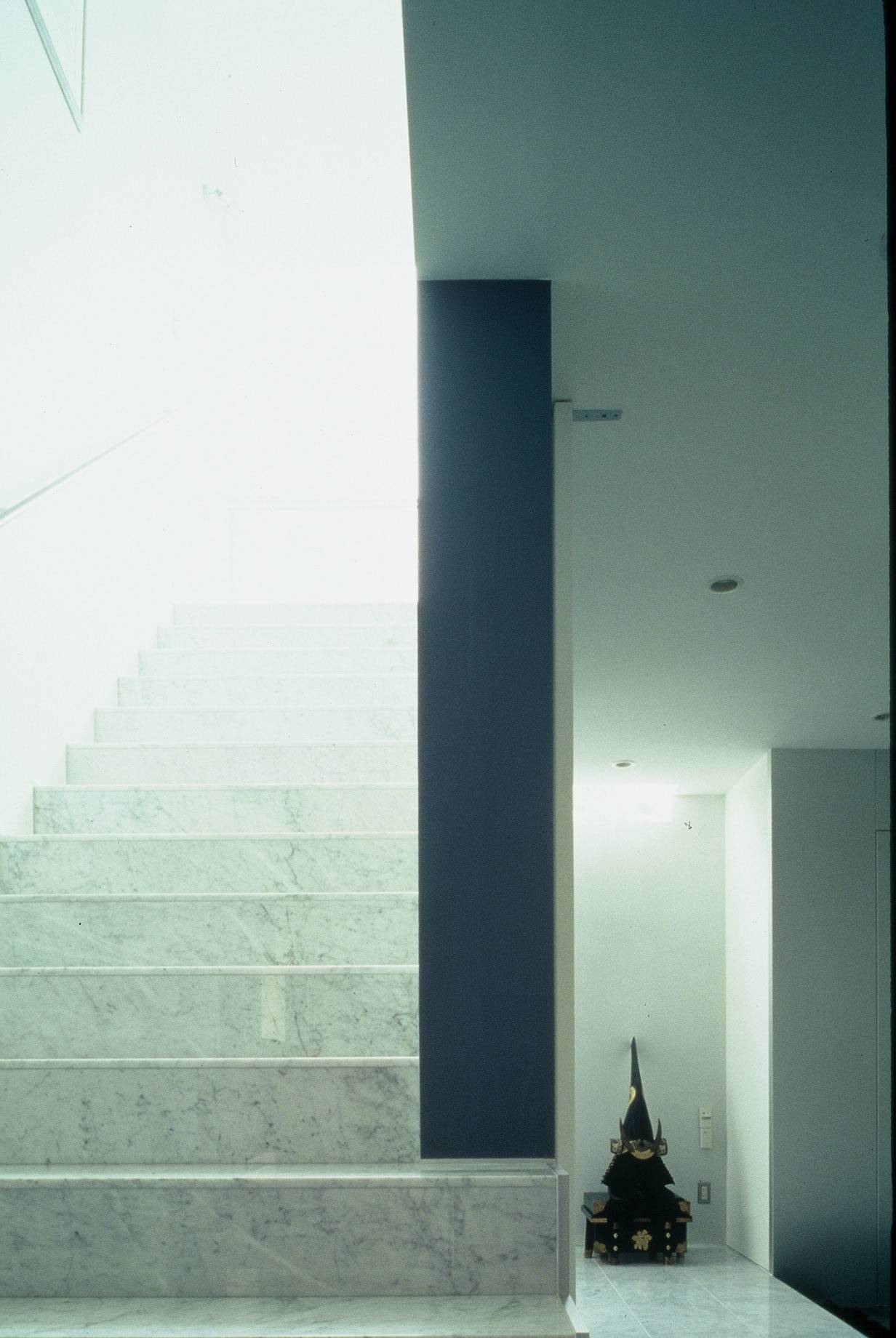 玄関ホール:白い大理石(ビアンコカララ)と紺色のアクセントカラーで作られたインテリアの空間です。