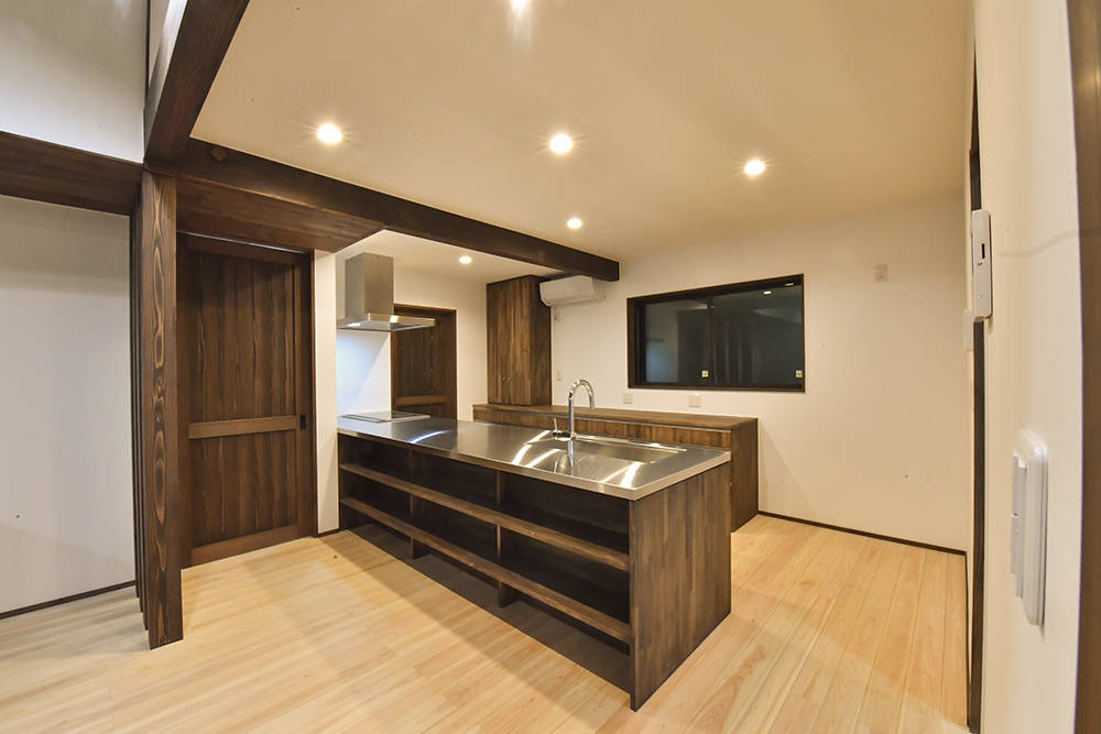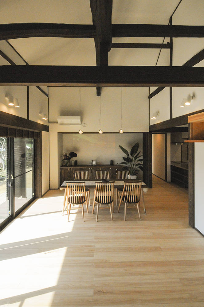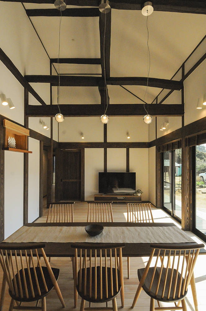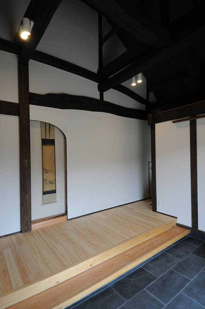 また、そこに住まわれてきたご家族の思いを受け継ぐためにも、古い架構を活かした空間とし、建具や土壁、煤竹など古材も活用しています。