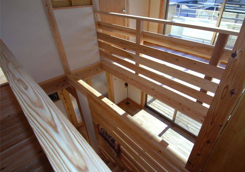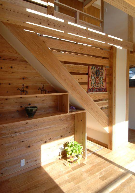 木造軸組工法で杉の柱、杉の梁、天井も杉に包まれたシンプルなデザインの住宅