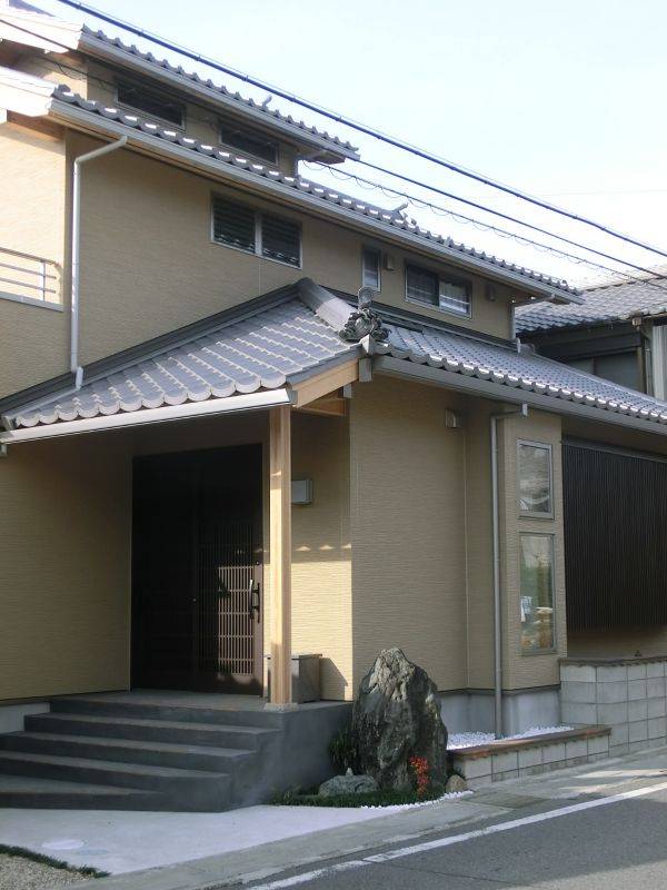 いぶし瓦の屋根に自作の鬼瓦がのる