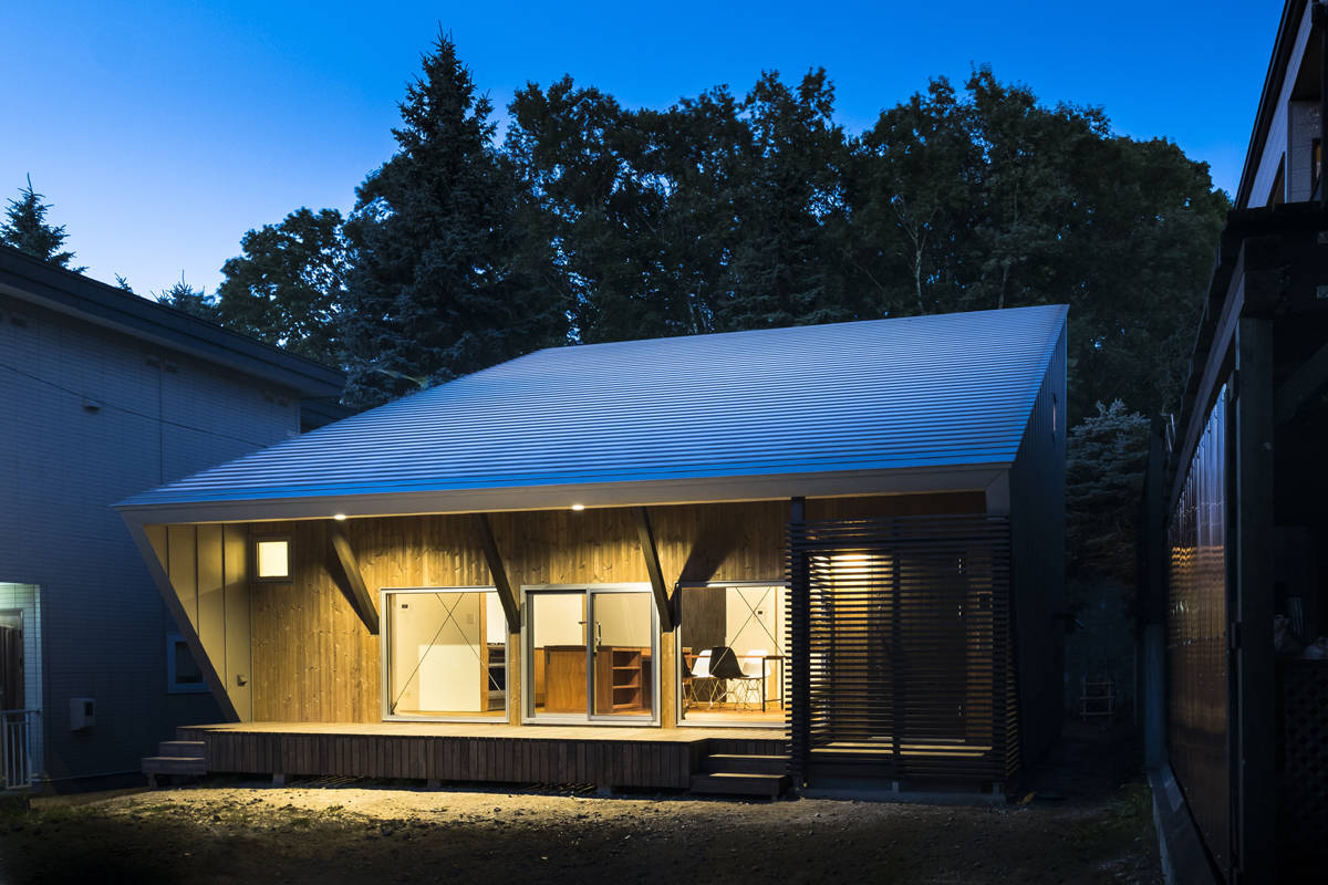 通りから森を見ながらエントランスに向かうのをイメージして正面のボリュームを低く抑えたプロポーションとした。