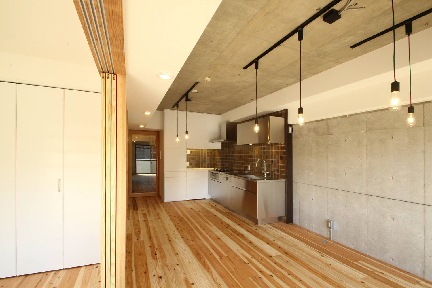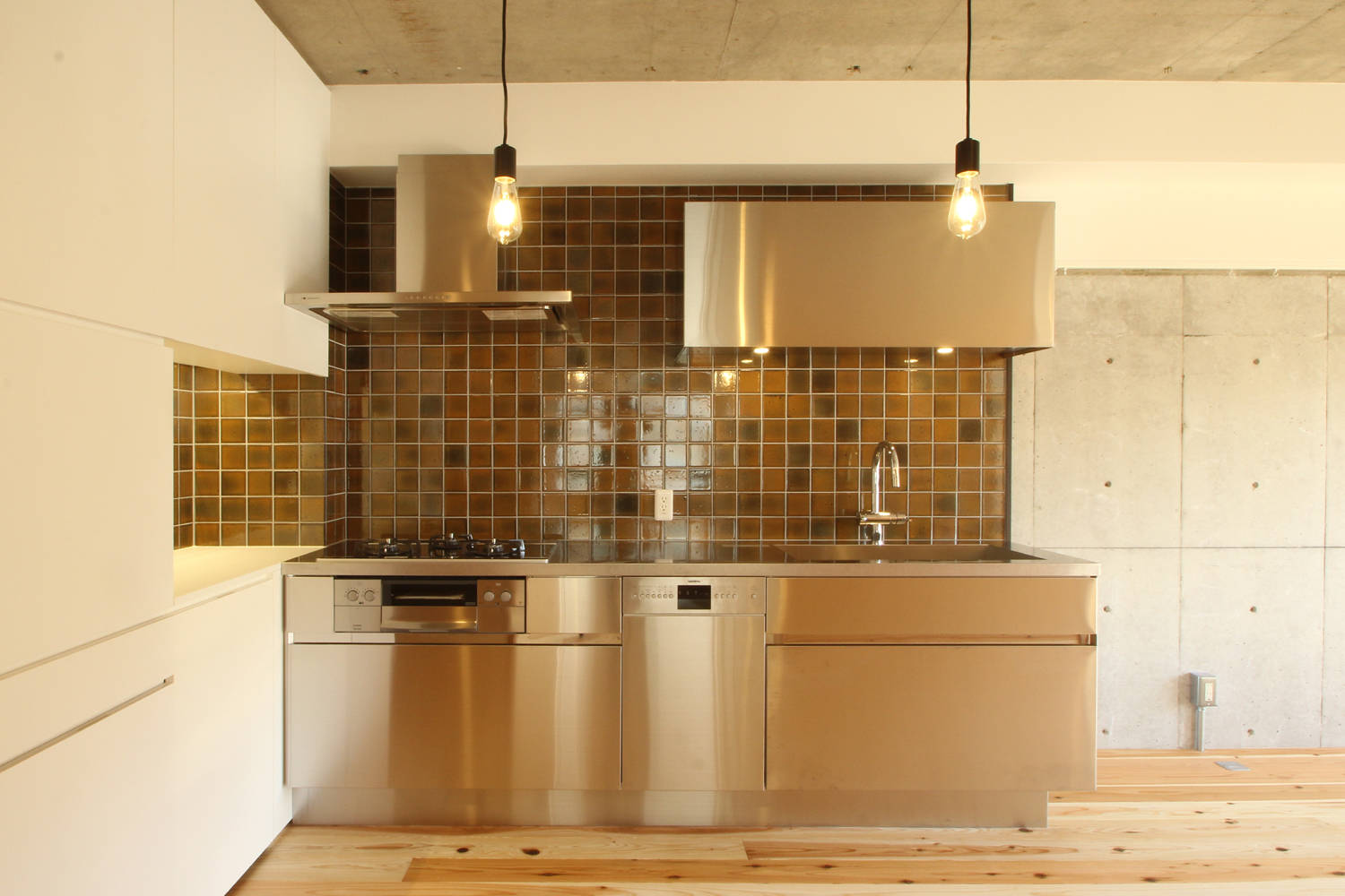 シンプルな対比の空間に、ステンレスキッチンやタイルのアクセントによって動きが出た。