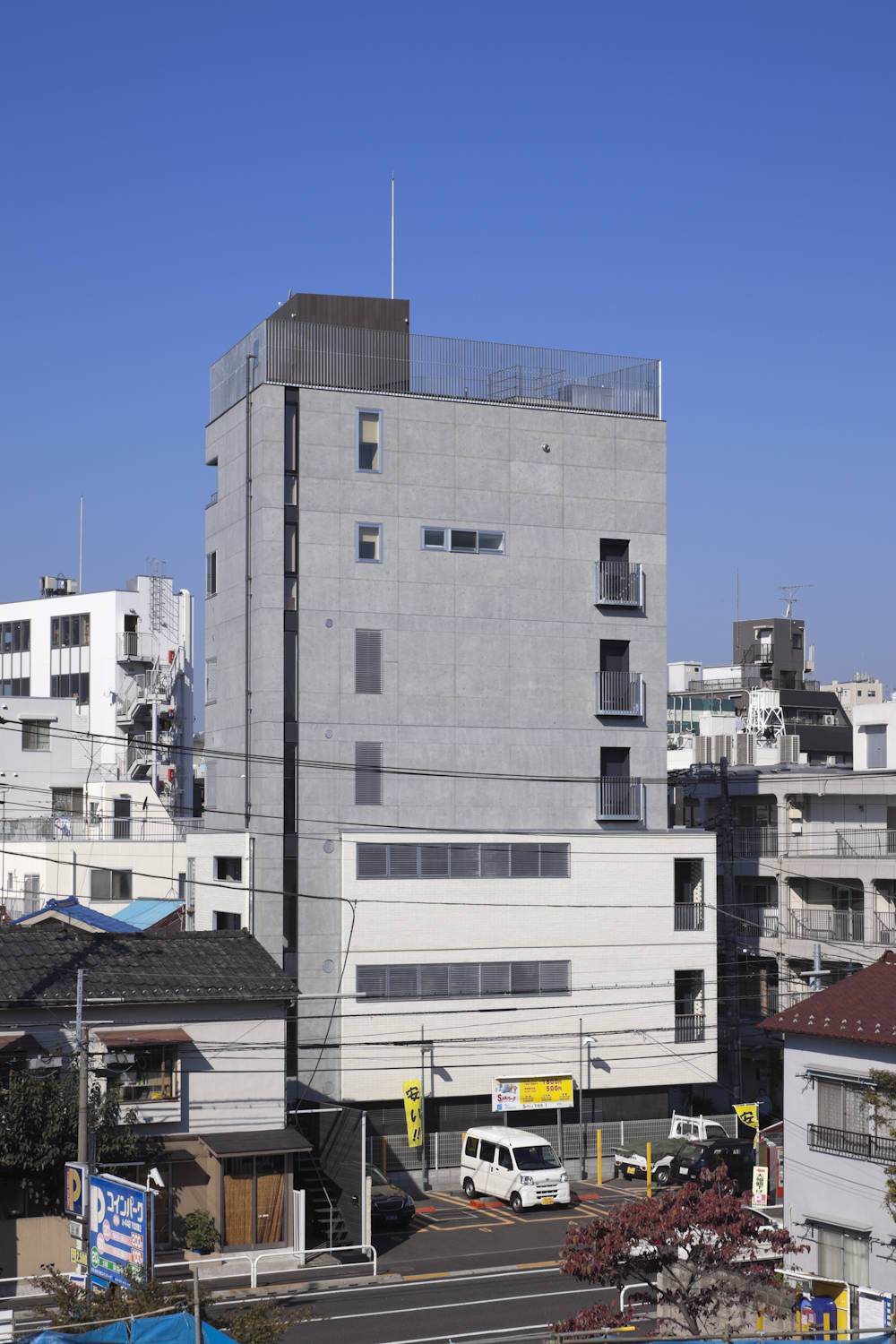 機能的に共用部を縦導線と絡め、できるだけコンパクトにしてレンタブル比を高める計画としたが、共用階段を前面道路側に配置することで、