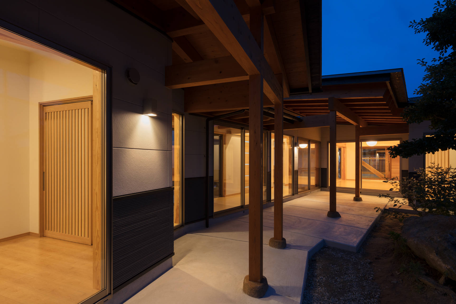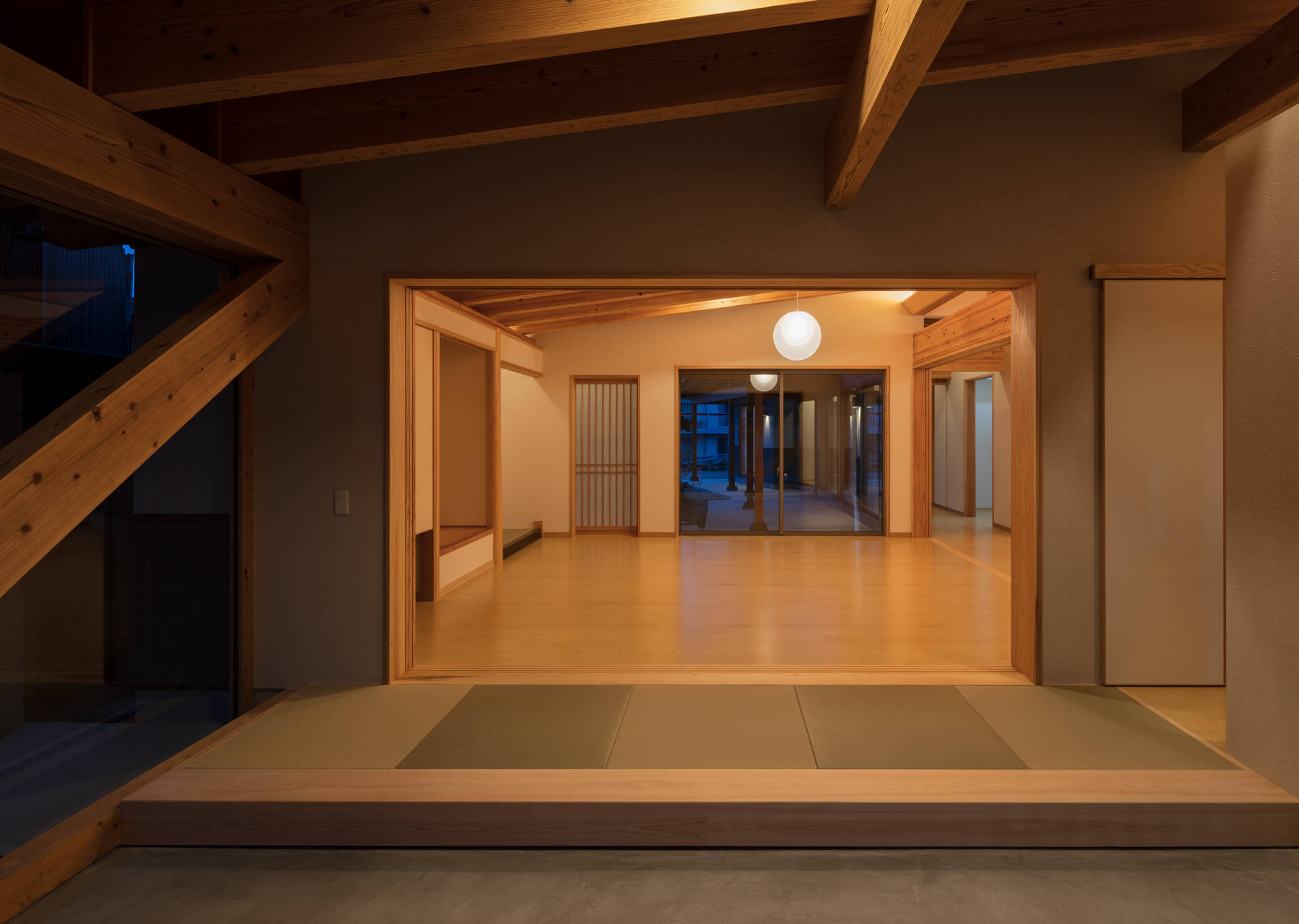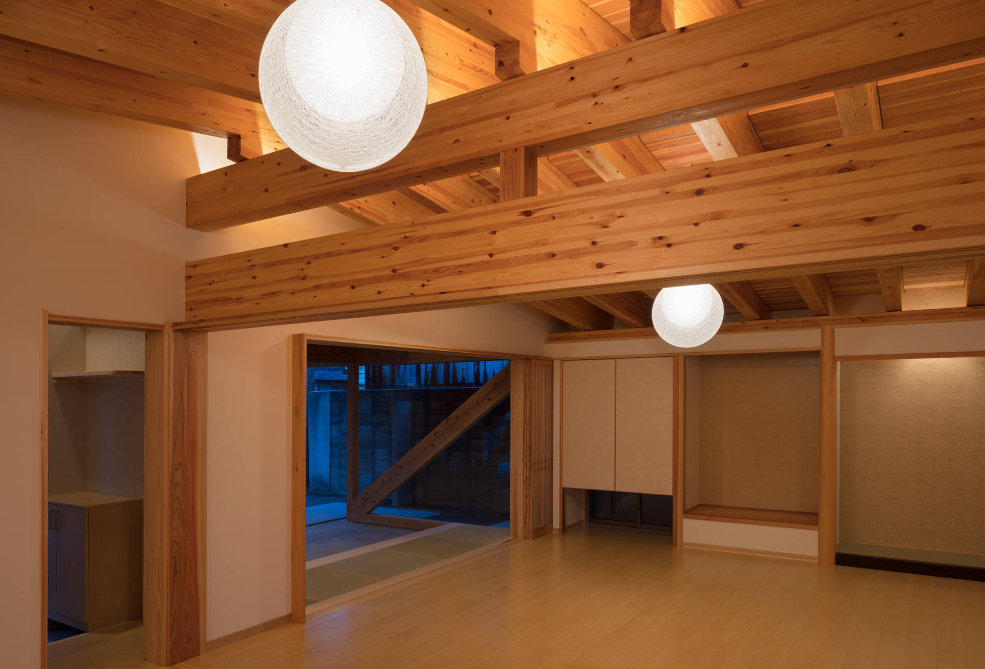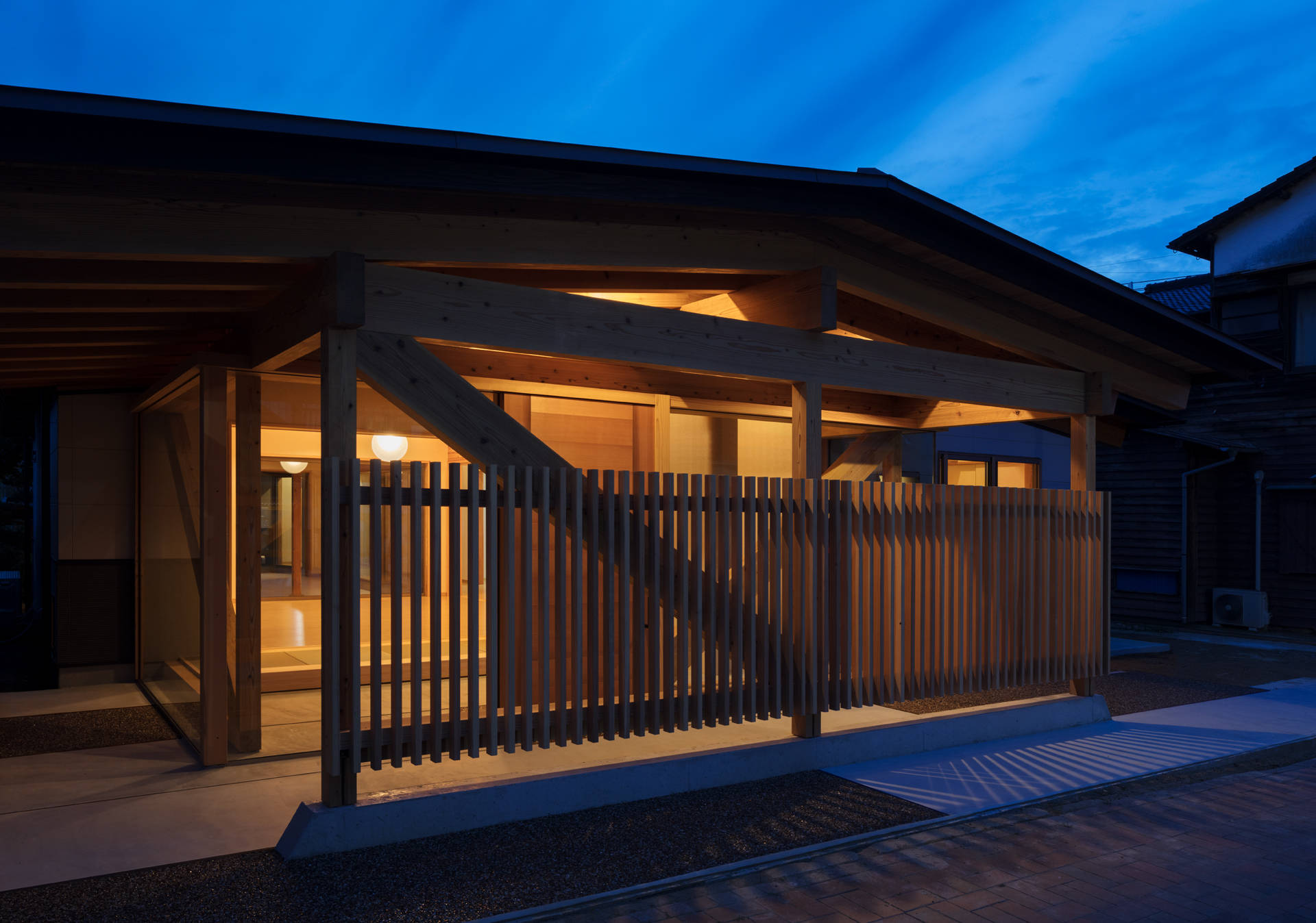 そして母屋のファサードが一番の課題であった。もともと既存建屋が前面道路に背を向けるように建てられていたこともあり、参道に佇む建築として、風情ある町並みに馴染ませようと試みた。木格子や透明ガラス、躍動する構造ブレース(筋交)でレイヤを重ね表情をつくり出し、最も奥に控える上り床の引き込み障子(=ベースレイヤ)によって、光の道が止んだ夜間や、年に数回ある参拝混雑時期の外部からの強い視線を制御することができる。