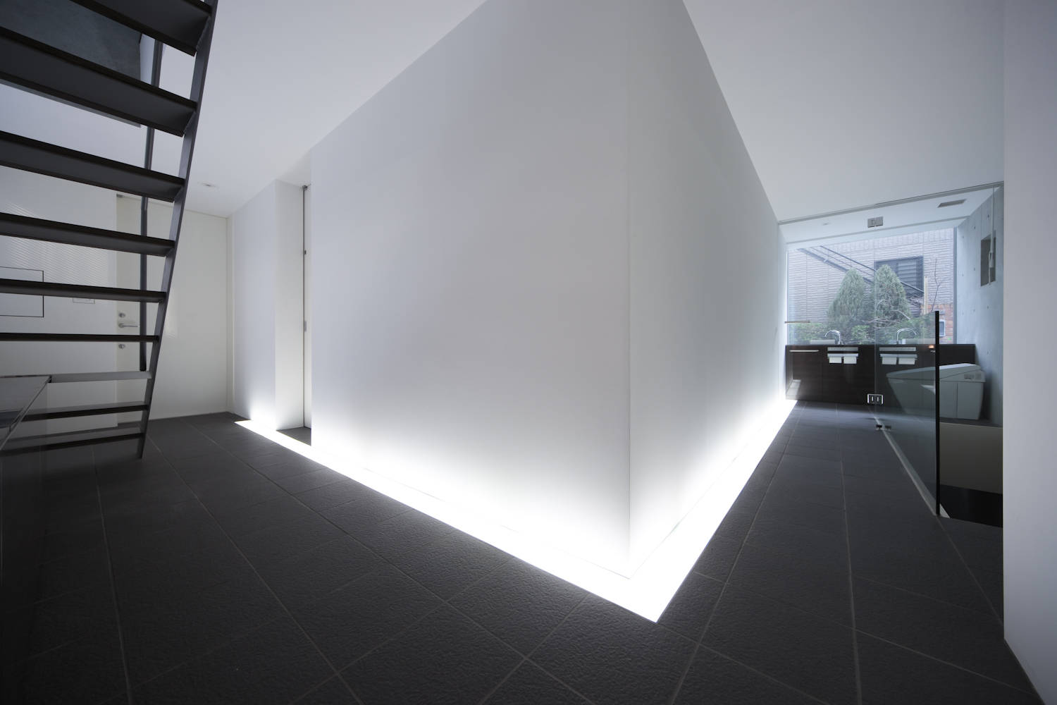1階には、駐車場(室-3)とWC,そして2つの階段がある。この2つの階段は其々「静」の空間と「動」の空間に人々を導く。