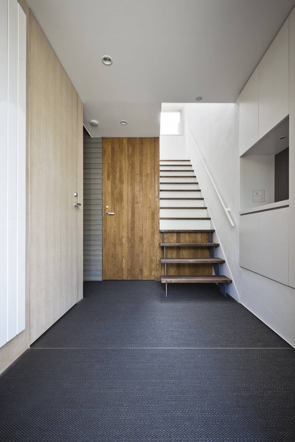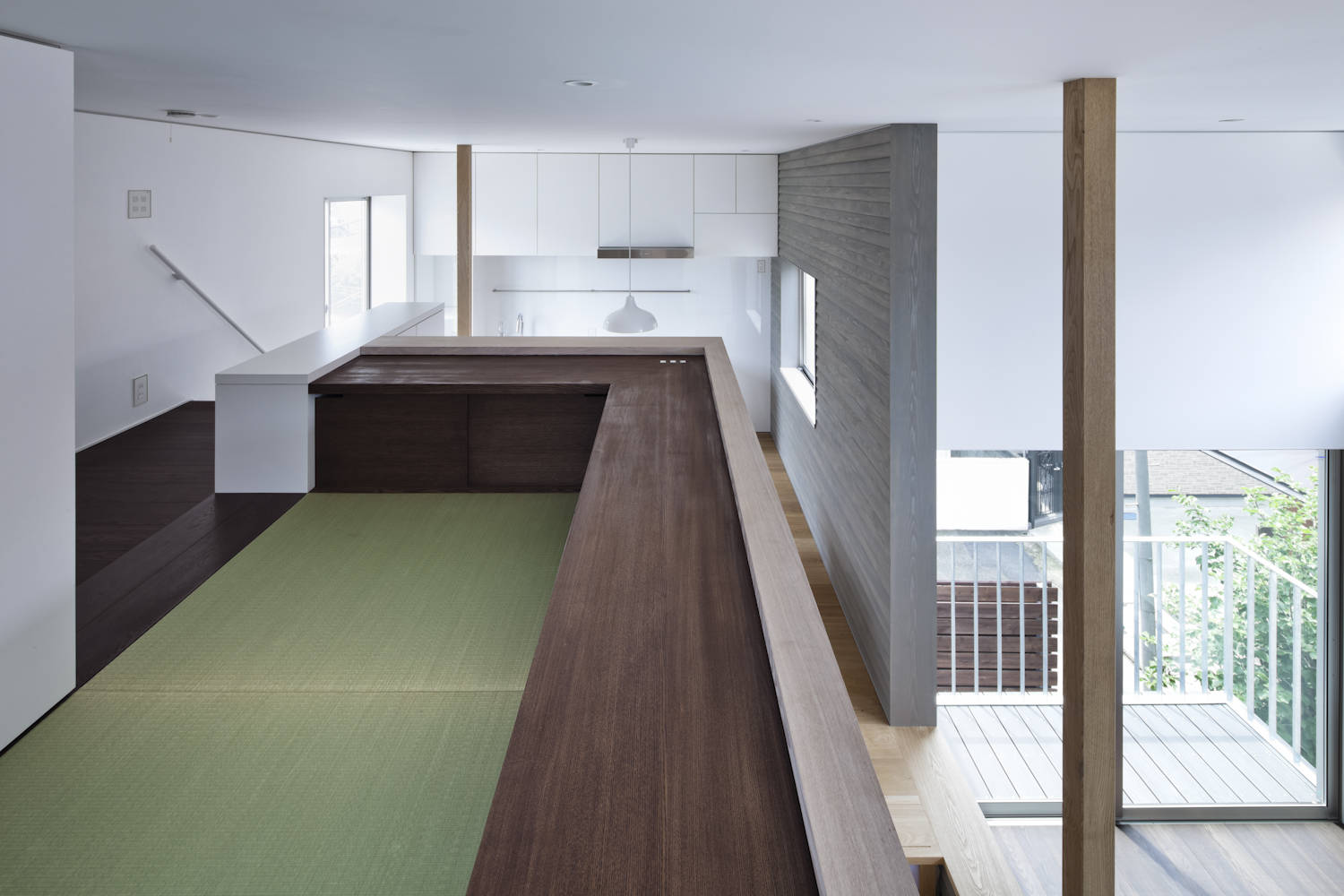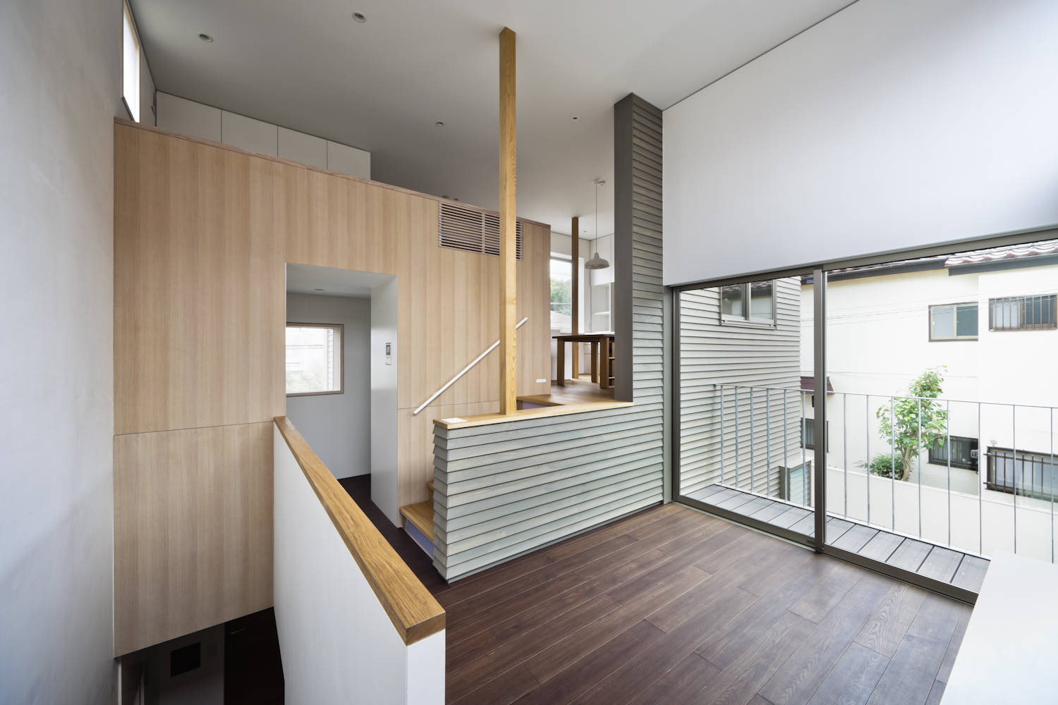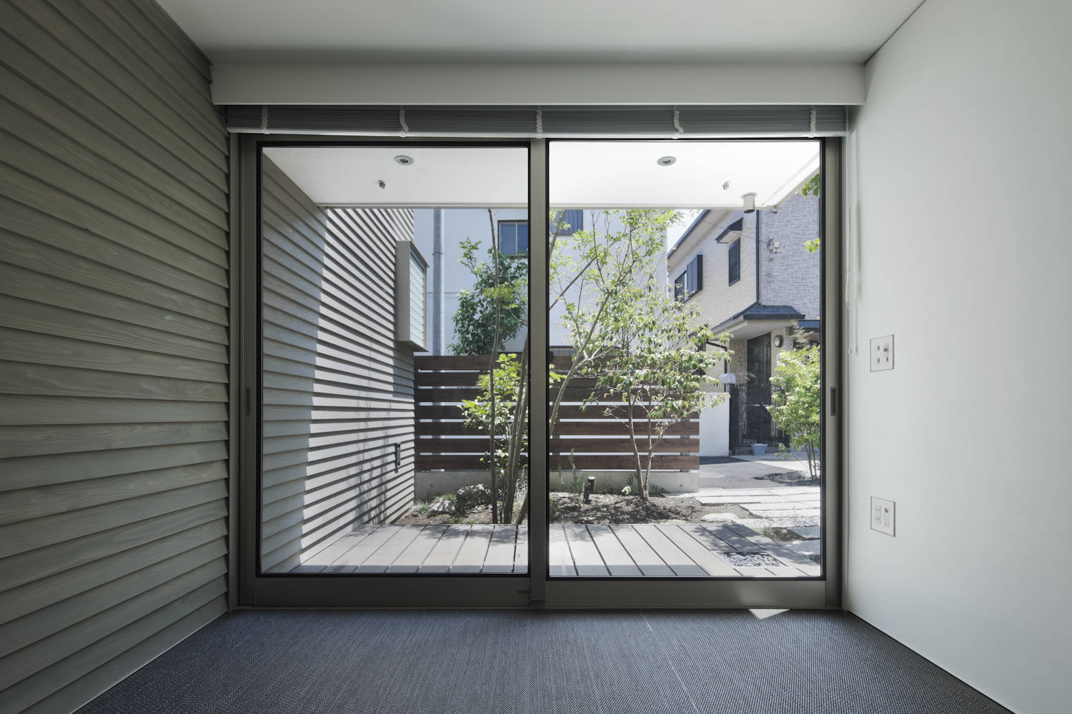 建築面積が約11坪という限られたボリュームの中で、立体的に空間を構成し動線を交差させ、生活に深みを与える計画とした。また、中庭に面した内壁に外壁の材料を介入させ、共有スペースである中庭を内部空間として見立てた。駐車場も共有とすることで、3家族の住宅をひとつのまとまりとして扱った。