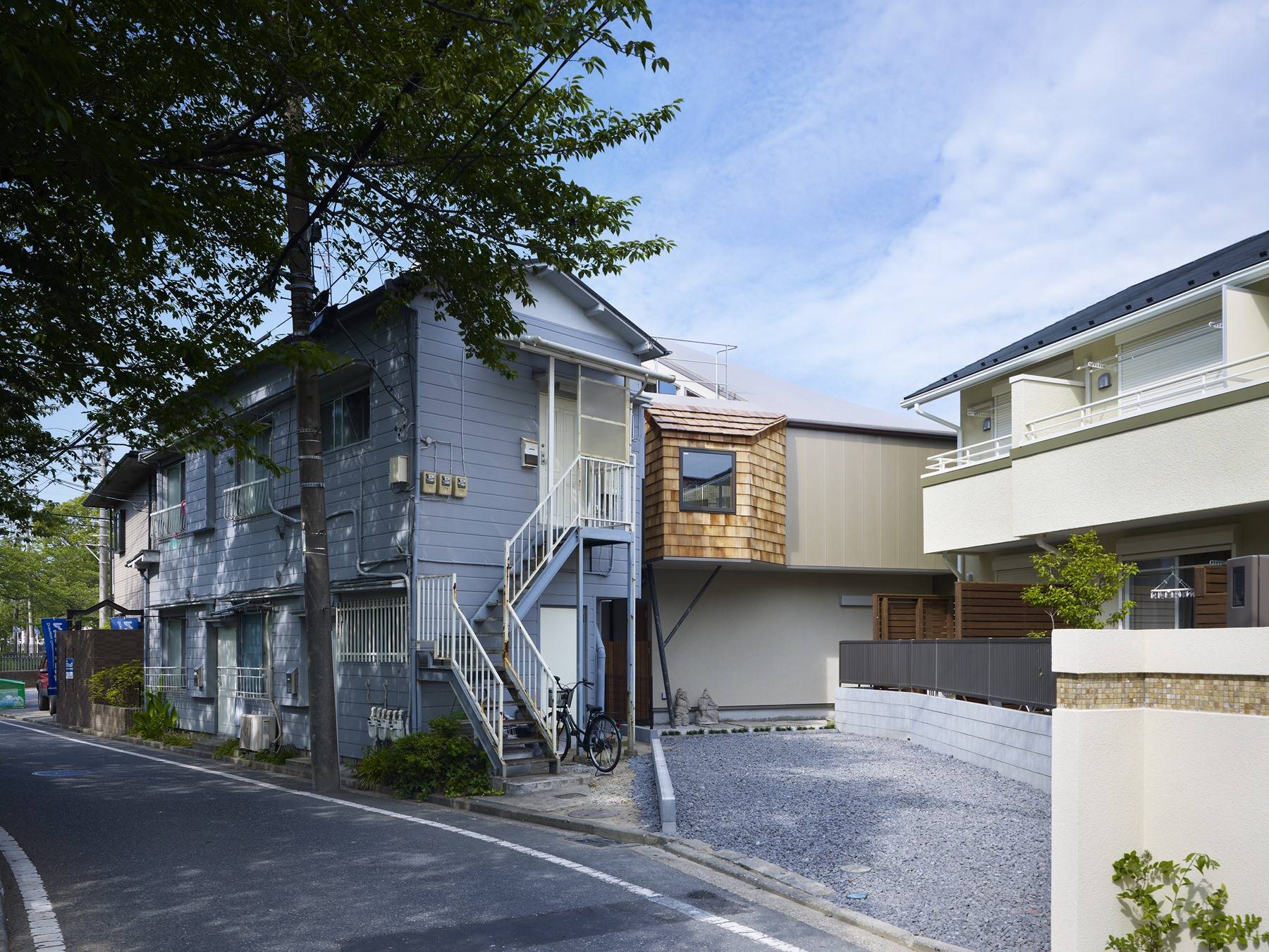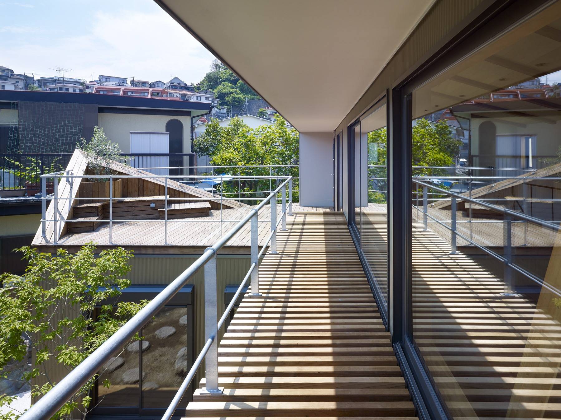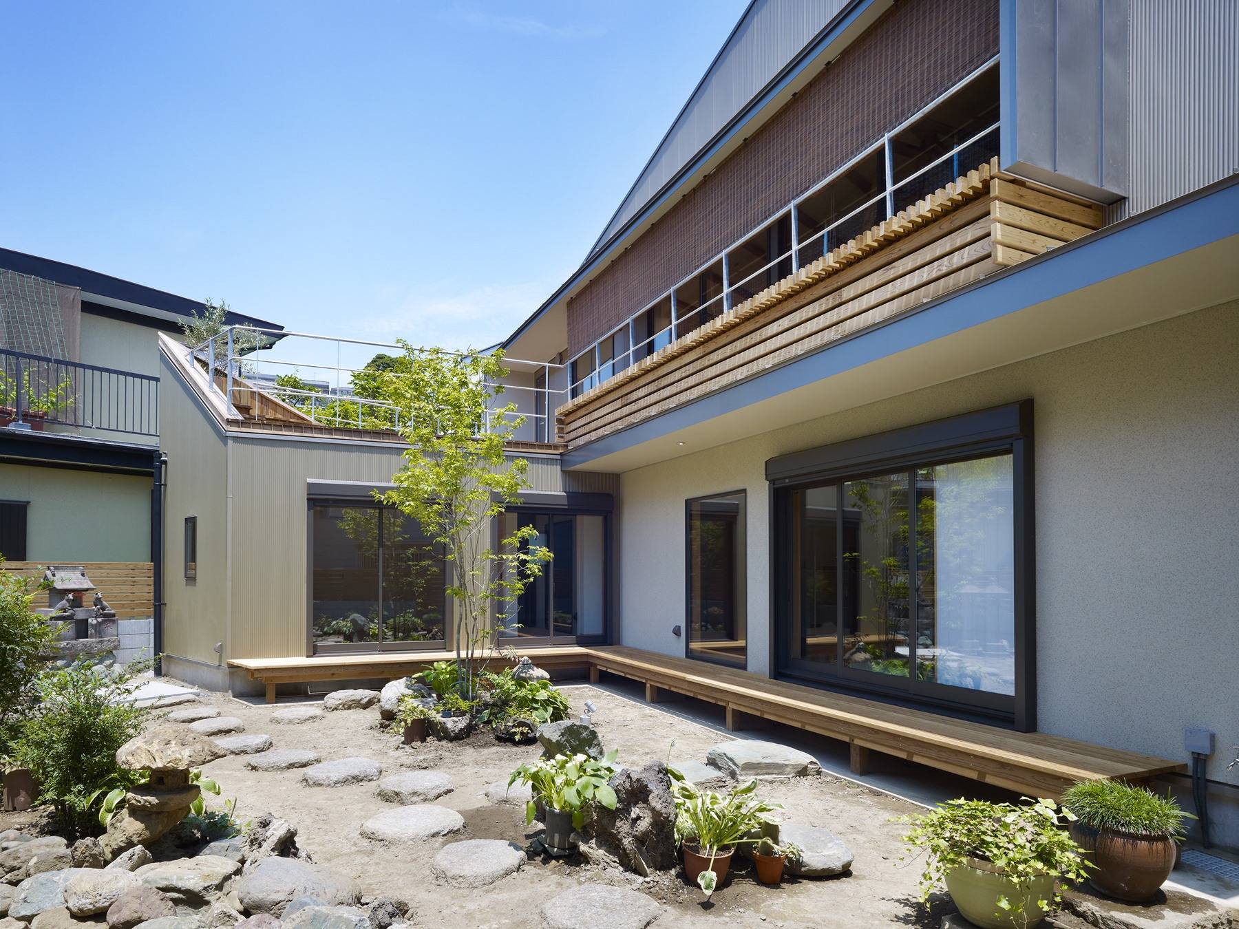 旗竿型の変形敷地を活かした建物配置によって、表の桜並木に面したアプローチと南側のプライベートガーデンという二つの屋外空間を生み出しています。