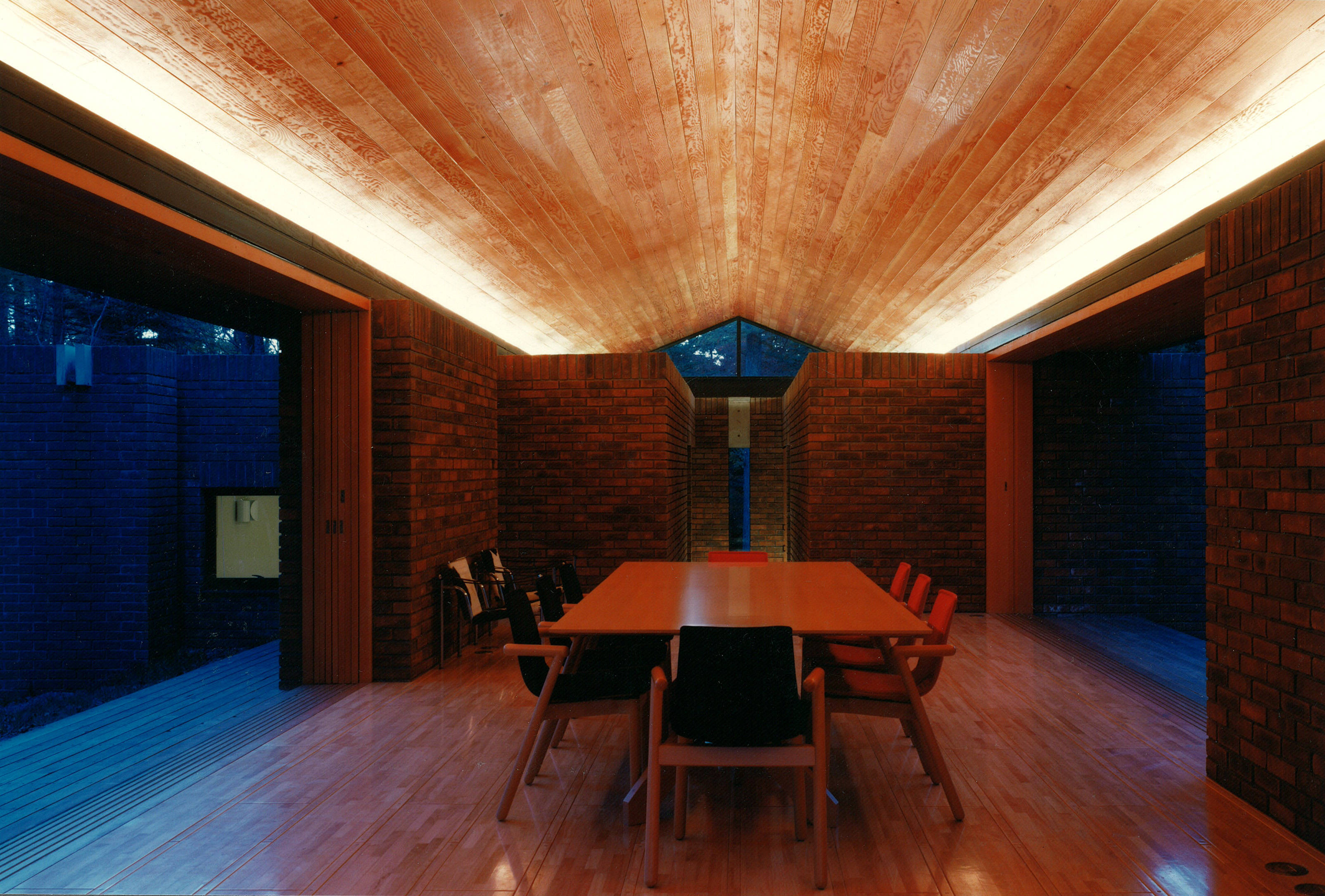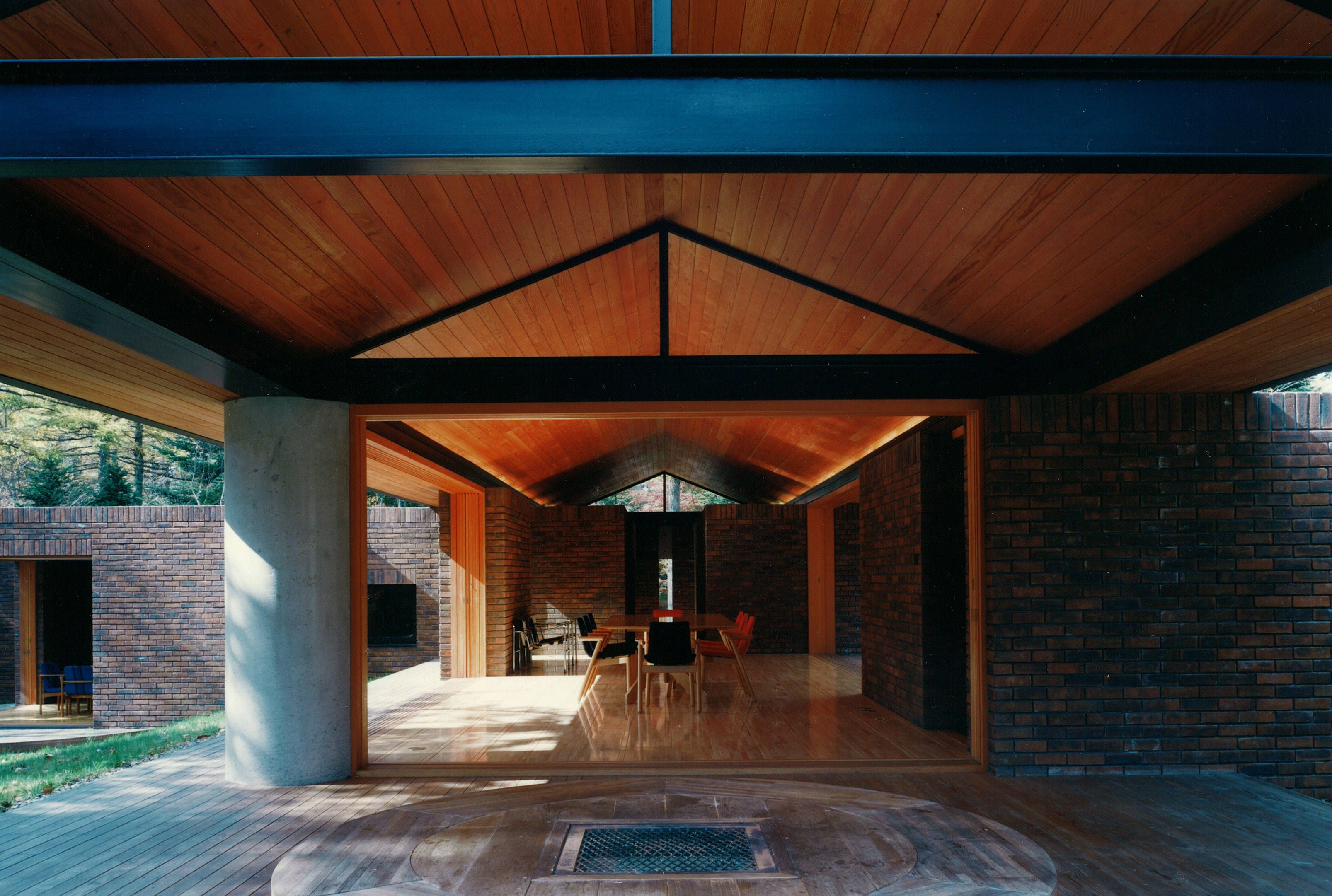 軽井沢、南が丘の別荘。3方向が完全に開放でき、LDK、テラスが自然と一体になります。