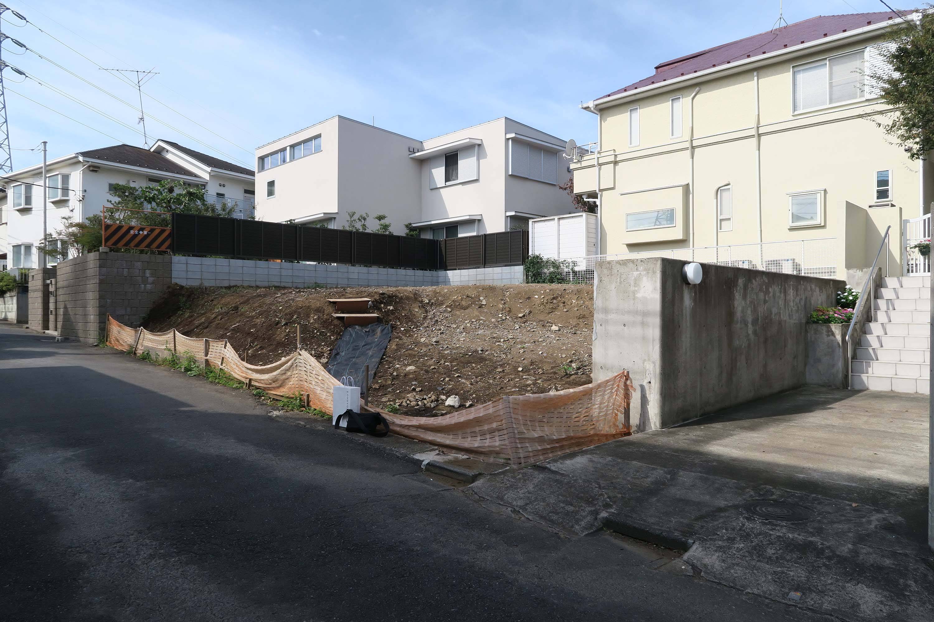 敷地は道路から1層分ほどの高台であり、閑静な住宅地に位置する。周囲は送電線が通り、アパートが増えてきている。建蔽率40%、容積率80%の敷地にプライベート性の高い開放的な住宅が望まれた。