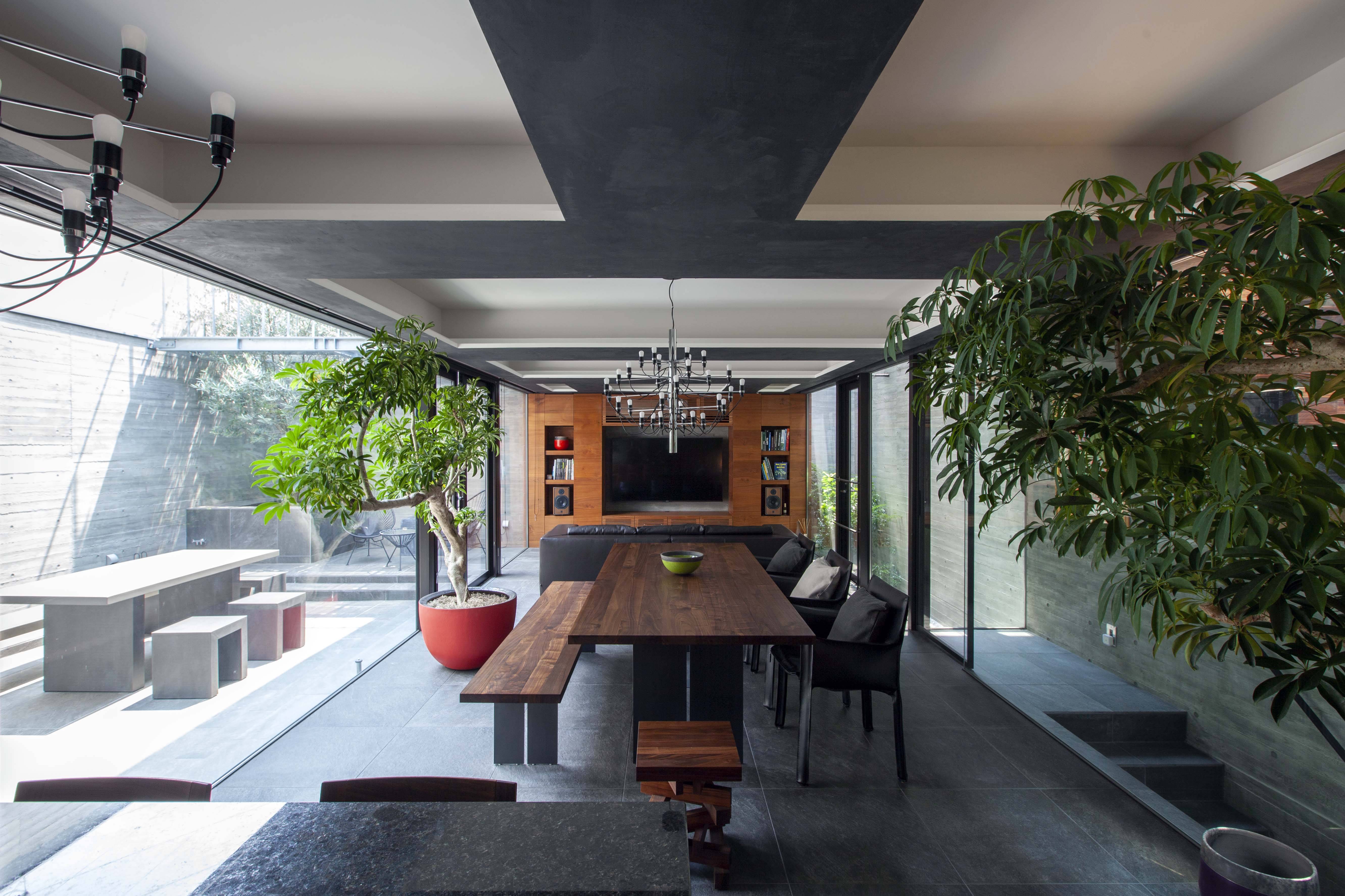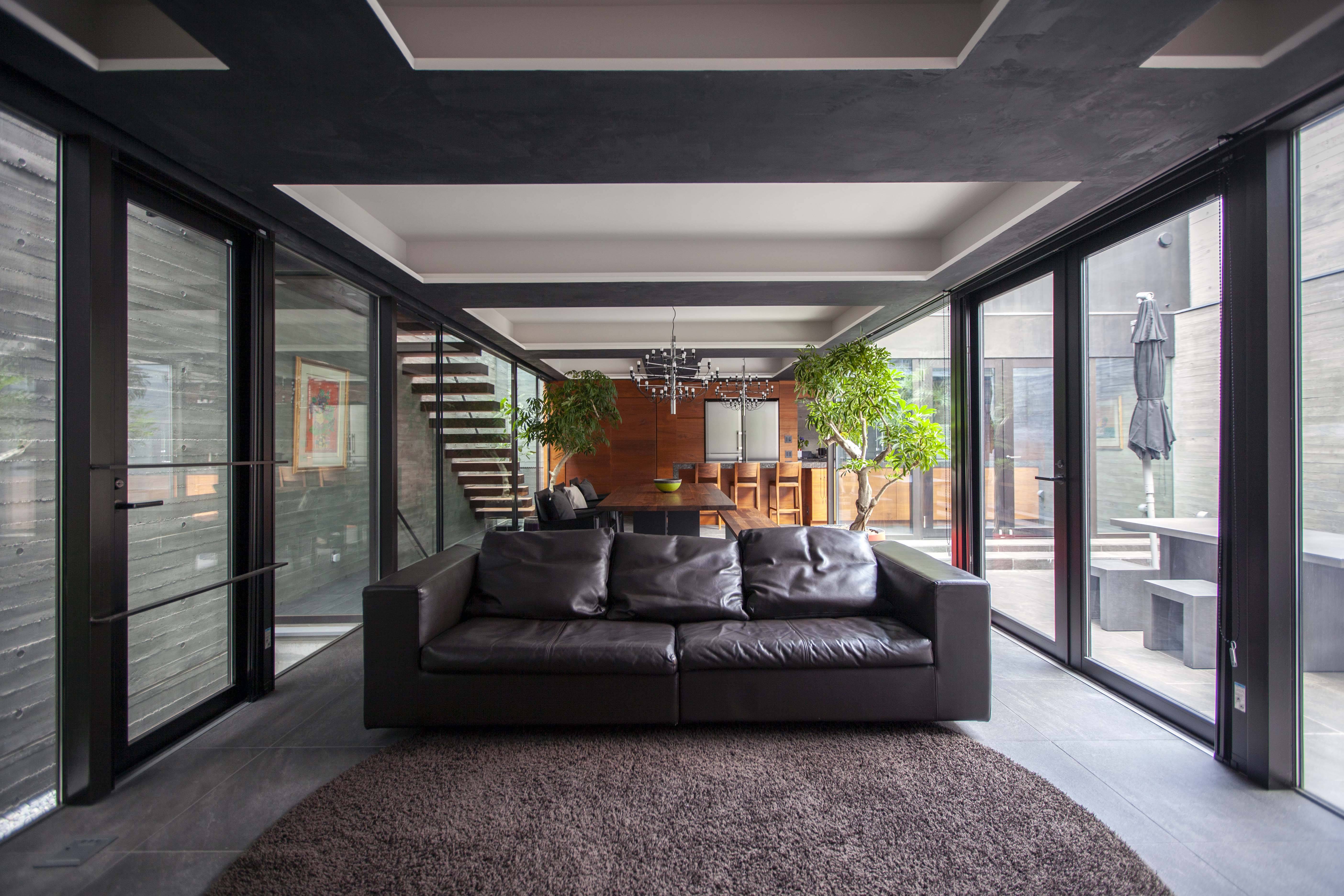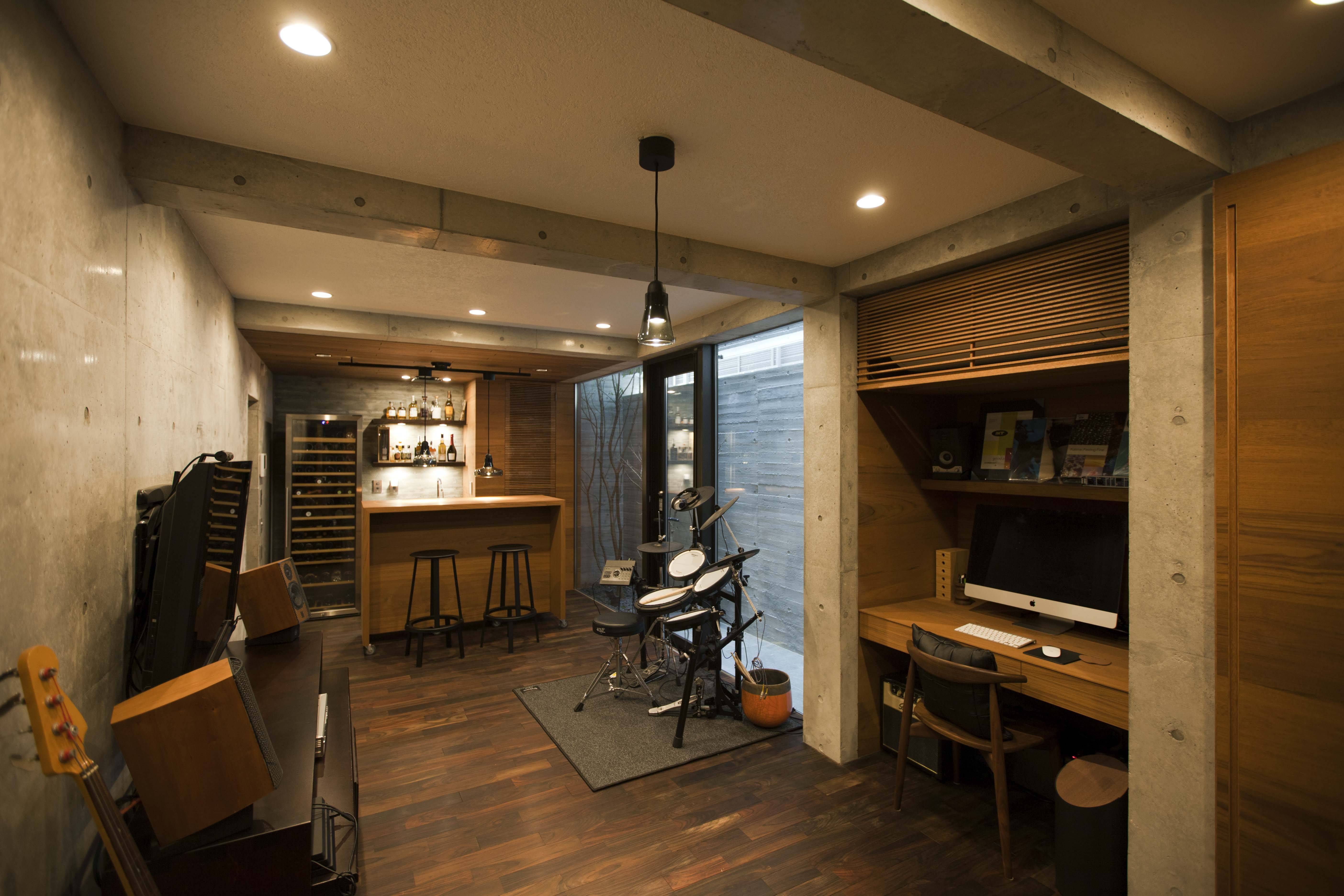 地下1階には2台分の駐車場、納戸、SIC、音楽室、客間としての和室を1つのヴォリュームとして配置し、それ以外はドライエリアとしており、居室や動線は上方へと立体的に連続するドライエリアや外部に面している。1階は建蔽率一杯のLDKとテラス、地下から連続する外部を配置しており、内外は全てガラスやサッシで仕切られ、内外が一体化した空間としている。2階は2つの寝室、プライベートリビング、洗面・脱衣室、浴室がL字のヴォリュームとして配置され、1階のLDK上部に浮いた格好で箱の内側に配置されている。