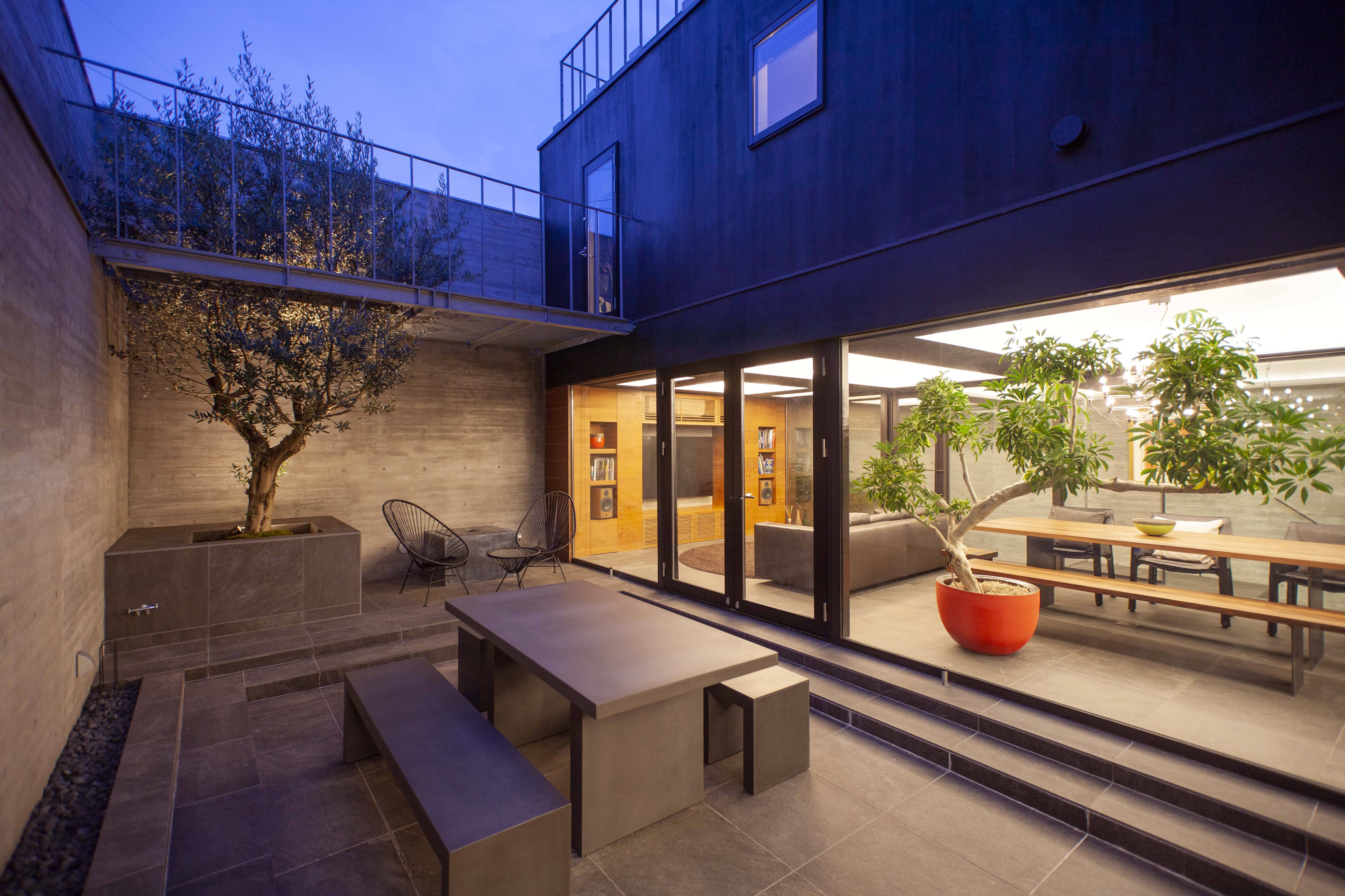 2階L字ヴォリュームの内側と外側は箱の外周壁から離れて空隙となり、1階テラス、地下ドライエリアと連続し、箱の外周壁が上方へ行くほど薄くなることと相乗して、箱の中に立体化された空隙は上空へと開いていく。