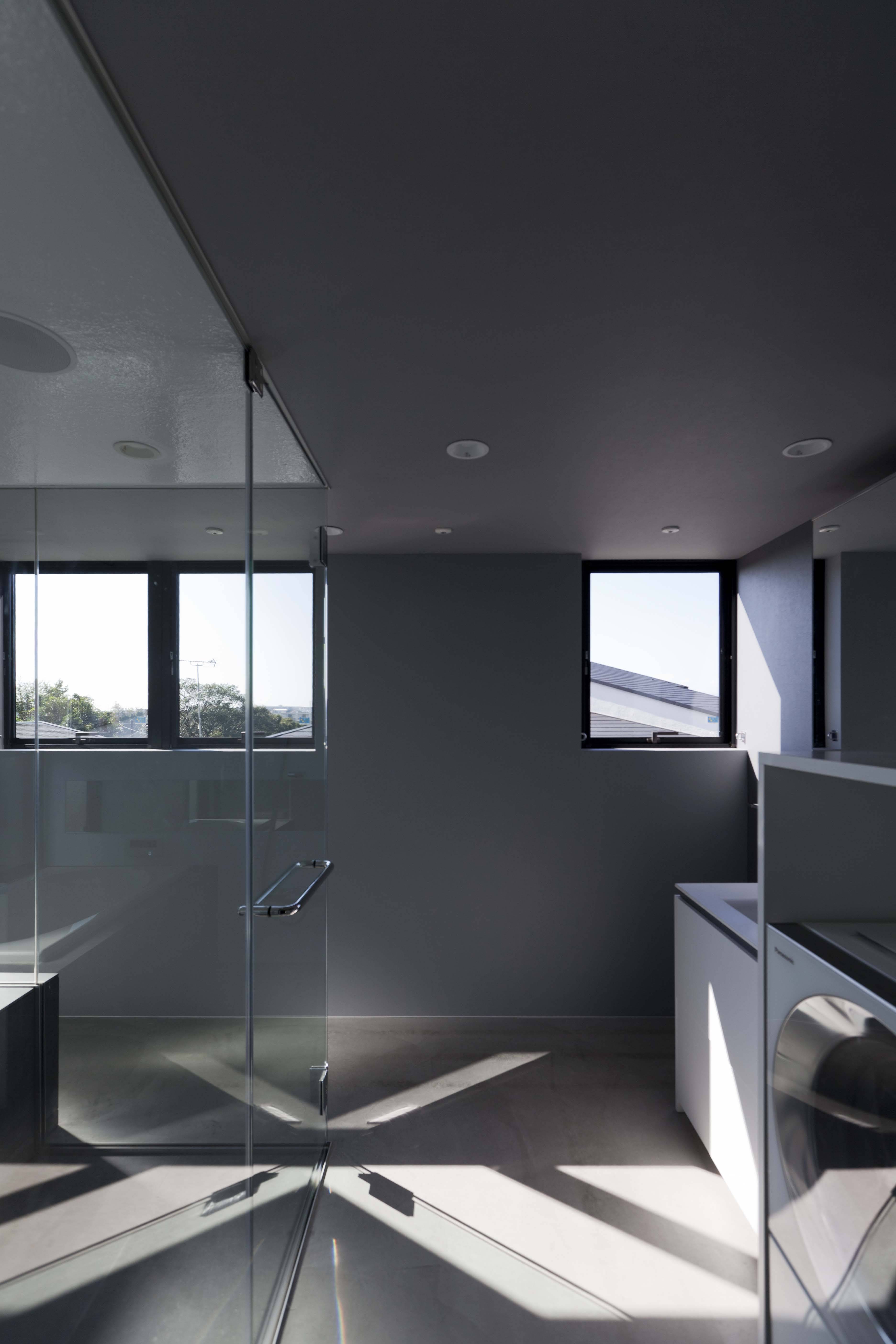 敷地下段にある隣家より上に窓を配置することで、光と眺望を室内に取り入れた浴室