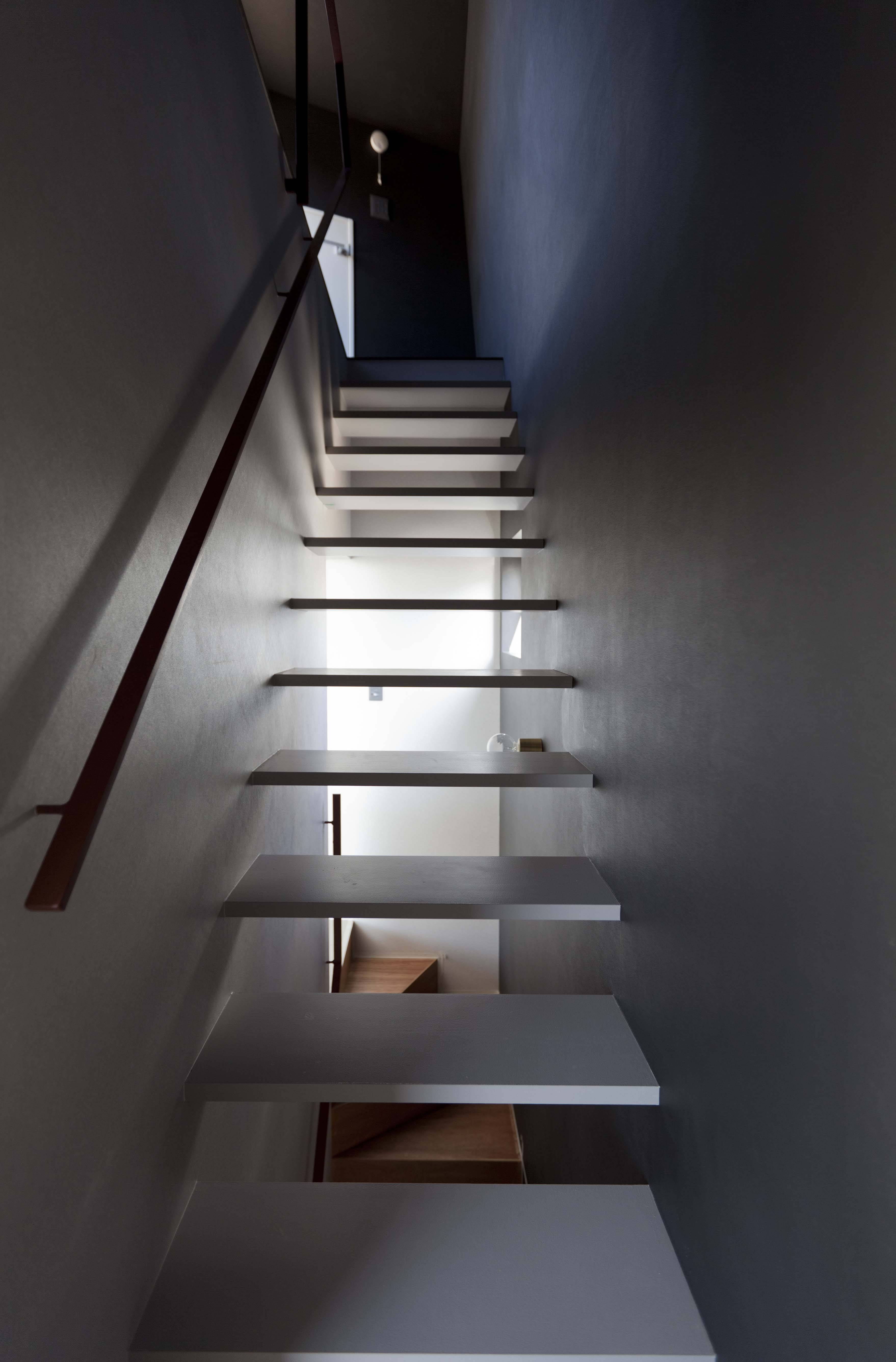 前面道路からは駐車場のパンチング鋼性床を通り、階段を降りて2F玄関にアクセスする