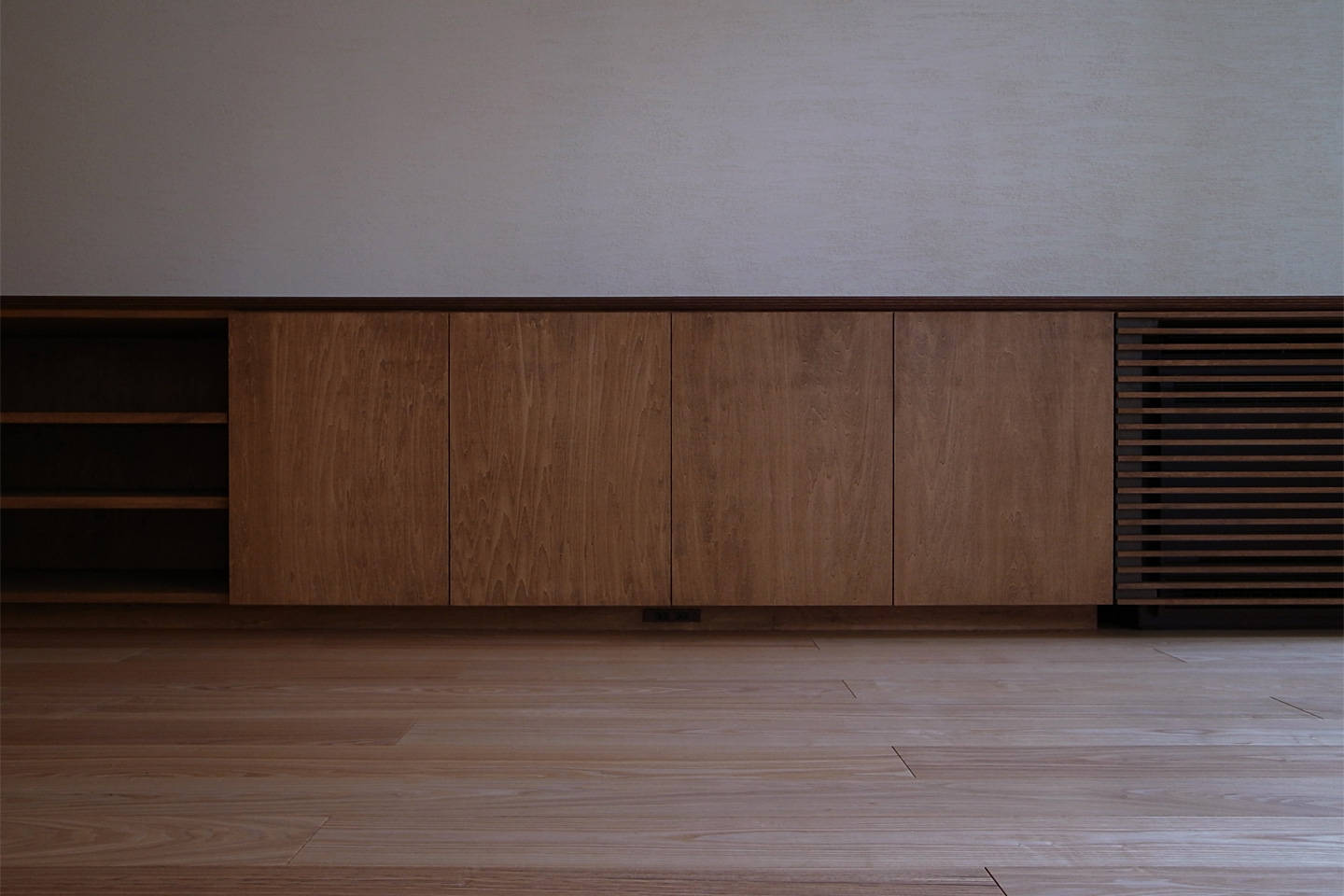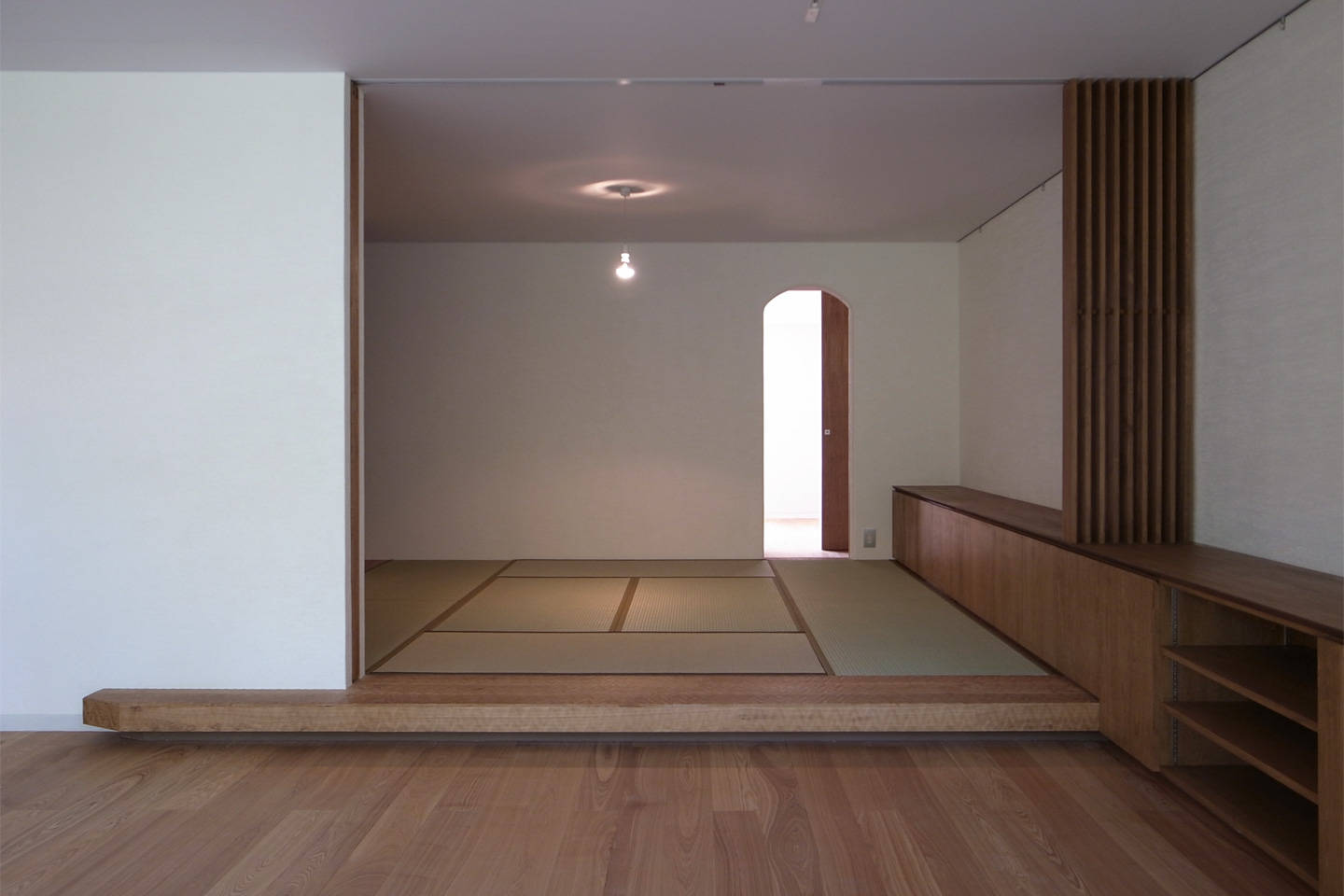 大きな引き戸と縦格子によってリビングルームと仕切られる和室や、回遊性のある動線が特徴です。