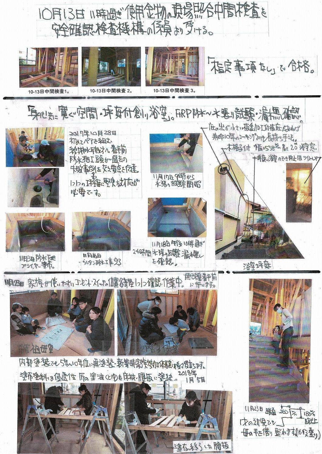 ■ 5 柱建て・梁組等上棟まで2日間立会い。中間検査立会い。FRP防水水張り試験・コンセント位置の確認立会い。