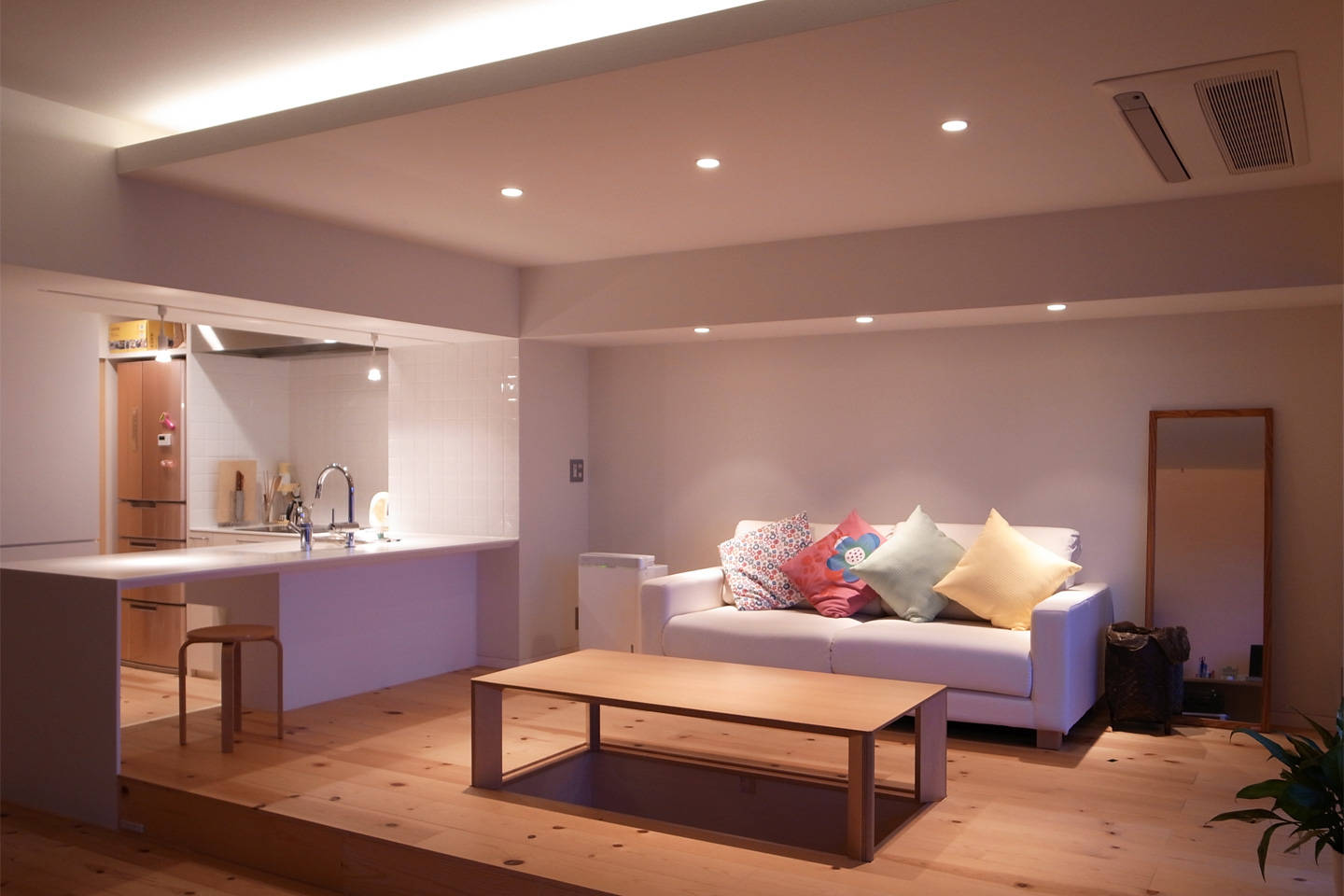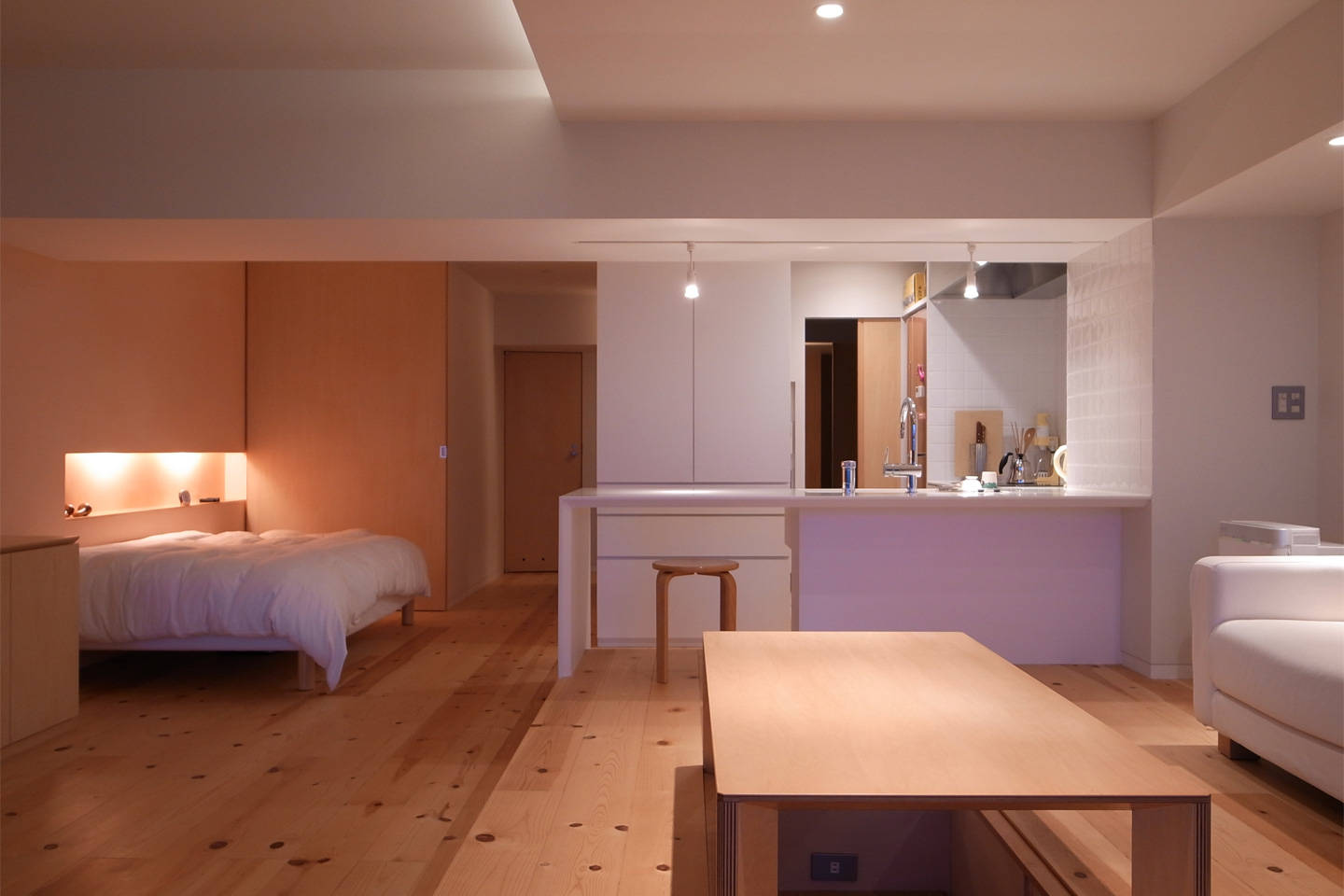 パイン材の床と紙の壁、サーモンピンクの漆喰による胎内にいるような優しい空間には、景色の眺めやすさも考慮して床を一部上げて掘りごたつも完備。
