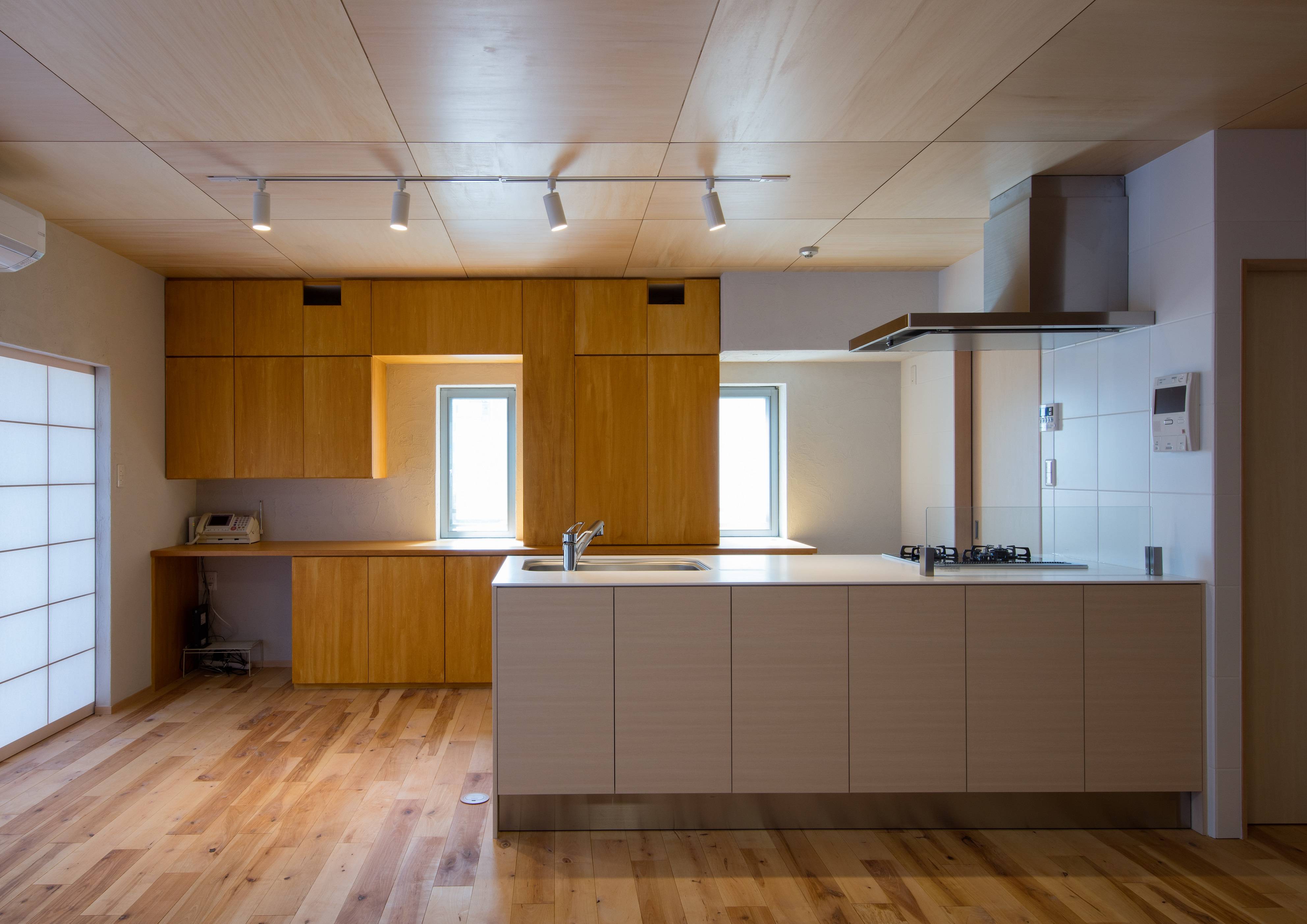 ・明るく開放的なキッチンユニットにつくり替え、ポットやミキサー、炊飯器等も収納できる造り付けの食器棚も併せて提案しました。