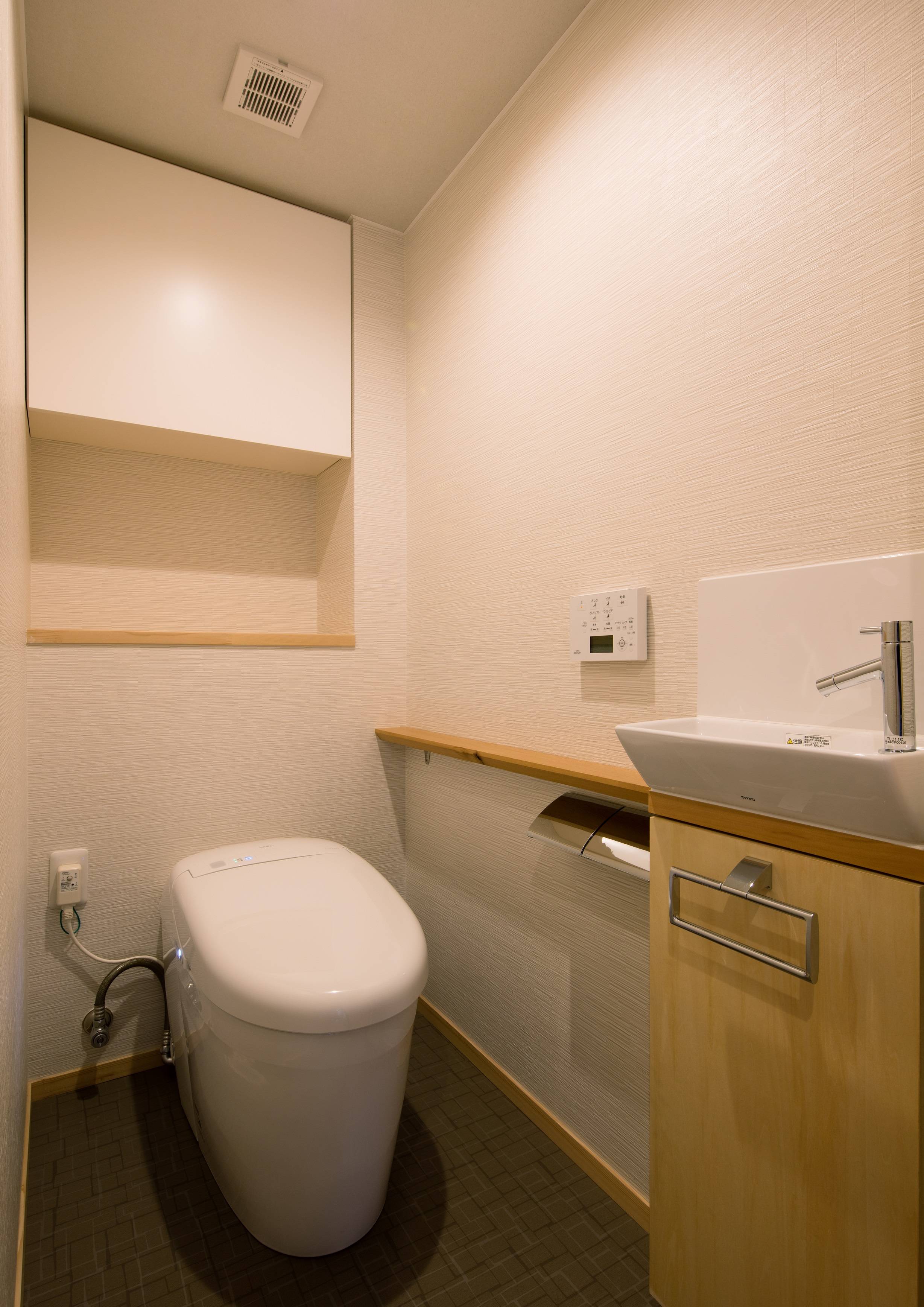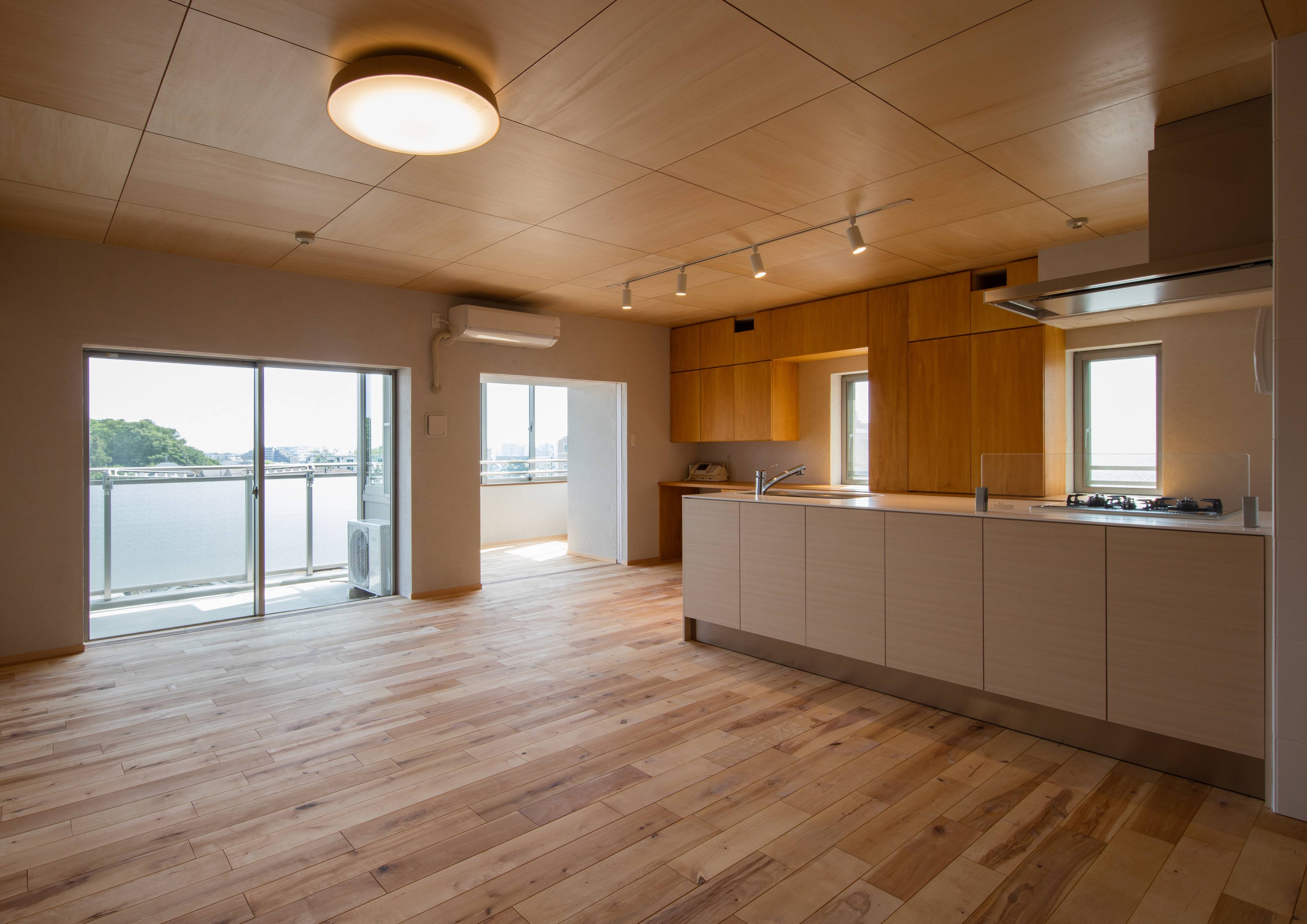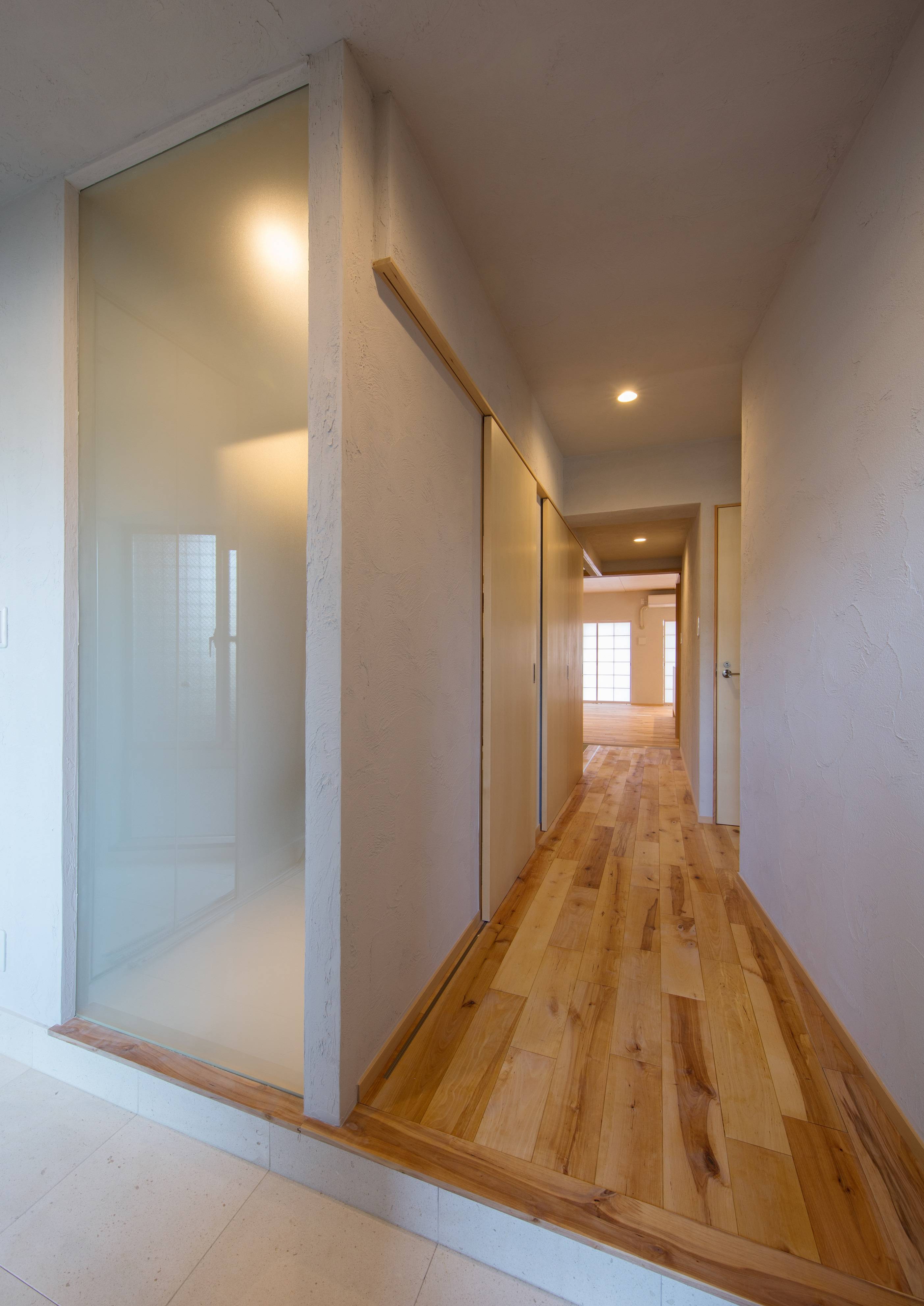 ・床には建築主の出身地ということもあり、北海道産シラカバの無垢のフローリングを張り、壁はシラスの珪藻土を塗ることで、マンションでありながら調湿機能が高く、気持ちの良い住まいをつくりました。