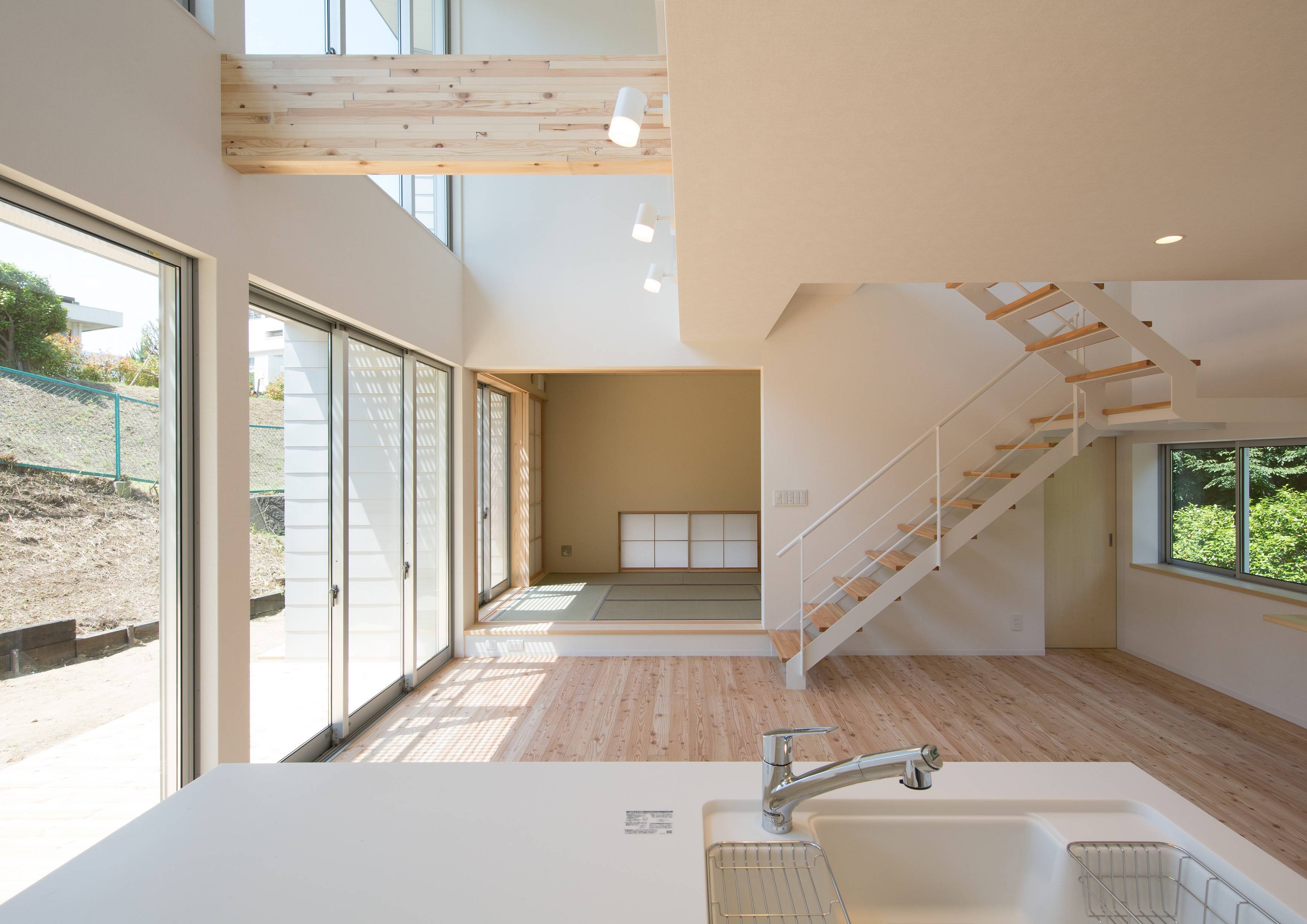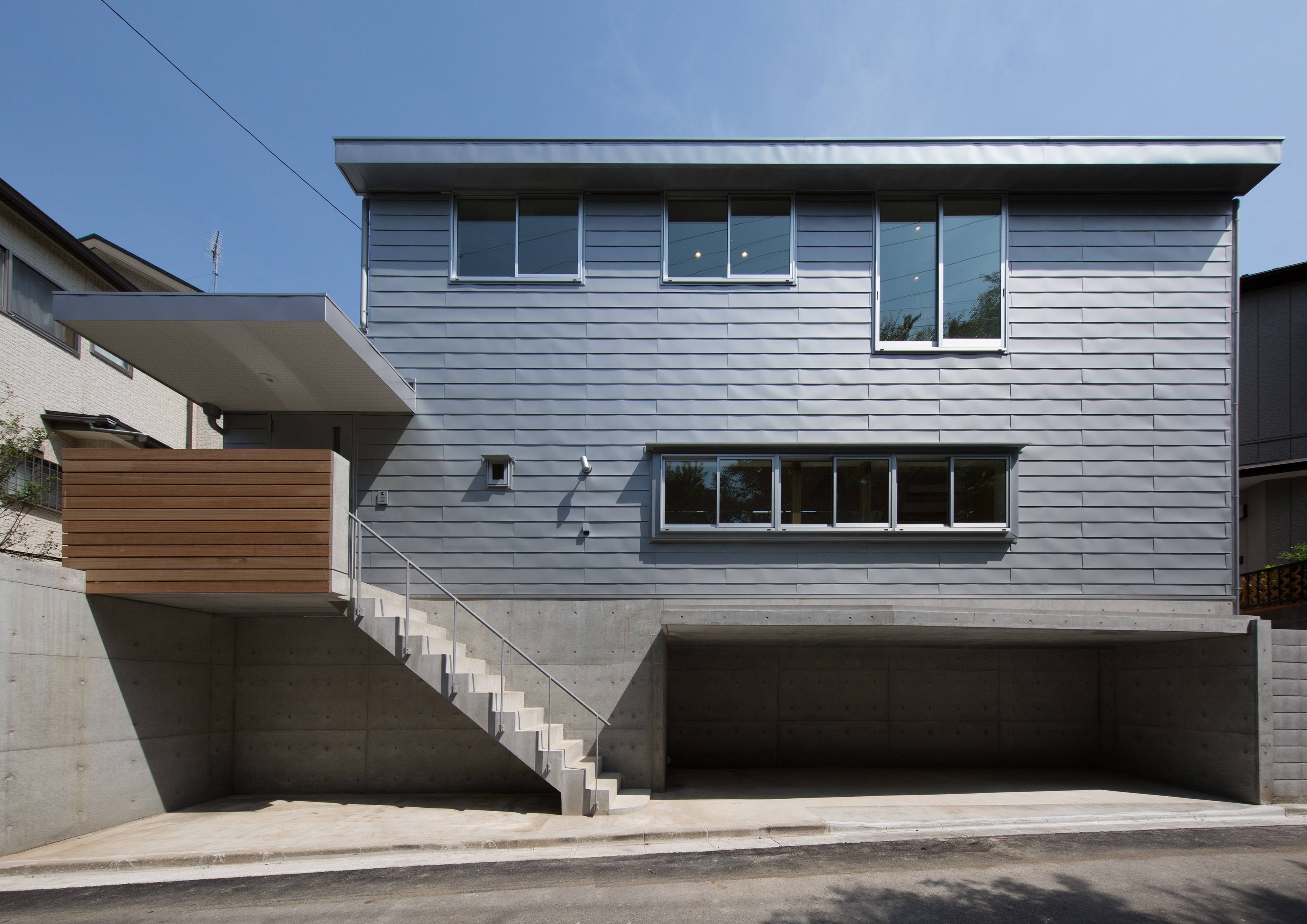・敷地の高低差を生かしながら、半地下のガレージ、アプローチ階段、1階、2階のプランを合理的かつ機能的に考慮して南側のプライベートな庭をつくり出しました。