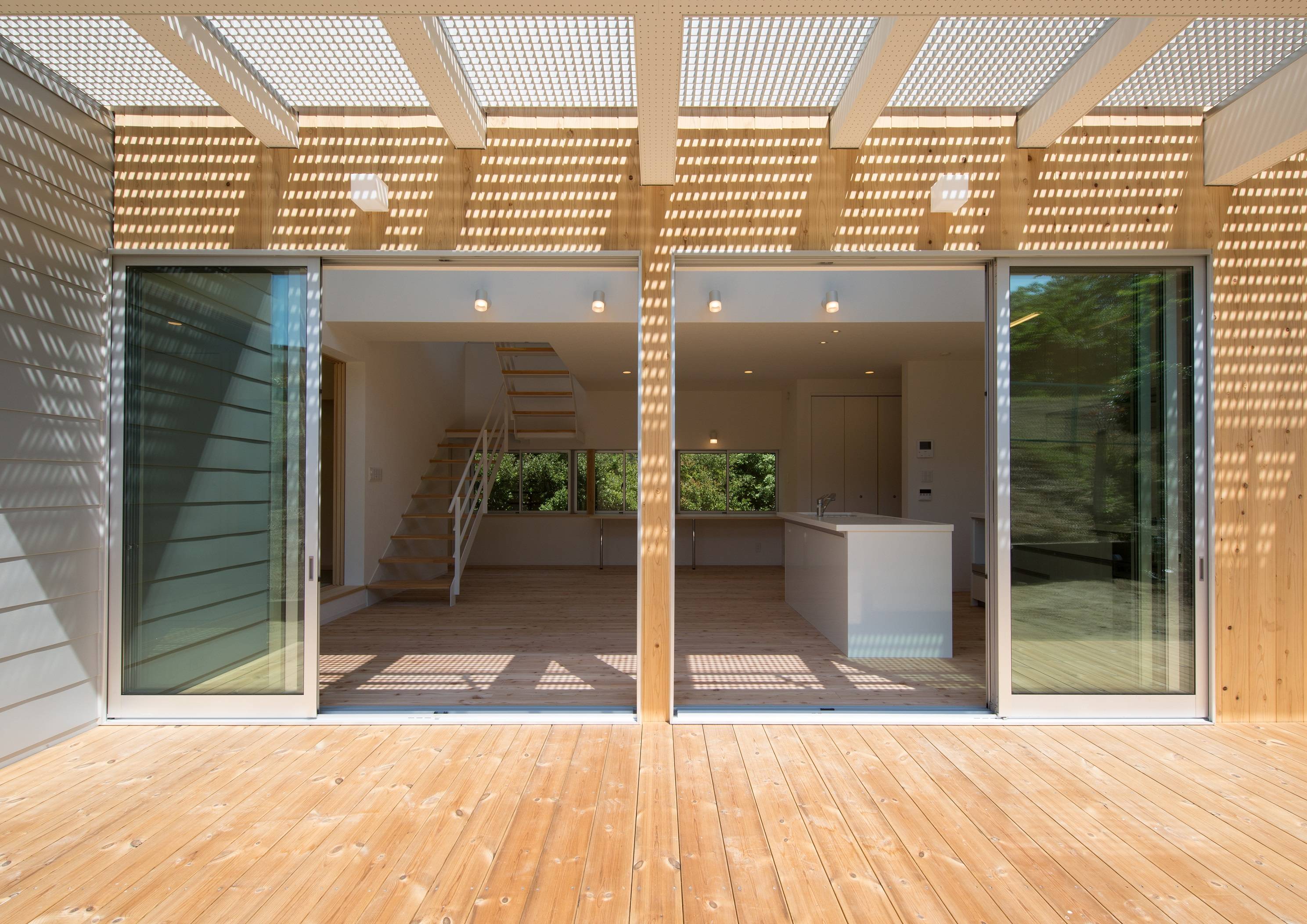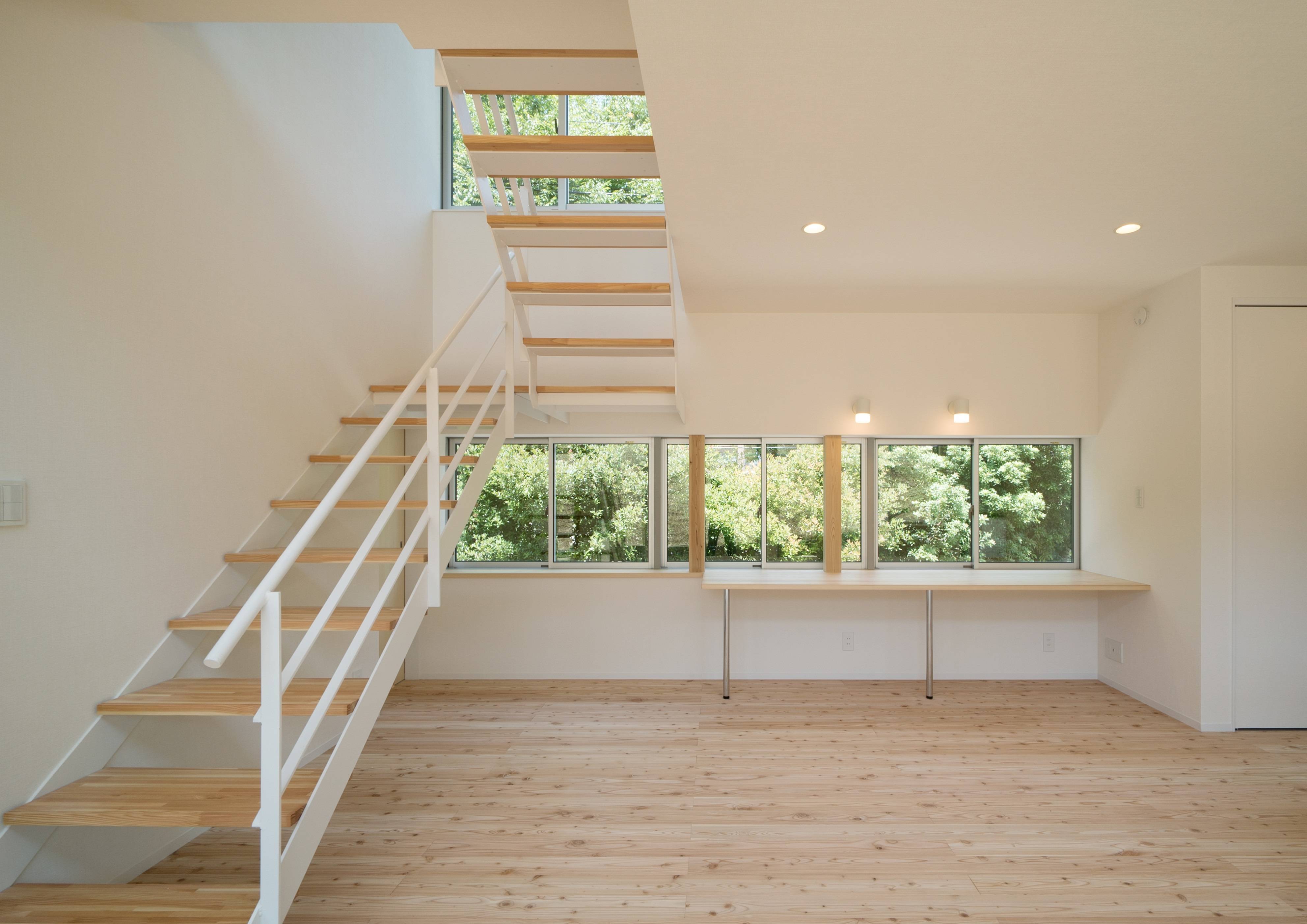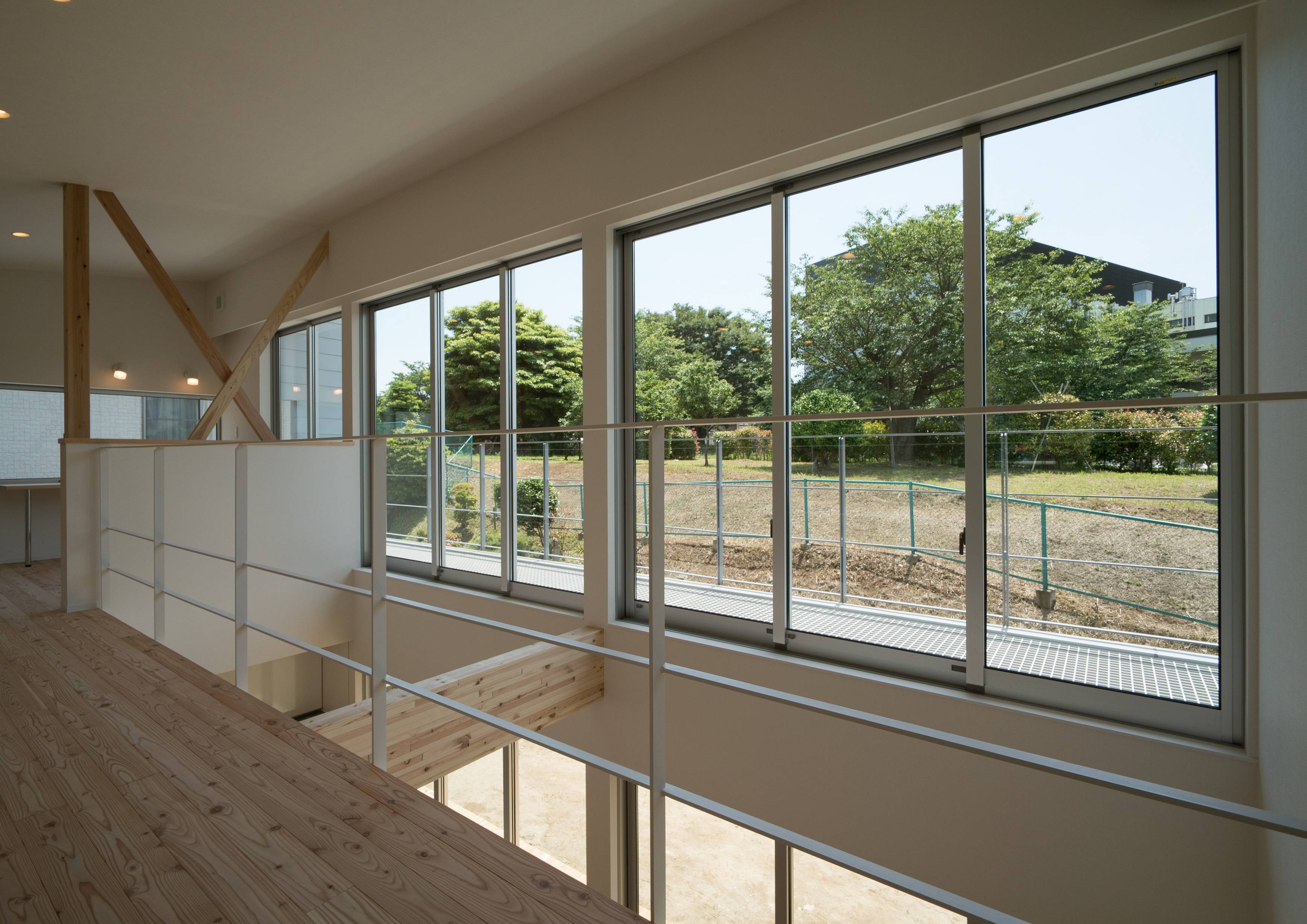 ・北側の道路側には市の公園があり、常緑の樹木がその先の視線を遮る為、プライバシーを守りつつ樹木の緑を室内に取り込む空間構成を考えました。