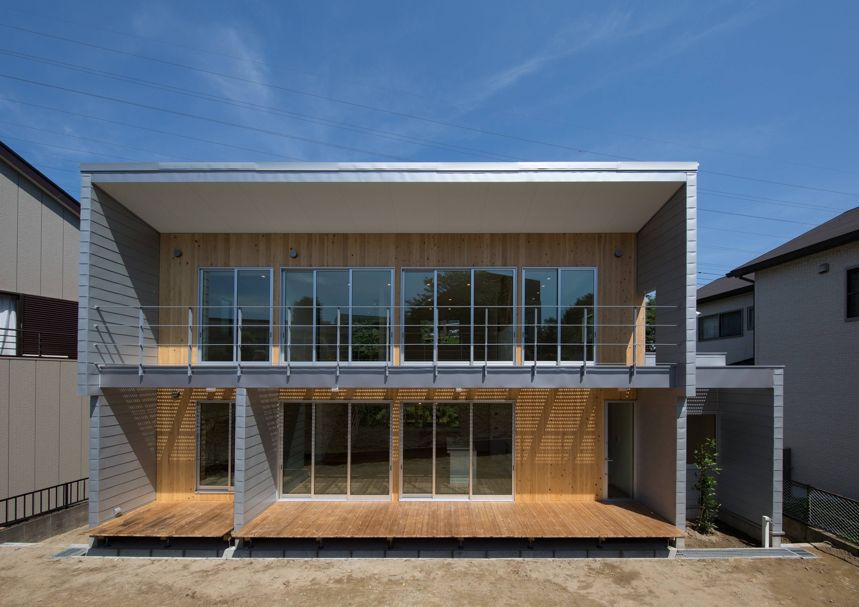 ・北側立面は、連続窓や庇、ガルバリウム鋼板を横使いした外壁などで水平ラインを強調し、北側道路面からの高さを押さえ、ヒューマンスケールで、スッキリとした外観にしました。