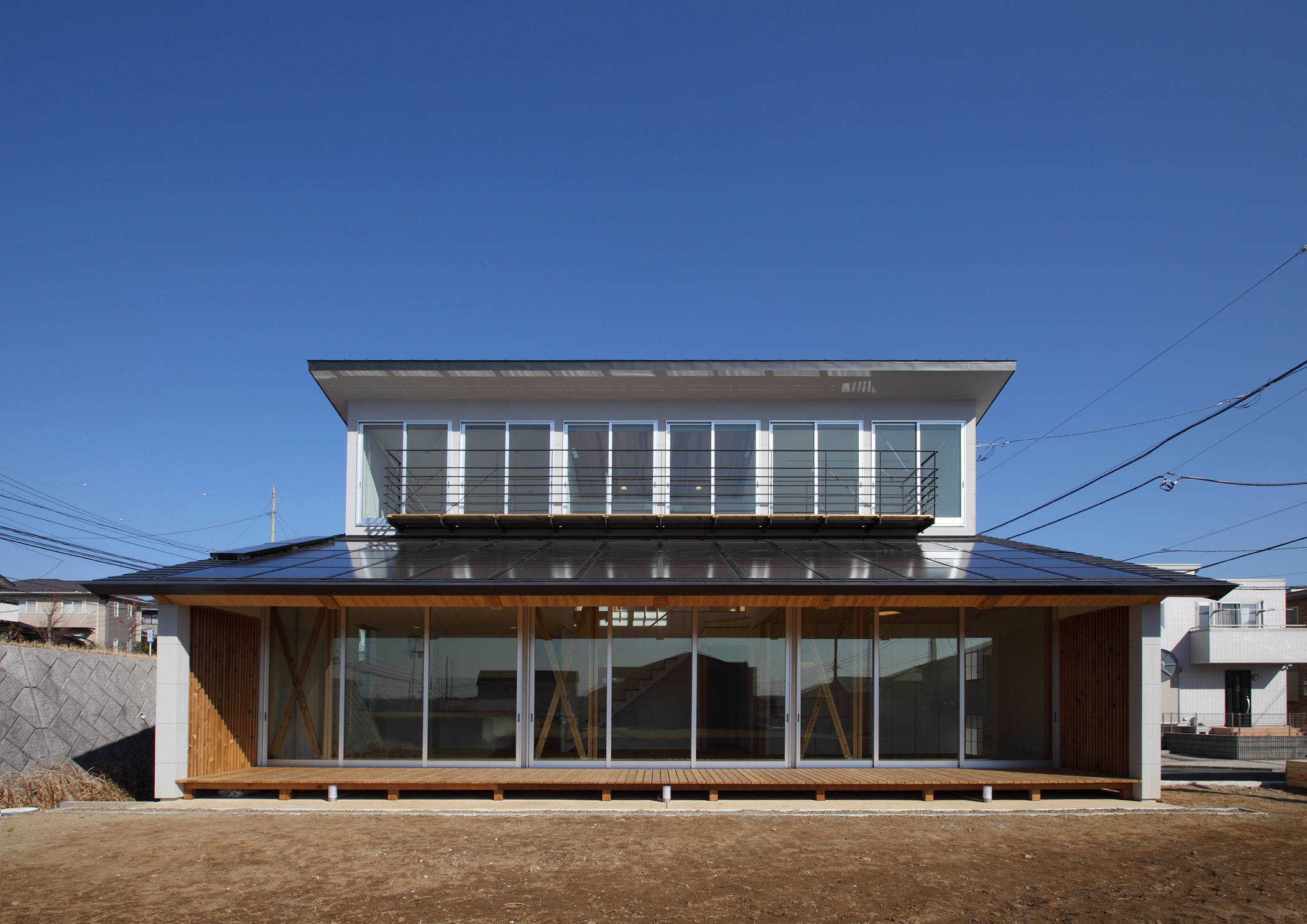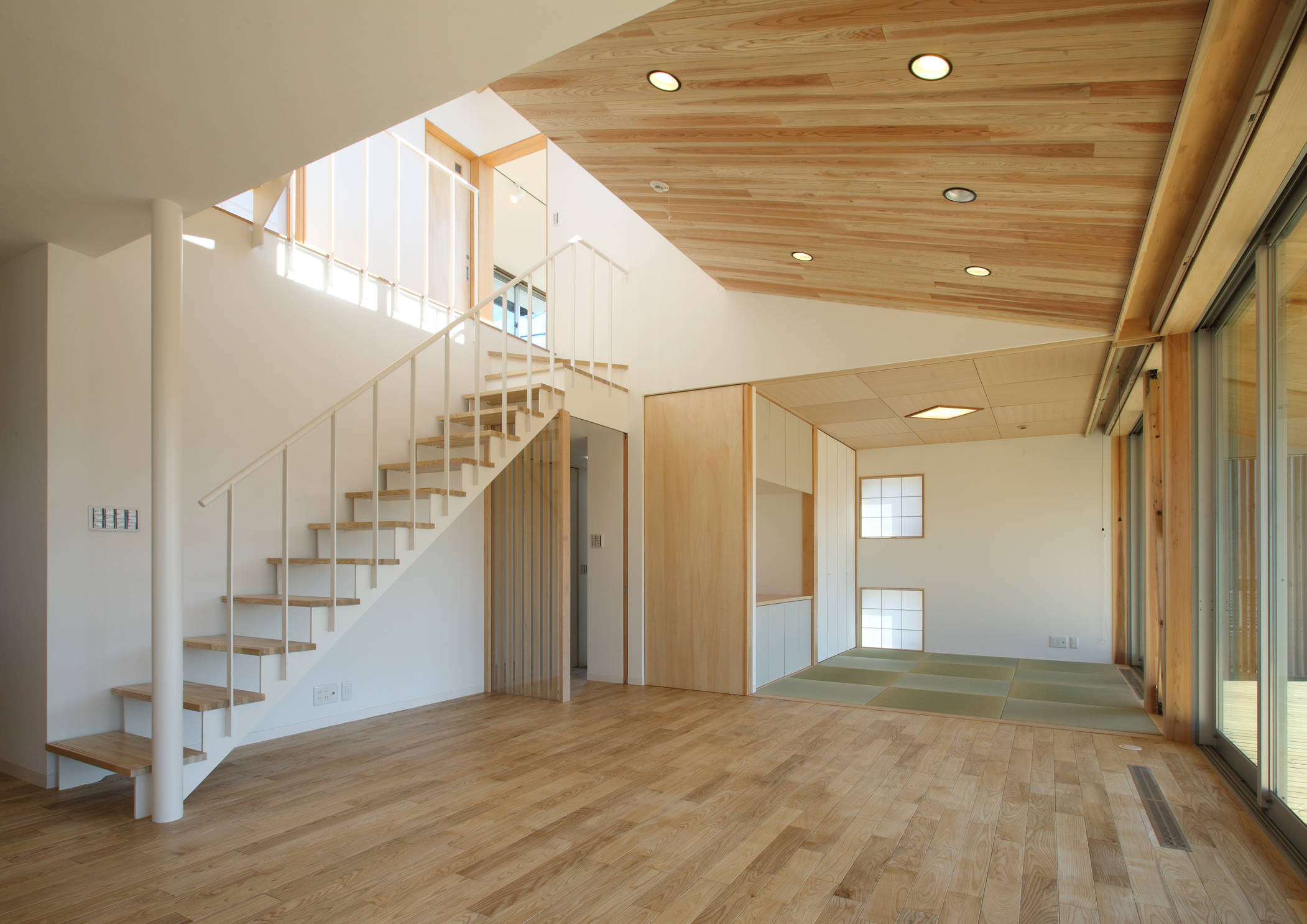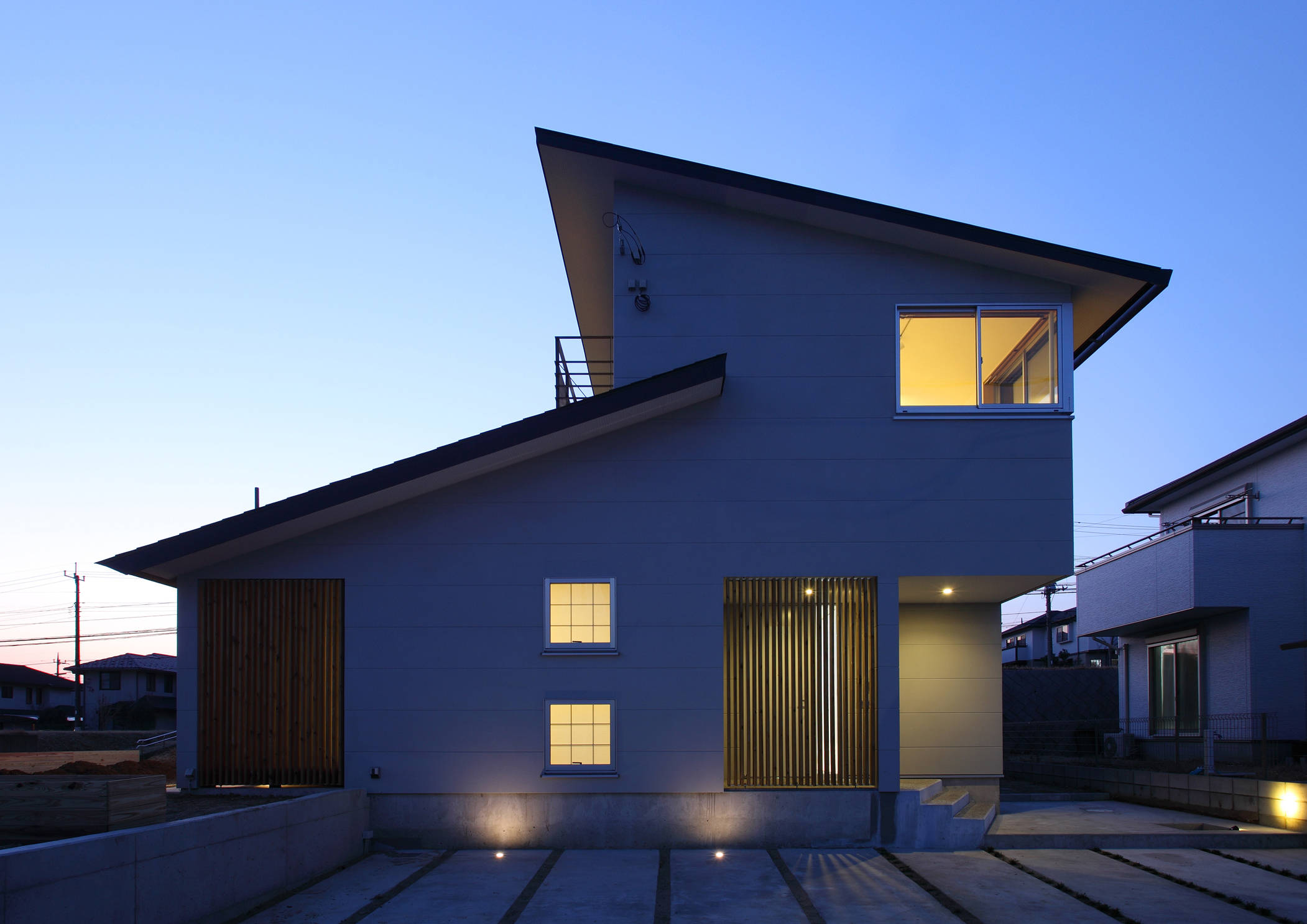太陽光パネルを設置することを考慮のうえで、屋根の形状を検討しました。屋根勾配が大きく外観の雰囲気が重くなりがちですが、和風のイメージを持つ大きな勾配天井でありながら、軽快で明るくモダンなデザインを提案しました。