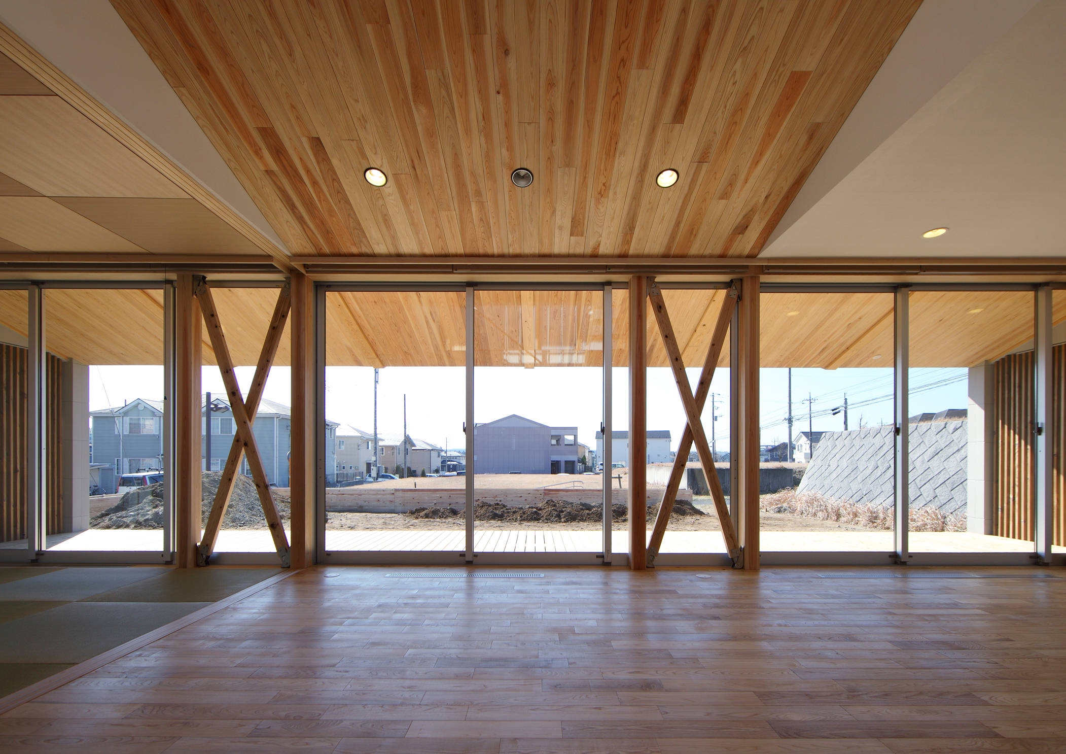 建物を北東側に配置し、南側を大きく空けることで、市道(遊歩道)を含めた広い外部空間をつくり出しました。また、北東側には駐車スペースを兼ねた広いアプローチ空間にしています。