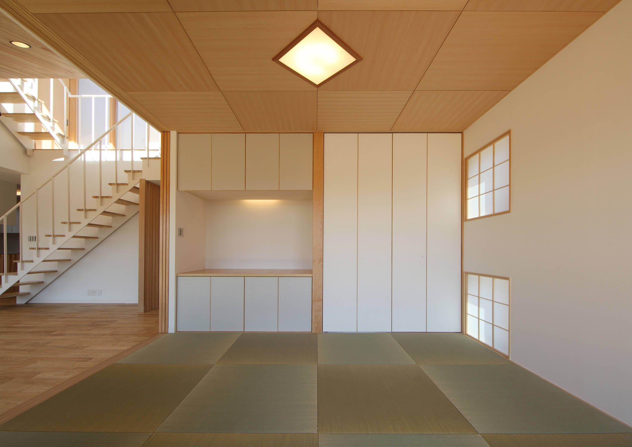 縁側状のテラスや縦格子、杉板張りの天井など、光の入れ方や色彩計画によって和のテイストを持ったモダンな空間をつくりました。