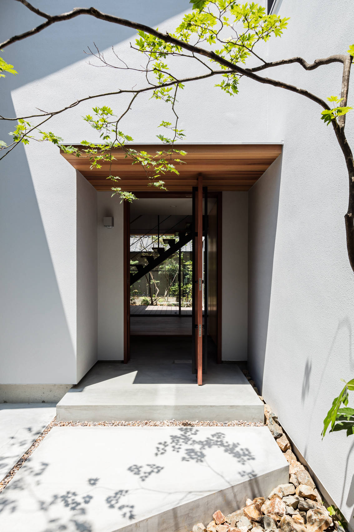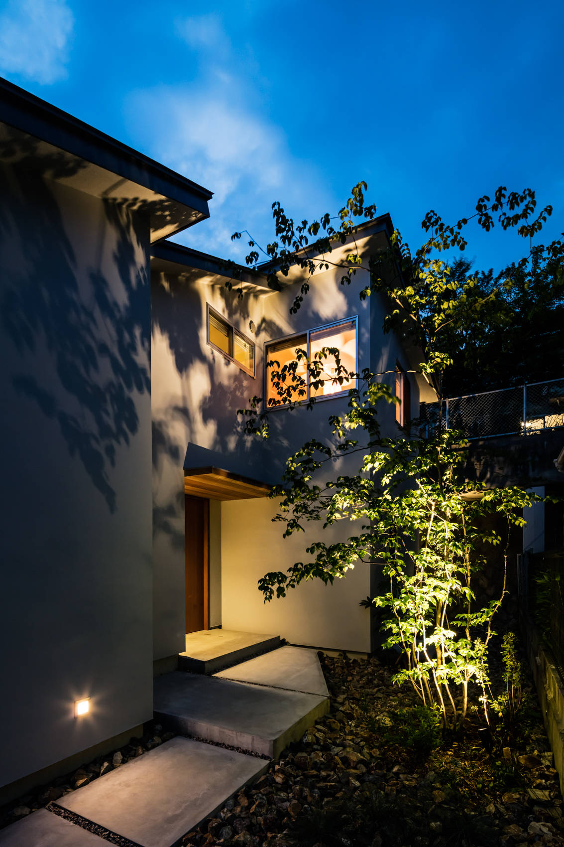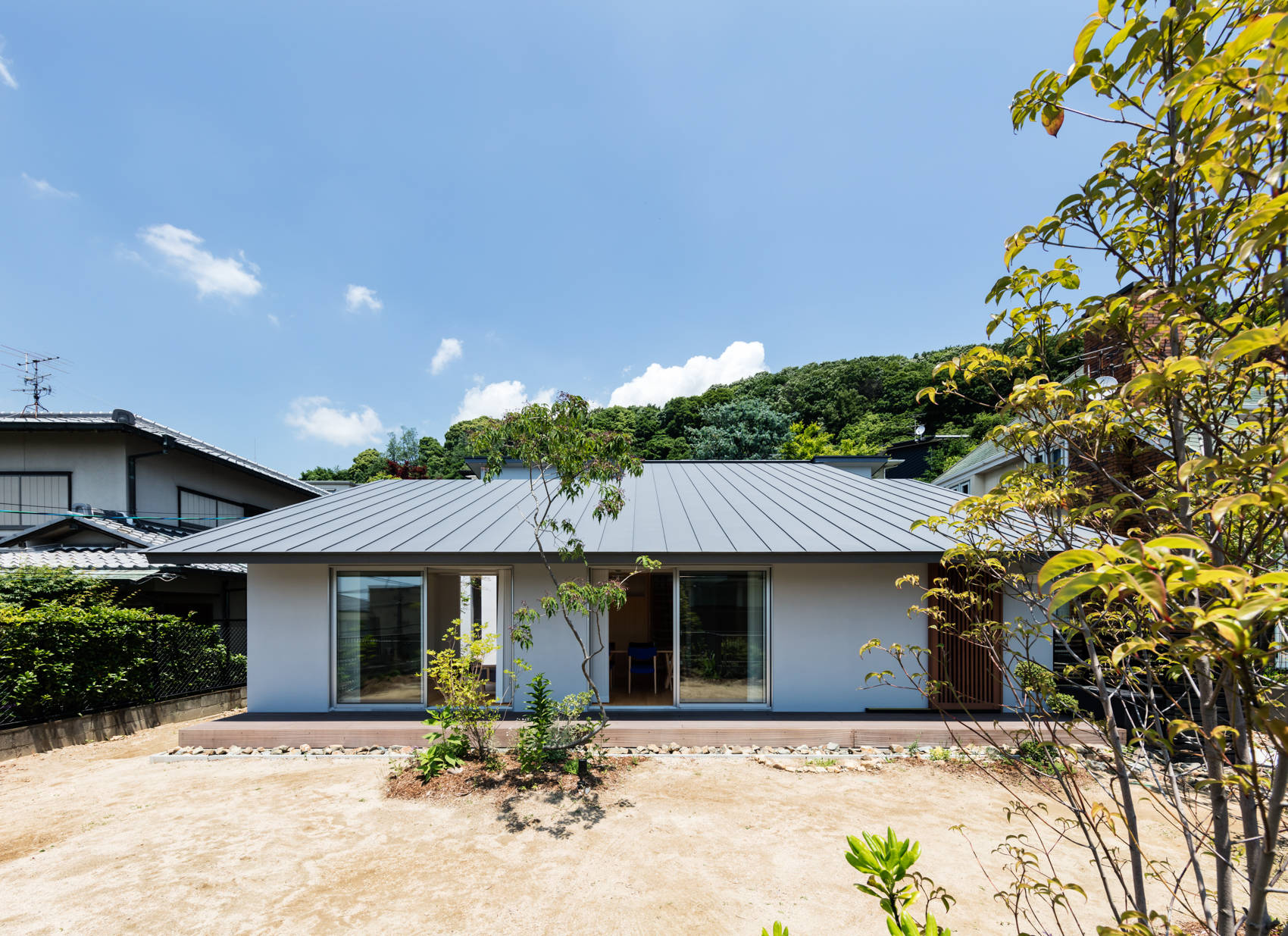 敷地は神戸の山手、高級住宅街に位置します。建物の屋根は六甲山の稜線に沿うように架けられ、佇むように敷地に置かれた住宅です。家族が集まるリビングは広い南の庭と中庭のテラスに挟まれ沢山の光が降り注ぎます。敷地のあちらこちらに散りばめられた植栽の成長が楽しみな住宅になりました。