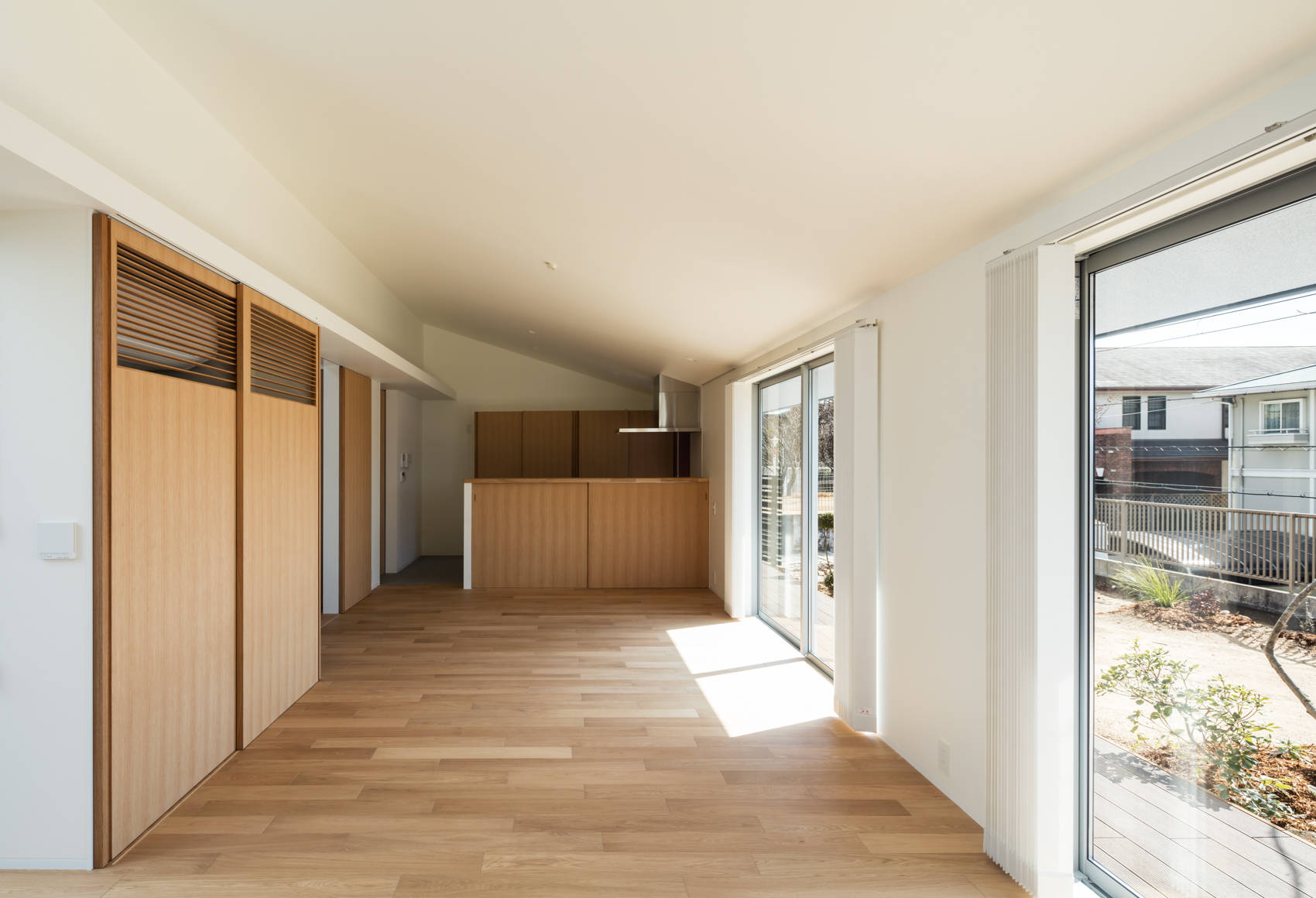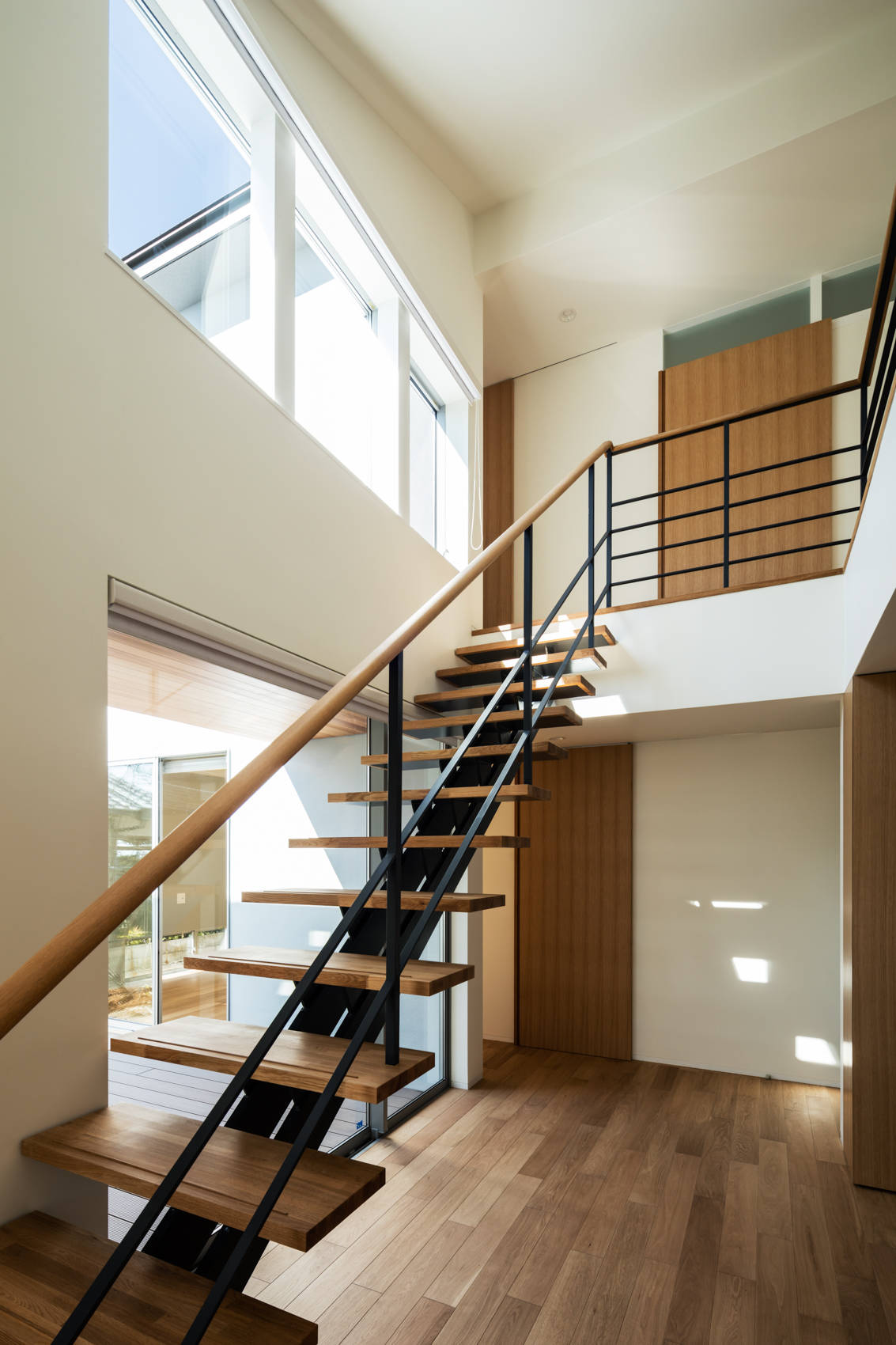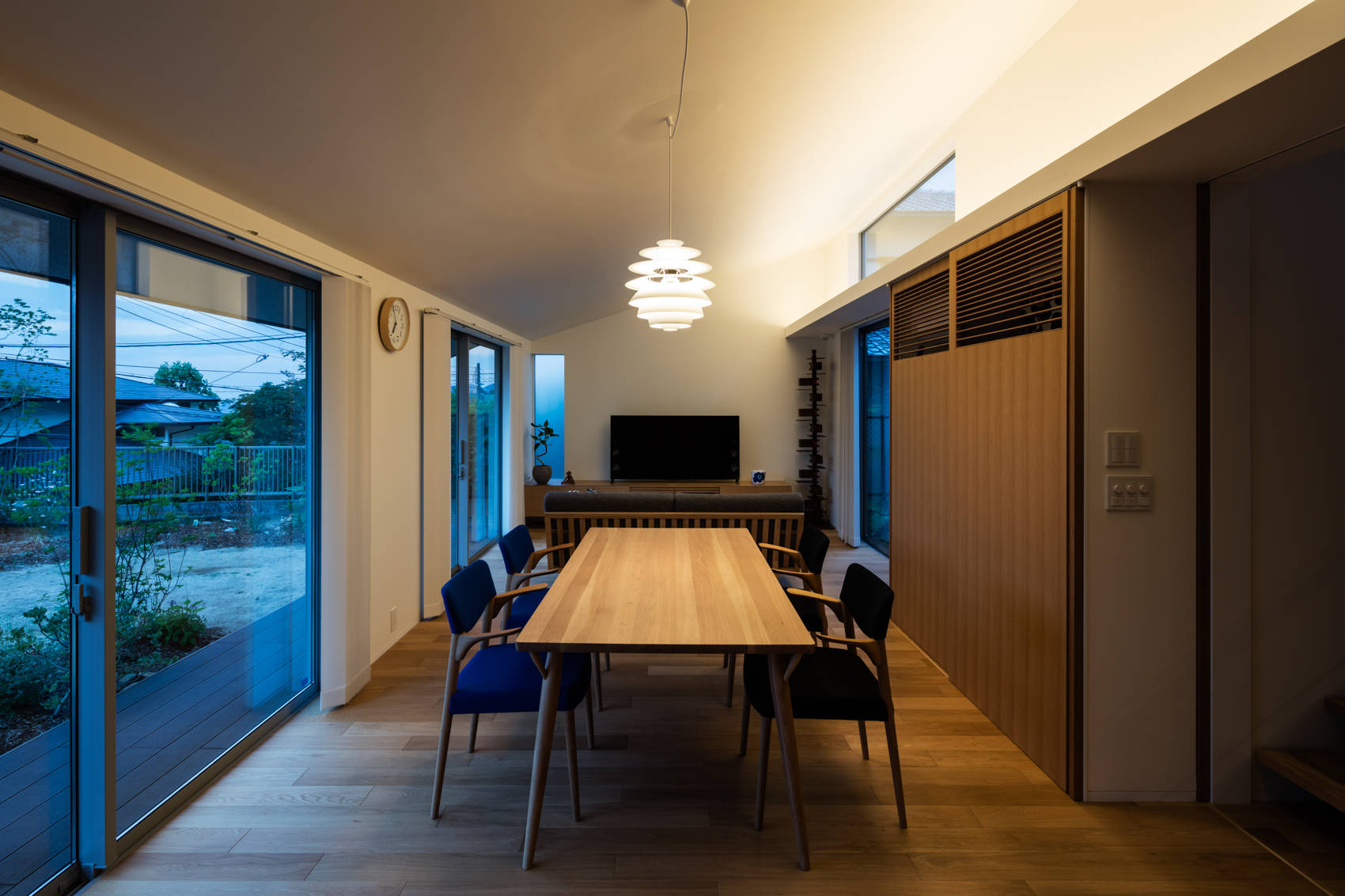 敷地は神戸の山手、高級住宅街に位置します。建物の屋根は六甲山の稜線に沿うように架けられ、佇むように敷地に置かれた住宅です。家族が集まるリビングは広い南の庭と中庭のテラスに挟まれ沢山の光が降り注ぎます。敷地のあちらこちらに散りばめられた植栽の成長が楽しみな住宅になりました。