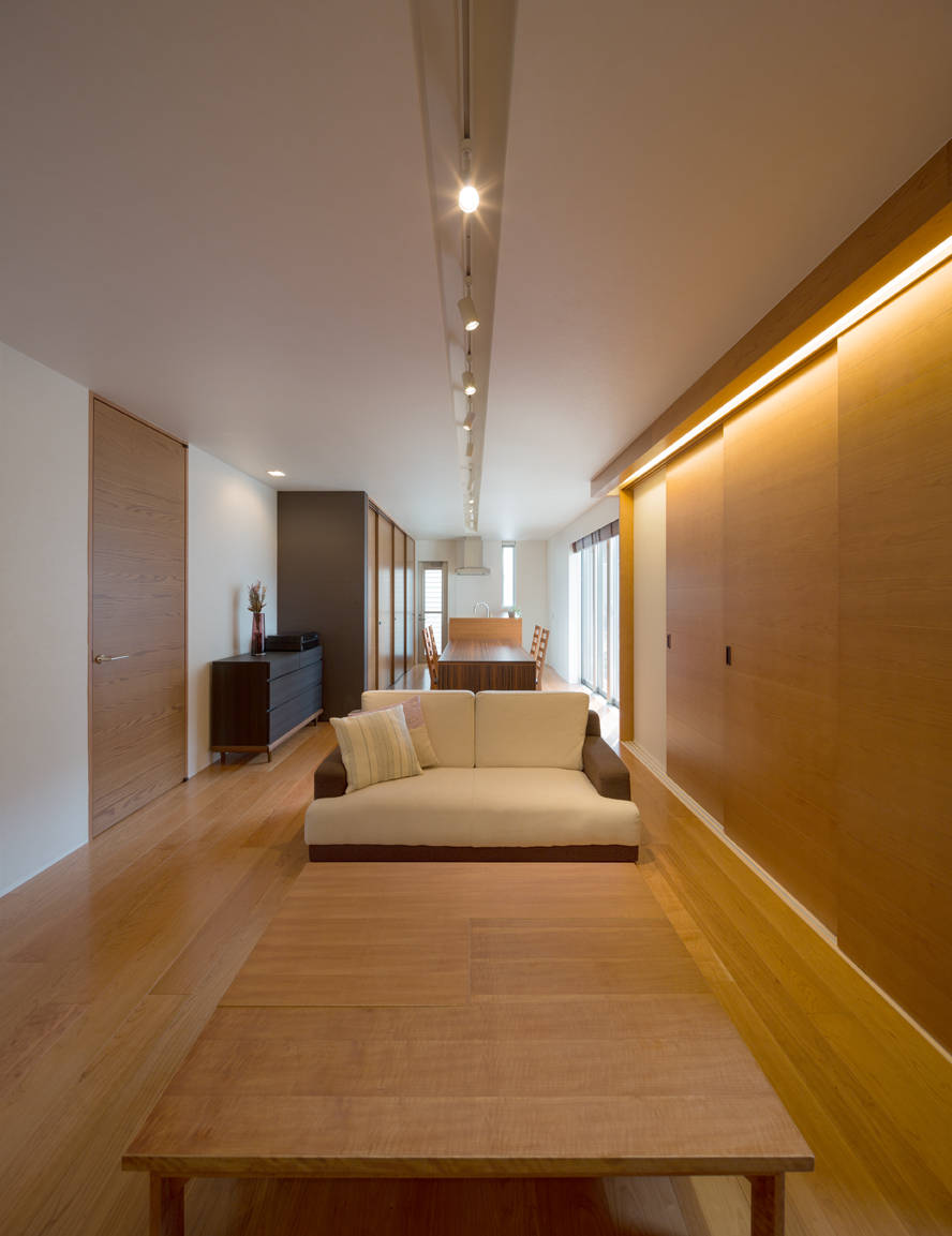 キッチンは冷蔵庫や食器棚はキッチンの後ろのクローゼットの中に隠せて生活感の無いスッキリしたキッチン・ダイニングを造り出しています。天井の照明やエアコンは埋め込んで天井から飛び出すことをしないで視覚的な空間の広がりを考え設計して、スッキリして広がりのあるリビング・ダイニングを造り出しました。収納も各部屋に多く備えることによって、これからも増えてゆく荷物にも十分に対応できるようにしています。
