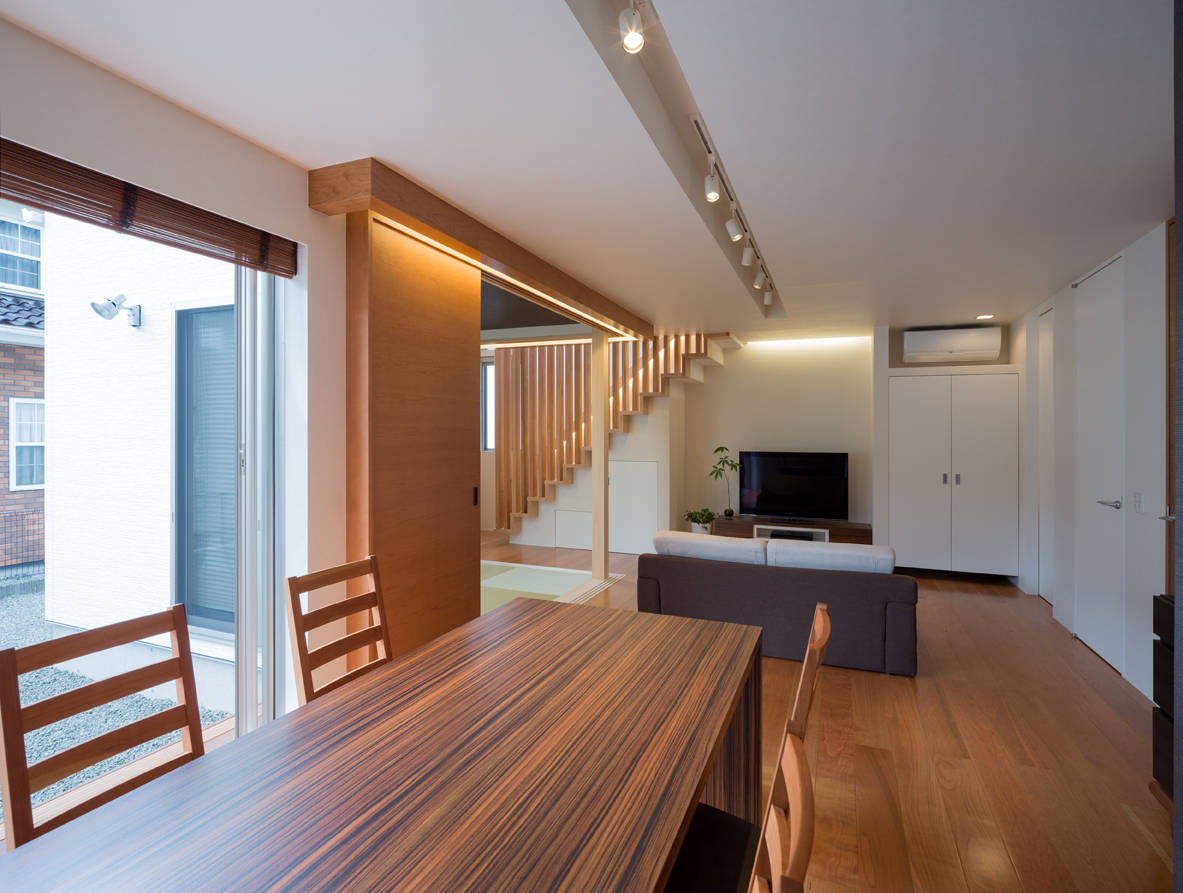 全体の構成としては、1階にキッチンやリビング・ダイニングルーム、和室などの家族団欒の時間を過ごせる機能を持った部屋を配置しました。内装には木のぬくもりや温かみを感じるような床材や壁材を使い、またインテリアにも木のぬくもりを取り込んでいます。