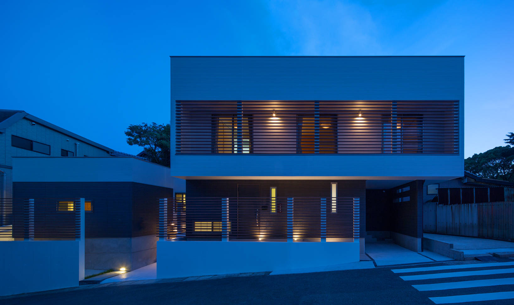 前面道路側から見ると平屋と2階建ての水平ルーバーとスリットによる水平を強調したデザインになります。一体的な印象を持つ建物になるように考えました。