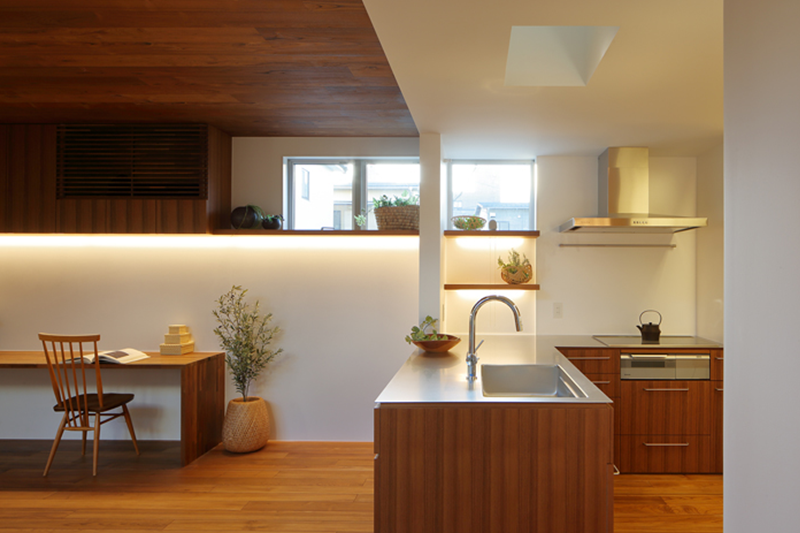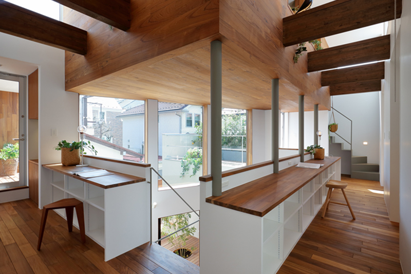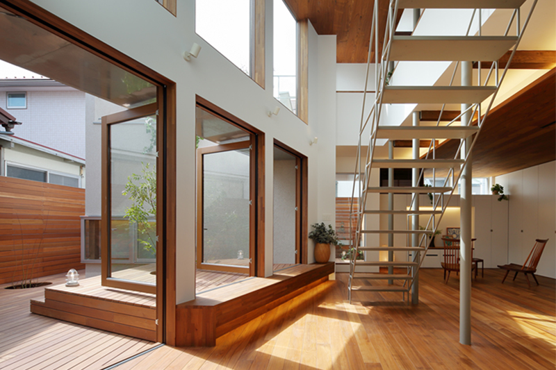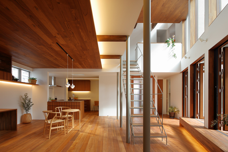 リビングの中心に吹抜けを設けることで、開放感が感じられるとともに、1階と2階のつながりができ、どこにいても、中庭の緑や光が感じられる ようになっています。 また吹抜けと介して 家族がそれぞれの活動の様子や気配を感じられ、愉しく過ごすことのできる住宅となっています。