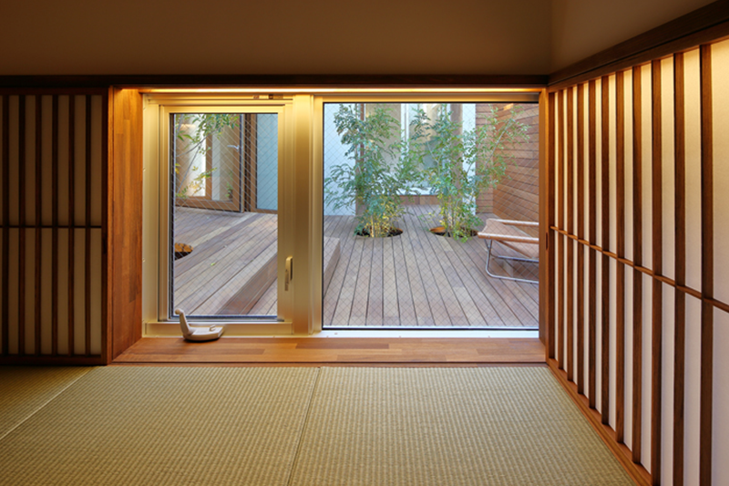 この中庭とこれに隣接するリビングを中心に、住宅の多様な空間がコの字状に配置されるコートハウスとなっています。