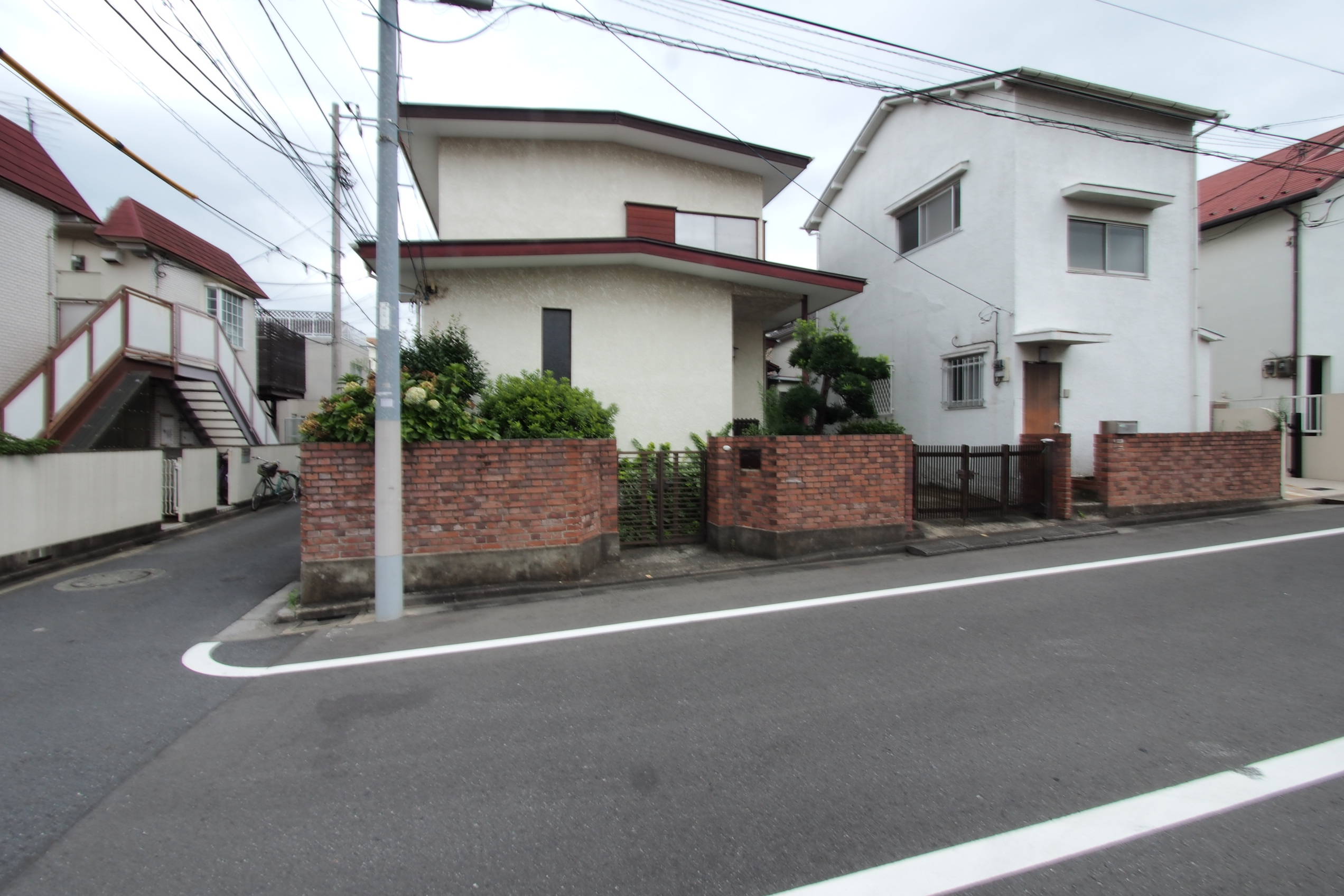 敷地は近くにある線路の踏切音や電車の喧噪音が気になる場所にあったため、外観的には、北及び東側(線路側)の前面道路側に閉じて、