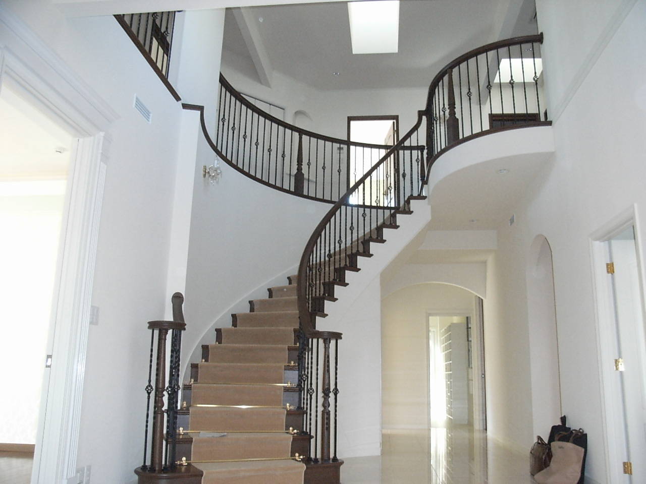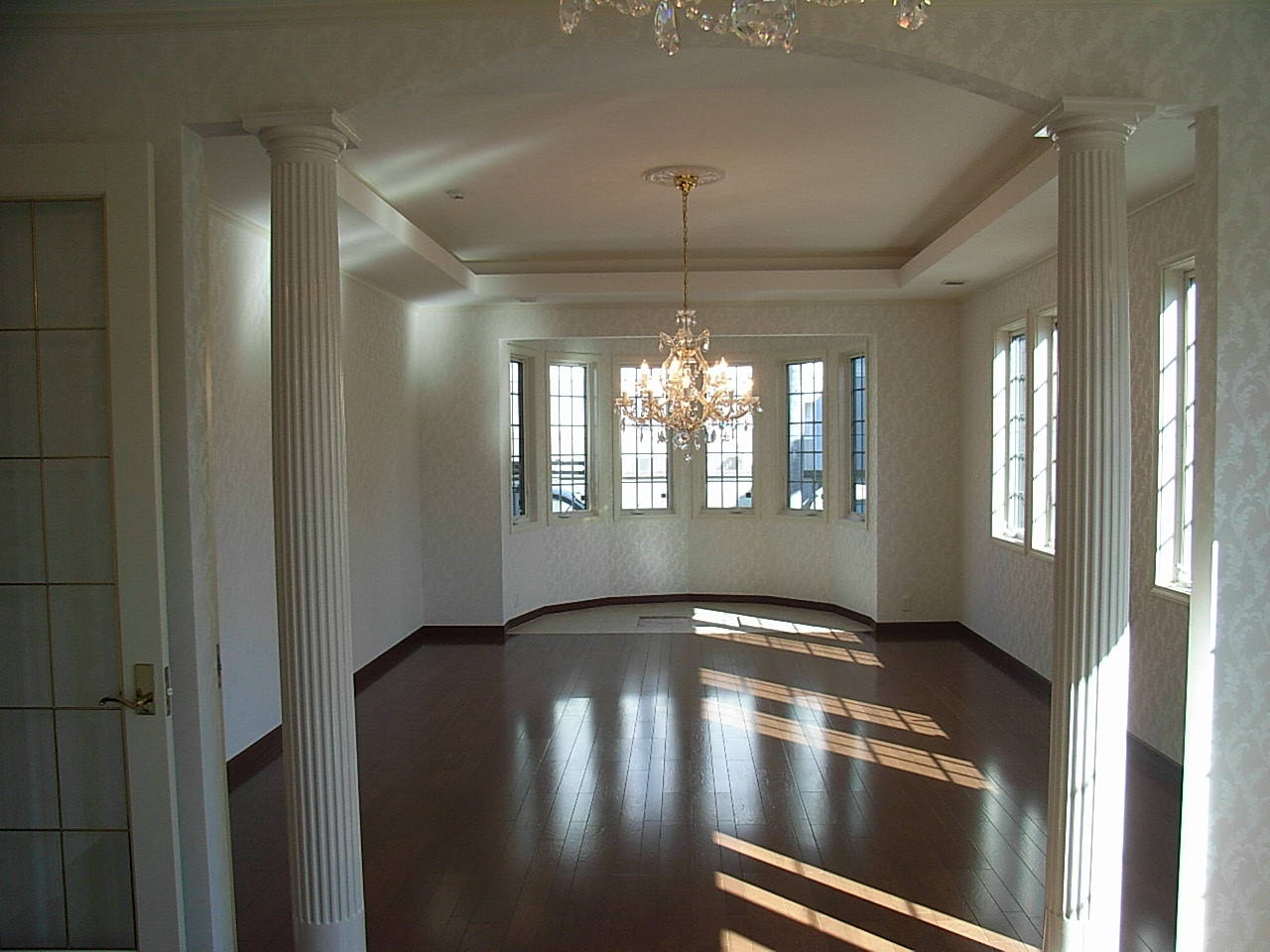 会社経営者の建て主様。高級感豊かな佇まいでありながらも、決して威圧的になることのないデザインをご希望されました。ご夫妻がイメージされていたのが北米の伝統的なジョージアン様式。しかしながら、ほぼ整形地とはいえ街並みから奥まった接道条件の特殊な敷地のため、プランニングには難航しました。最終的に玄関・ホールを中心に据えながらも左右非対称の平面計画とし、吹抜や回遊動線によって各部屋が緩やかに連続していく構成を採用しました。そうした連続性は、ところどころに配置された曲線要素によりナチュラル/リズミカルに感じられるよう配慮し、インテリアの要であるスパイラル・ステアケース(螺旋階段)を一層引き立たせることに成功しています。さらに大きなトップライトが、窓の殆んどない玄関・ホールに豊かで優しい自然光を供給しています。エクステリア・デザインは、シングル・スタイル的な開放的プランにジョージアン様式の厳格なスタイルを如何に上手く融合させるか、に配慮しました。素材・装飾材の選択に細心の注意を払い、それらの配置は平面・立面計画とのバランスを十分に考慮したうえで決定しました。ひとつ残念であったのは、施工会社の規準及び工事予算の制限により、ポーチ廻り外壁の自然石張りができなかったことでしょう。