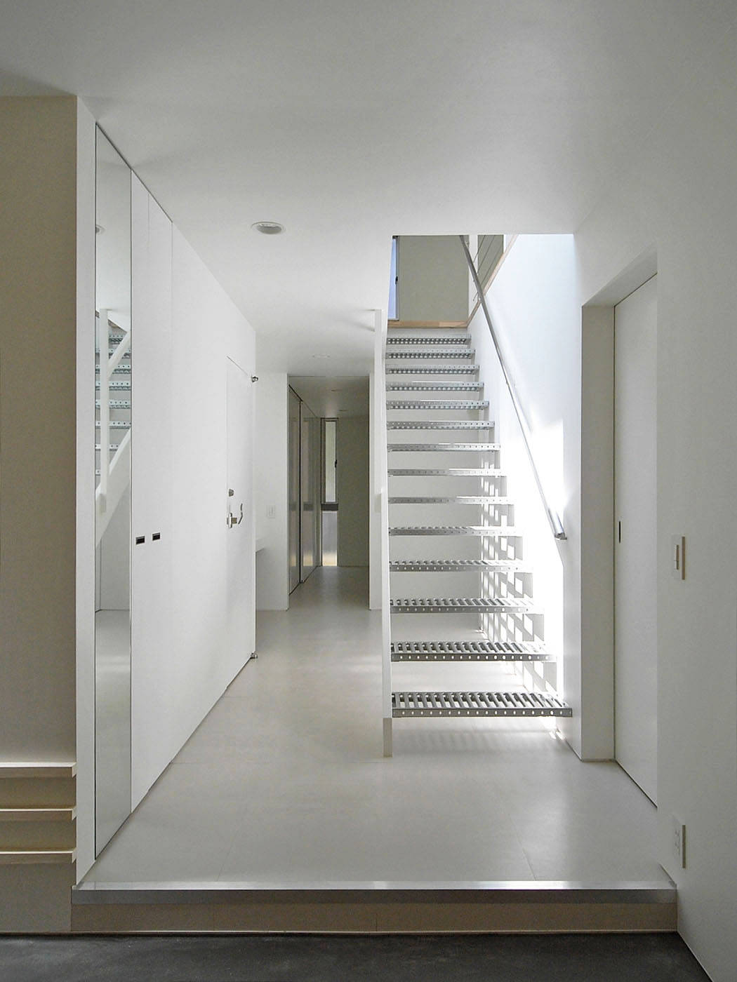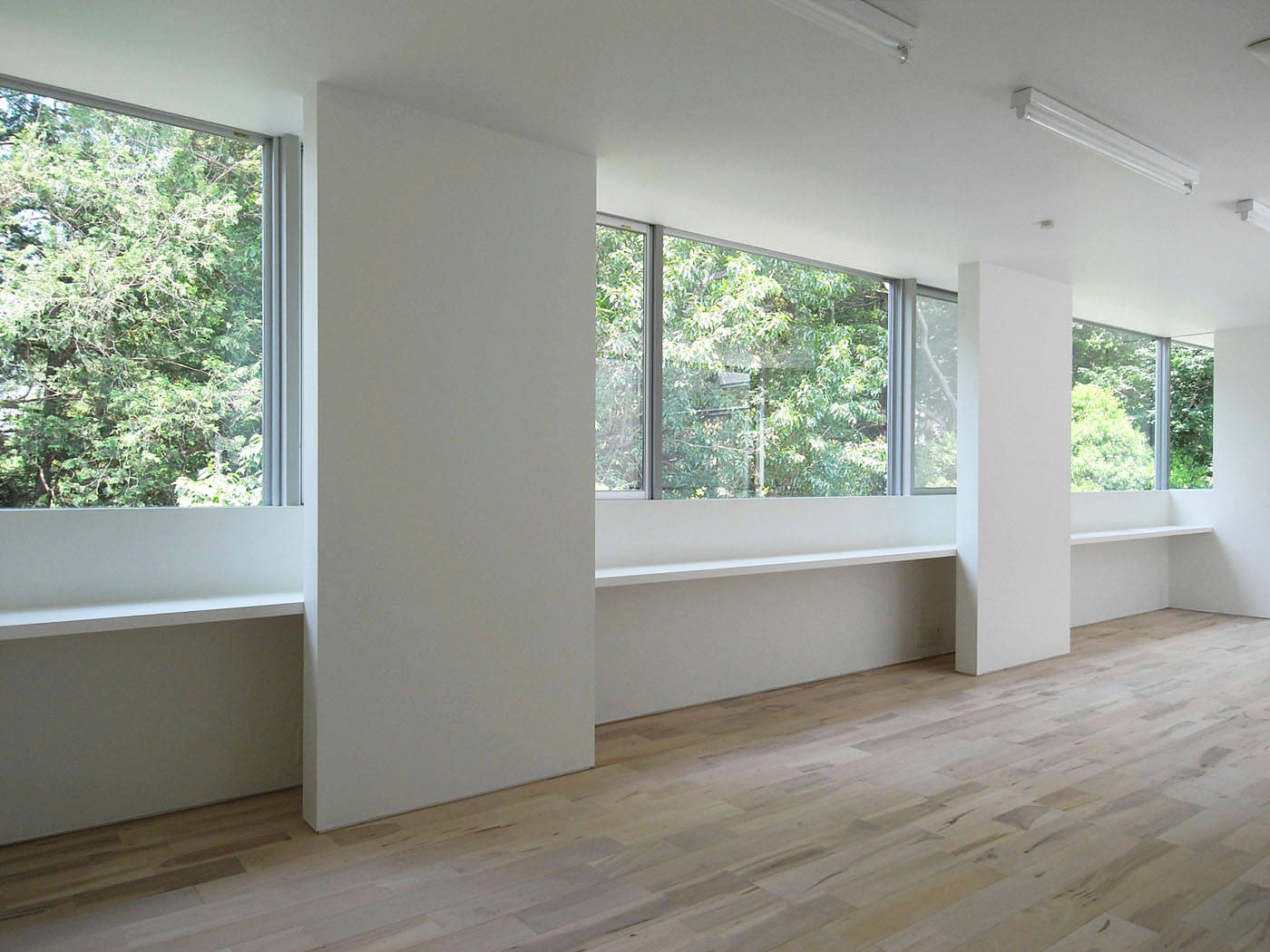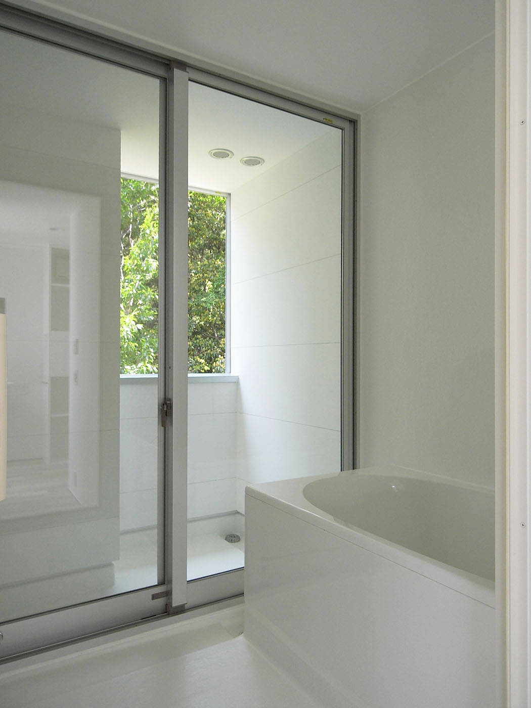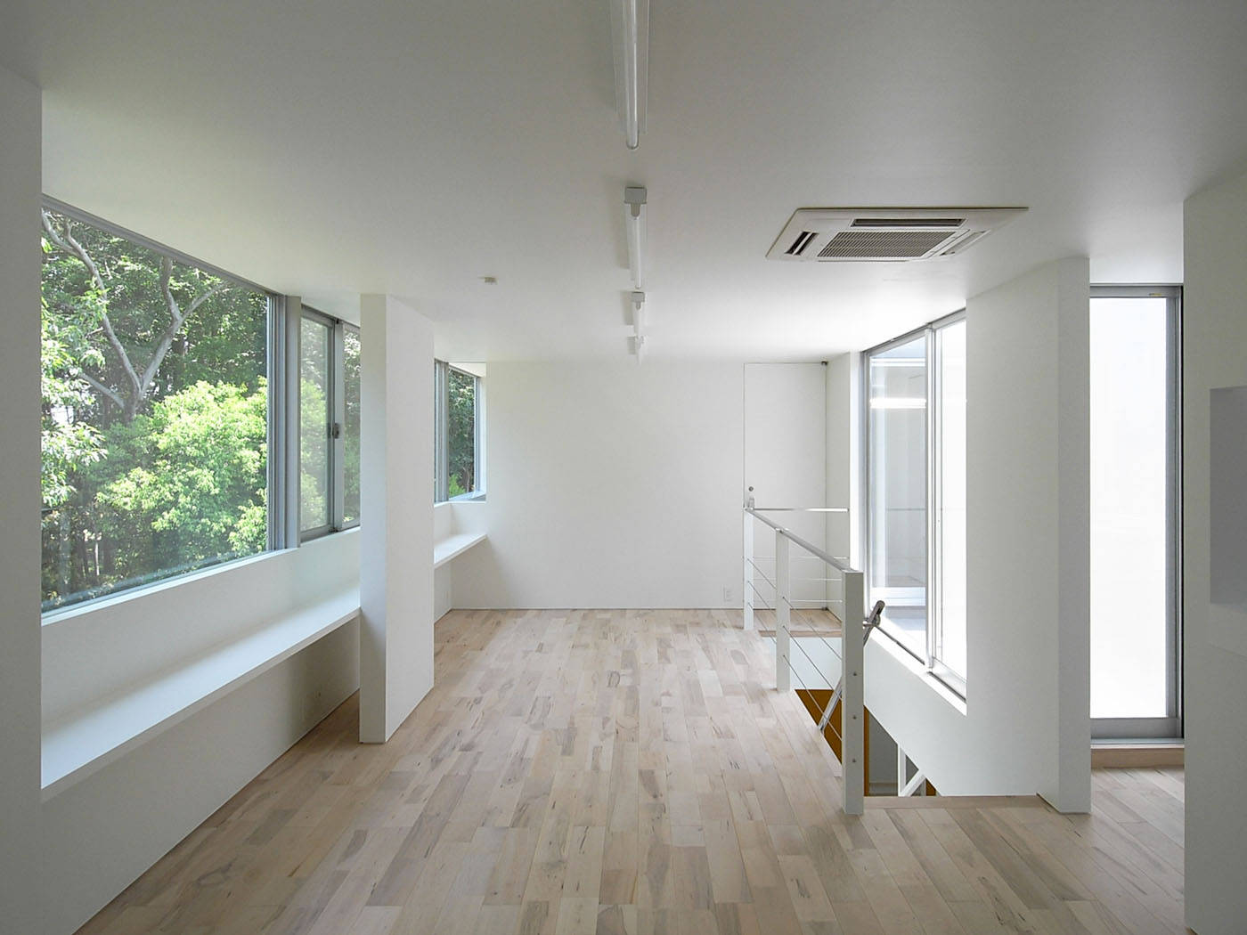 2階に持ち上げたリビングは、北側の緑地に窓を向け、南側の宅地に対しては壁で閉じた。その代わり、中庭状のバルコニーを設けることで、上方から南の光を取り込んだ。これにより、明るくかつ視界に隣家の入らない、落ち着いたスペースを実現している。