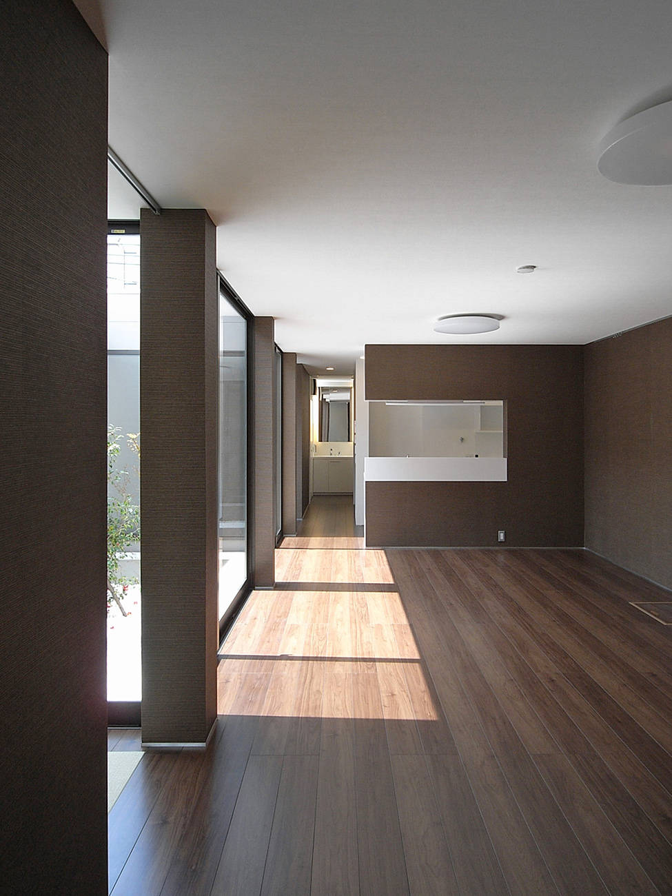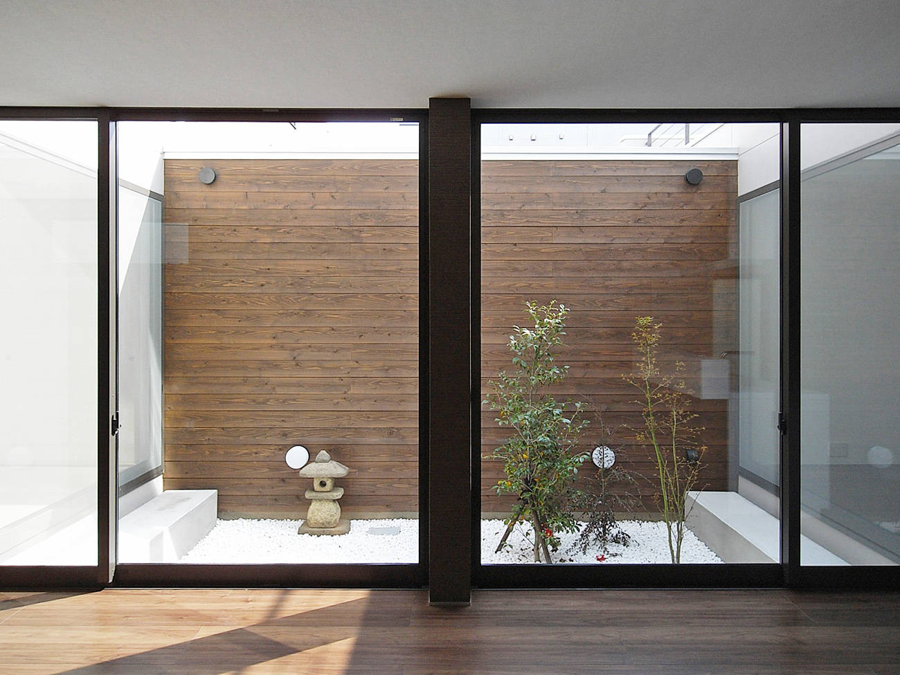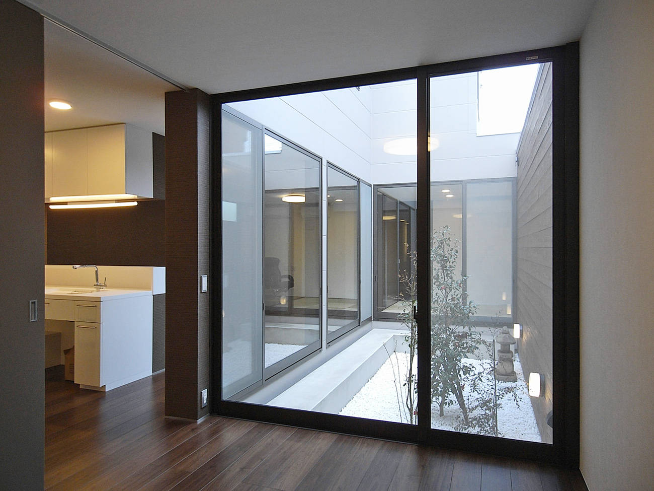幹線道路沿いに立つ低層住宅。周囲に中高層が建ち並んでも良好な居住環境を保つため、建物の中央部に中庭を設け、そこに面して1階の居室を配置。プライバシーを守りながら明るさを確保している。また、中庭は延焼の規制が外れるため、防火地域であっても網入りガラス使を使わずにすみ、クリアな眺めが得られている。