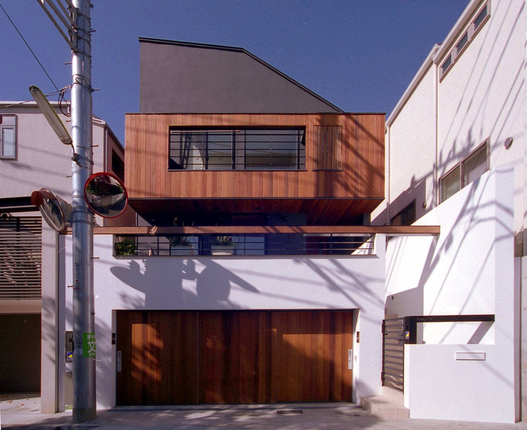 半地下に位置する2台並列ガレージの上に 屋外テラス を設け、