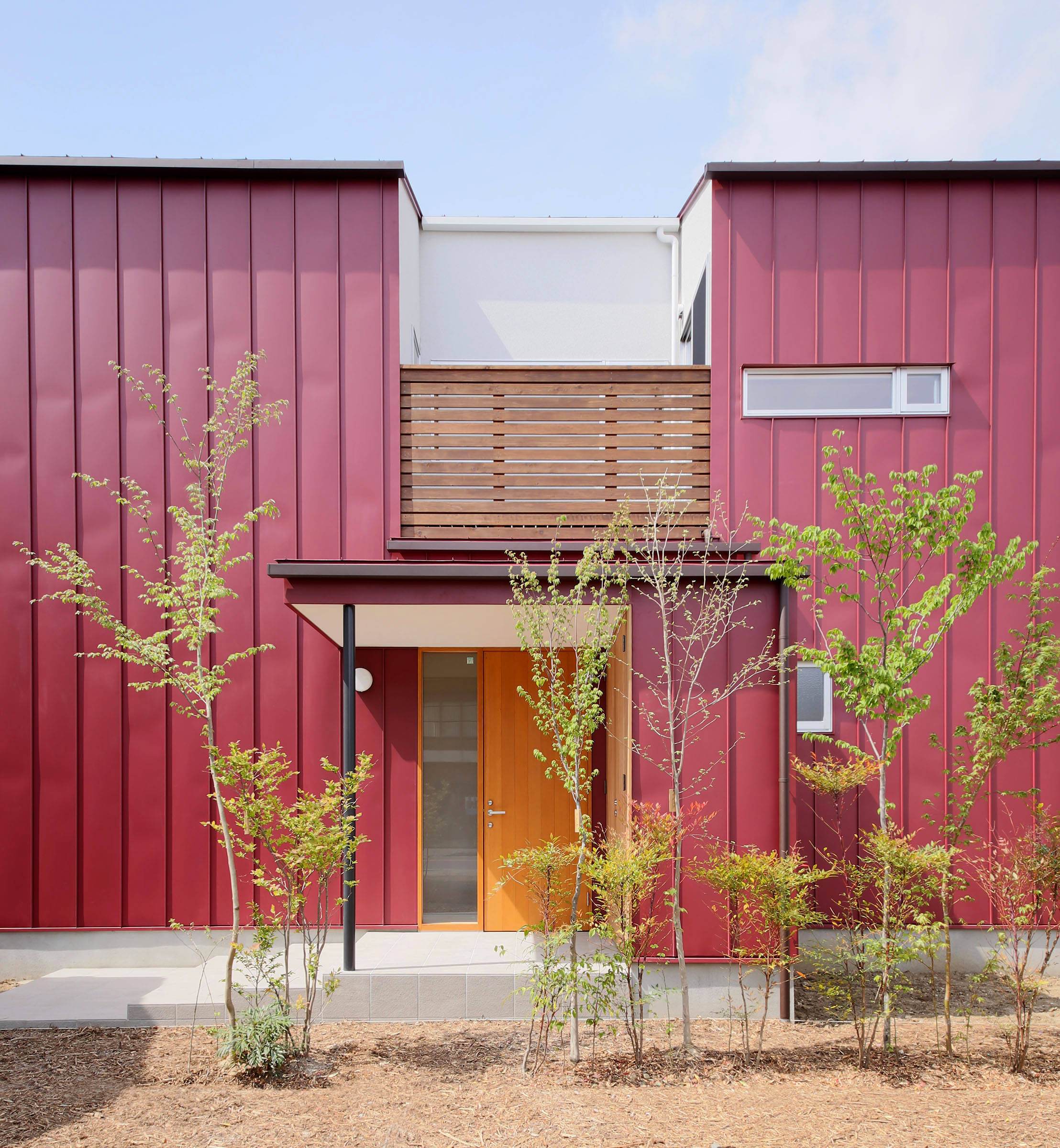 赤いガルバリウム鋼板の縦ハゼ葺きと白いラスモルタルリシンのコンビネーション。