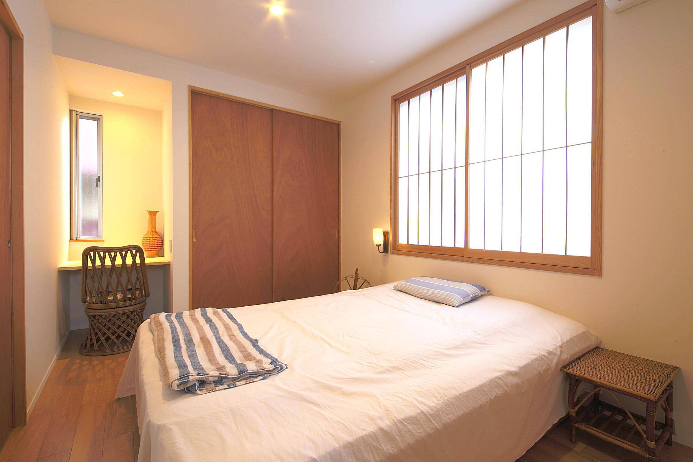 シンプルな中にも質感を際立たせるため、家具や建具は敢えて赤いラワン材を使用。