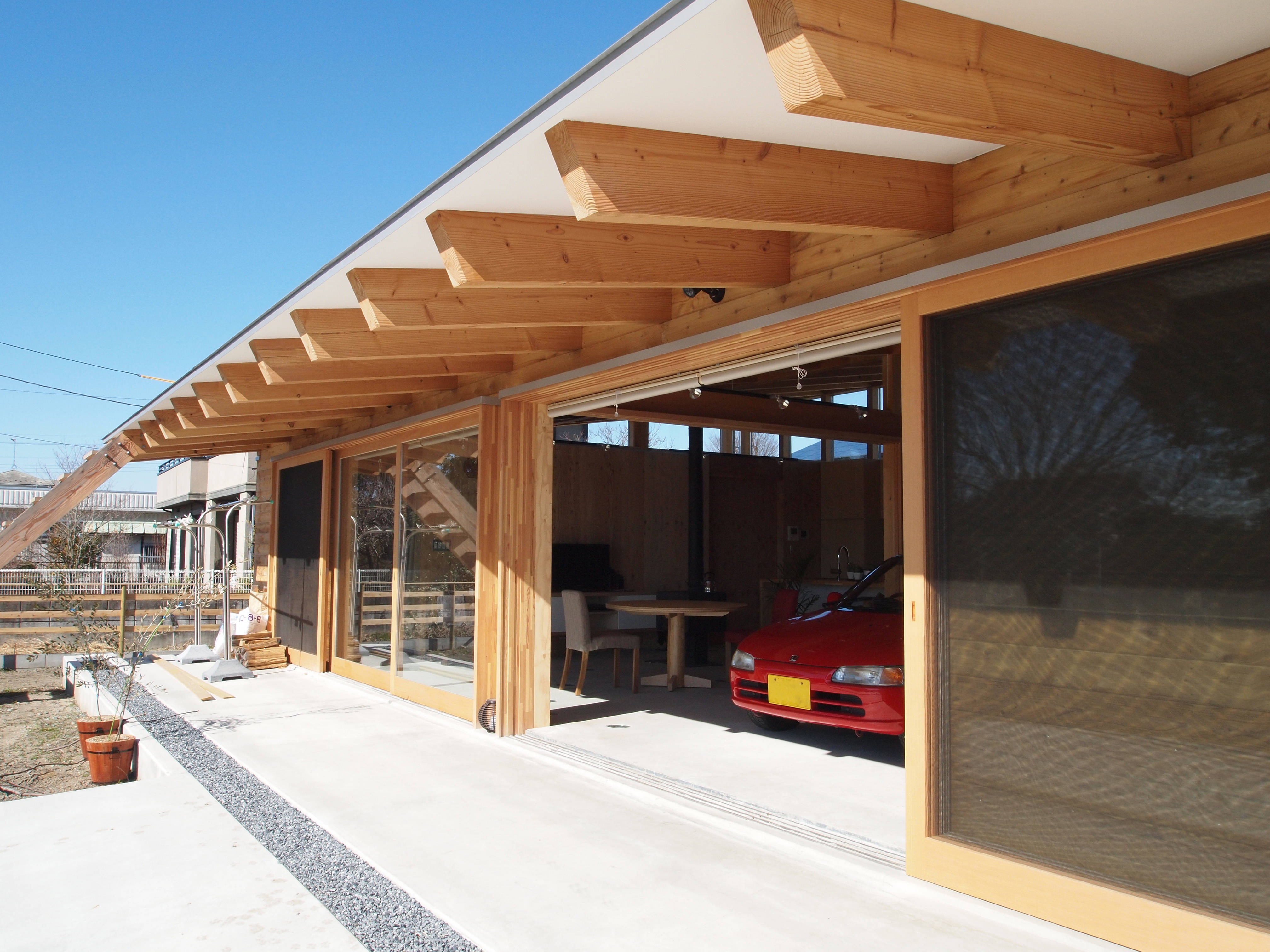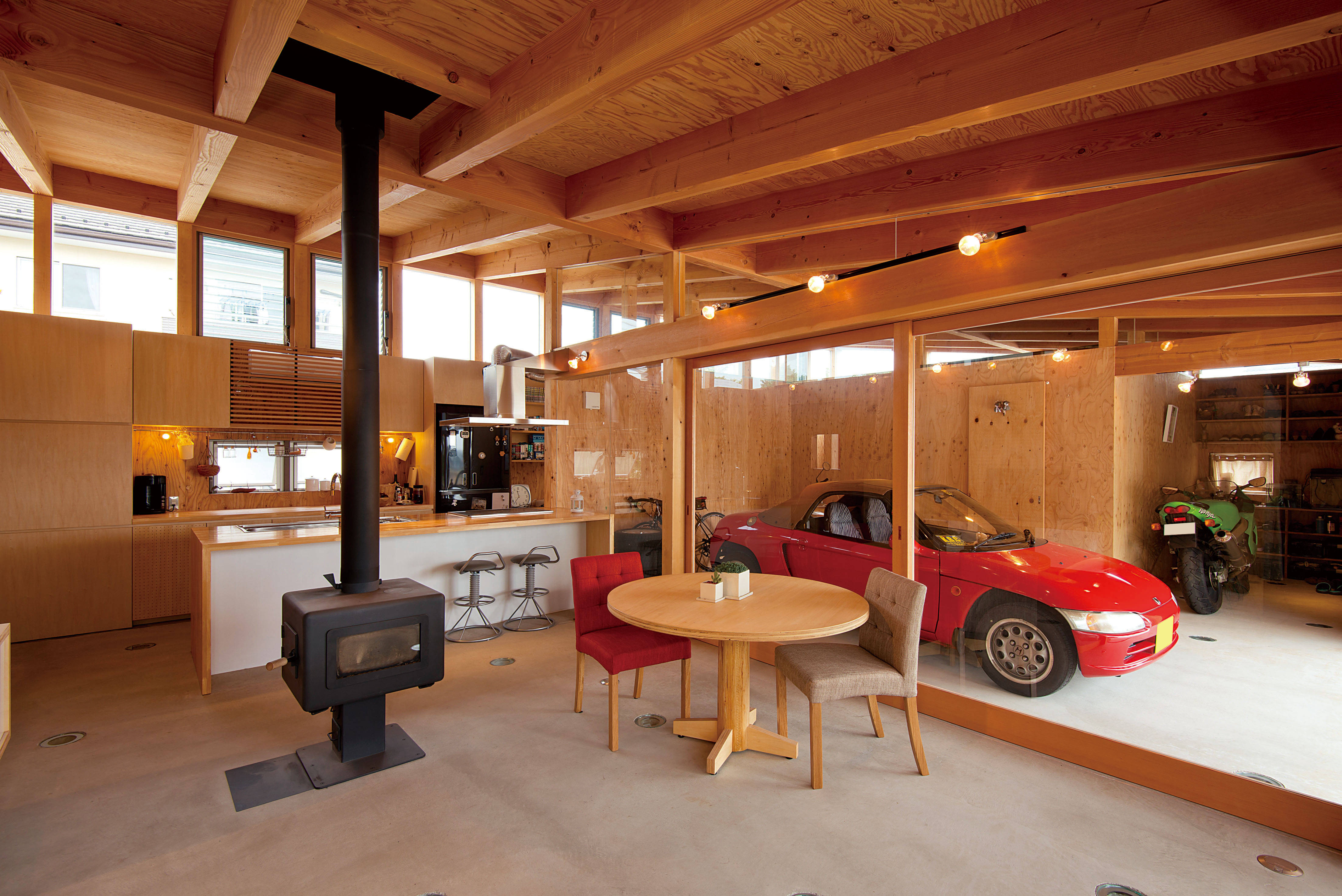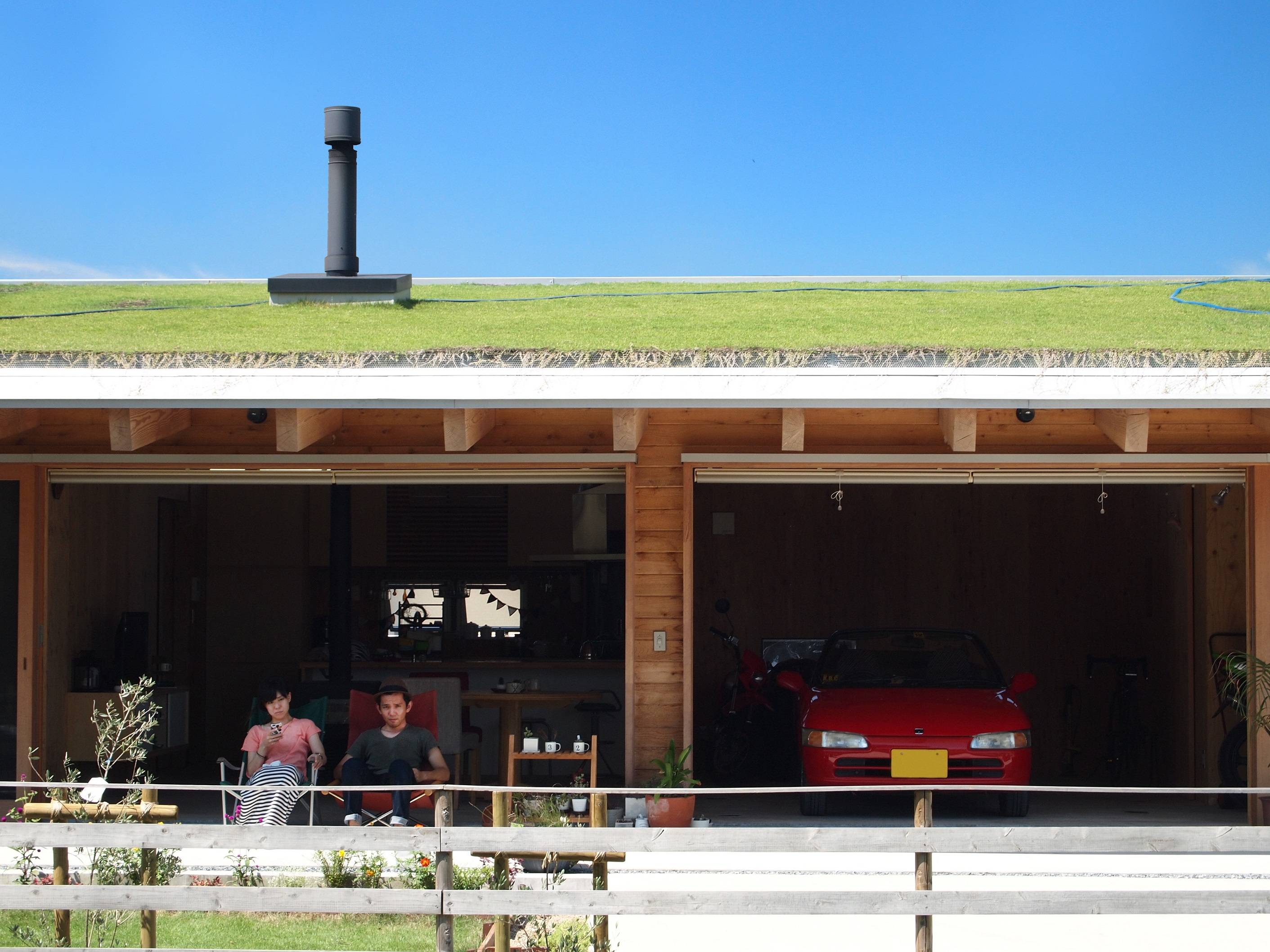 リビング、愛車の居場所、屋外テラスの床すべてをコンクリート土間とすることで、それぞれを連続させながら全体を一つにしています。愛車を眺めながら食事をしたりくつろいだり、常に大好きな愛車を感じながら暮らす家です。内装壁・天井はすべて針葉樹合板で強度を確保しながらコストを抑えたラフな仕上がりとなっています。断熱効果の高い草屋根は地球環境に配慮すると共に、毎年猛暑を記録するこの地でも快適に過ごすことができます。そしてその外観はまだまだ緑の多いこの地域に違和感なく溶け込んでいます。