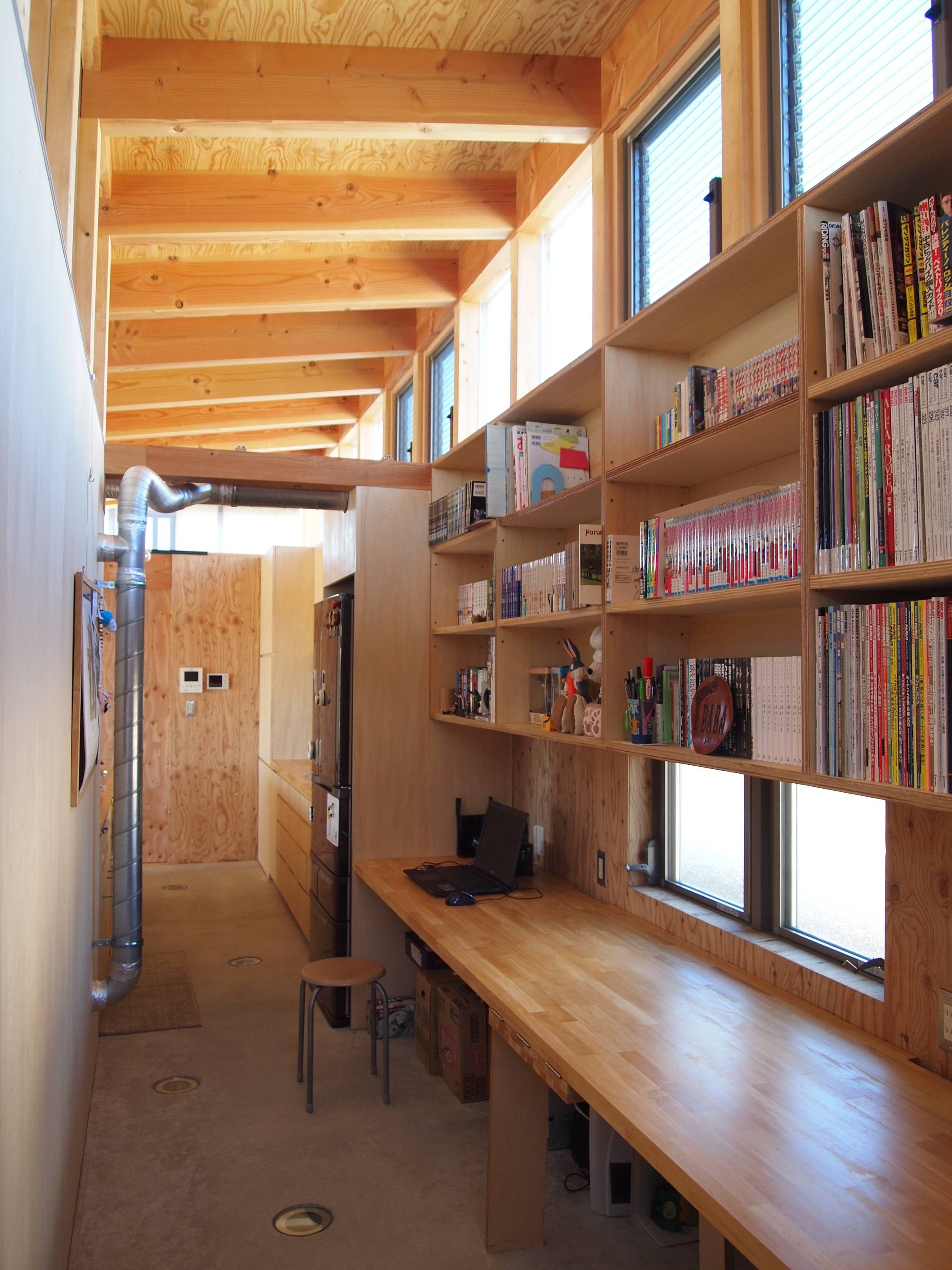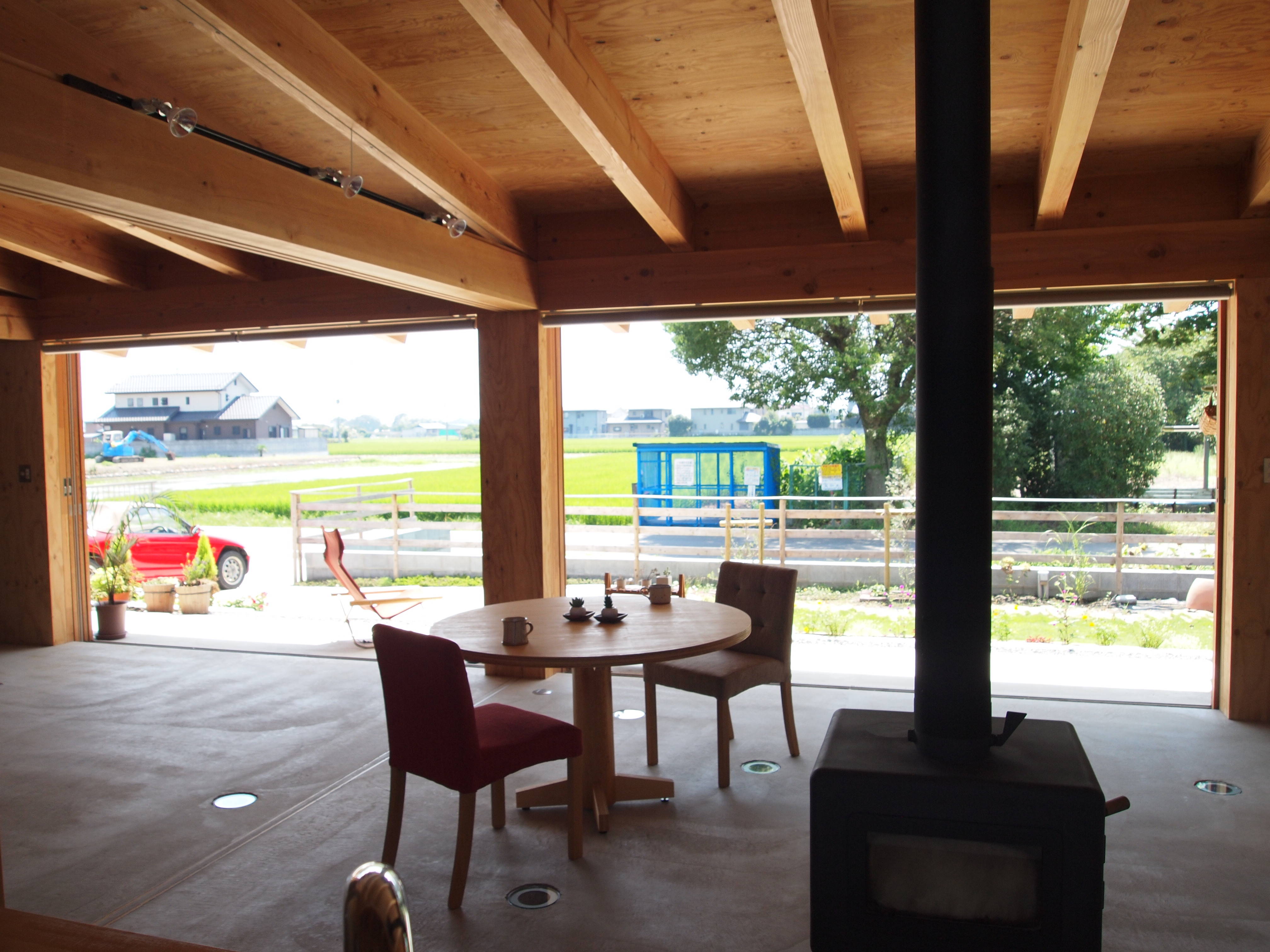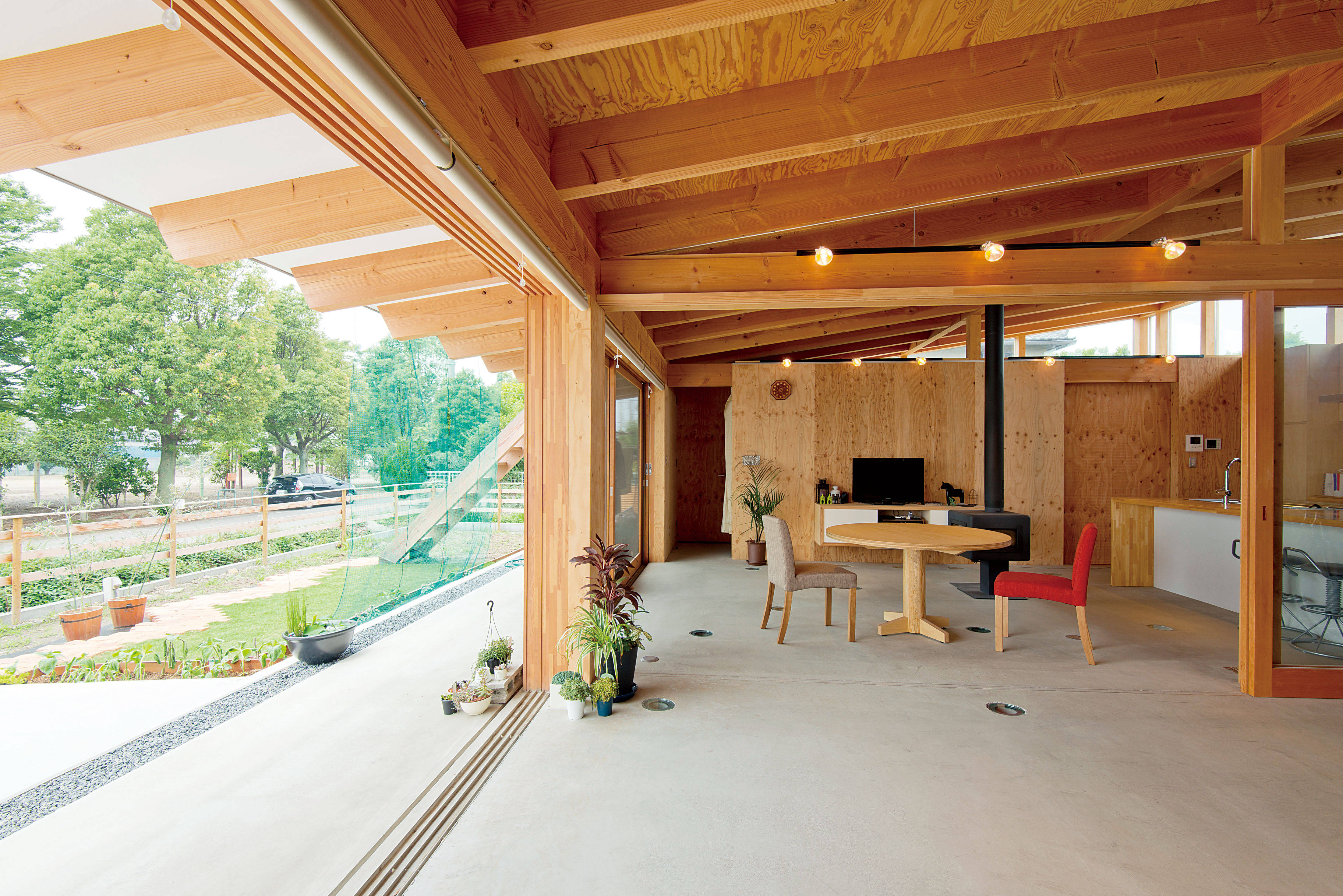 リビング、愛車の居場所、屋外テラスの床すべてをコンクリート土間とすることで、それぞれを連続させながら全体を一つにしています。愛車を眺めながら食事をしたりくつろいだり、常に大好きな愛車を感じながら暮らす家です。内装壁・天井はすべて針葉樹合板で強度を確保しながらコストを抑えたラフな仕上がりとなっています。断熱効果の高い草屋根は地球環境に配慮すると共に、毎年猛暑を記録するこの地でも快適に過ごすことができます。そしてその外観はまだまだ緑の多いこの地域に違和感なく溶け込んでいます。
