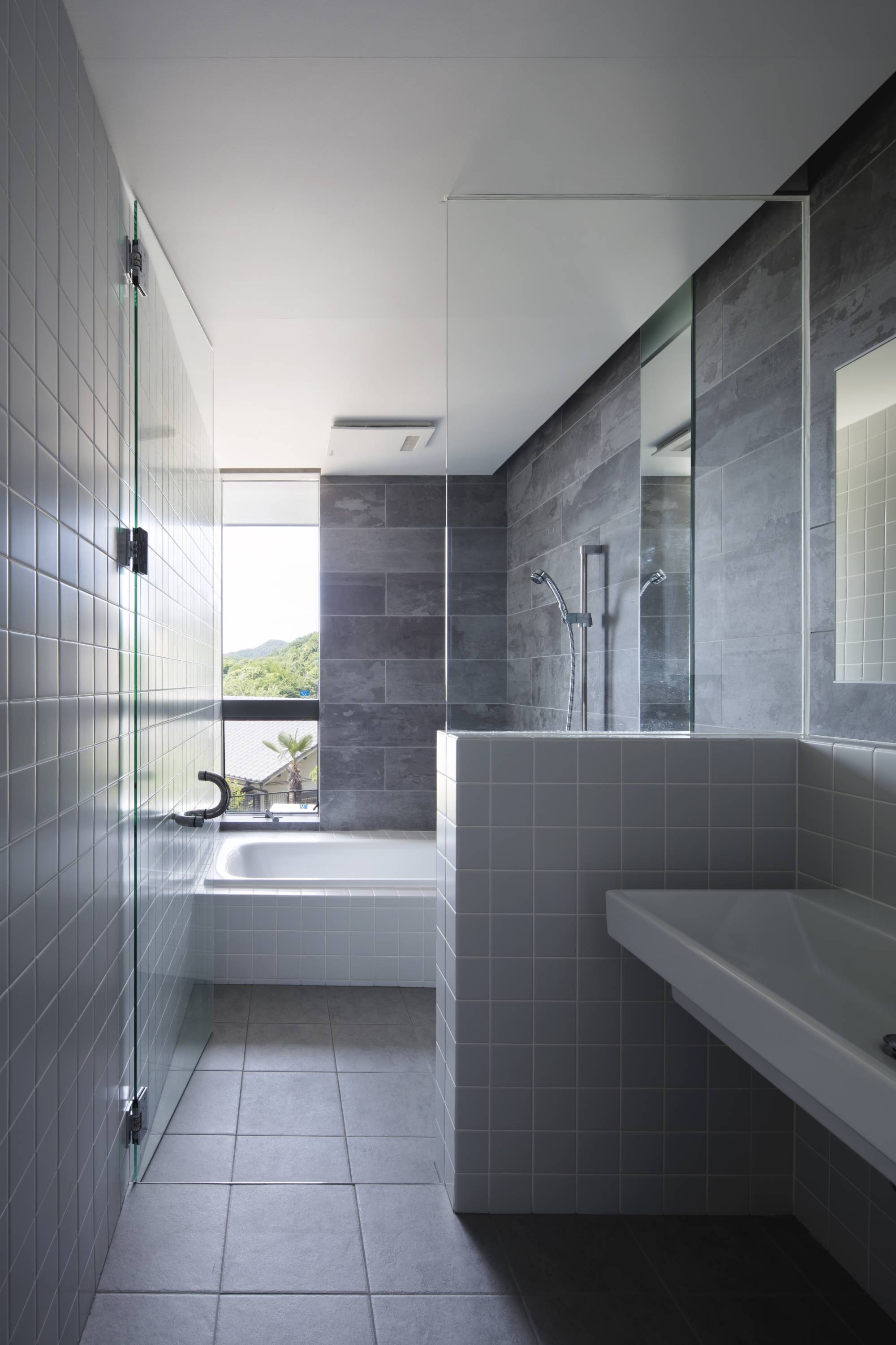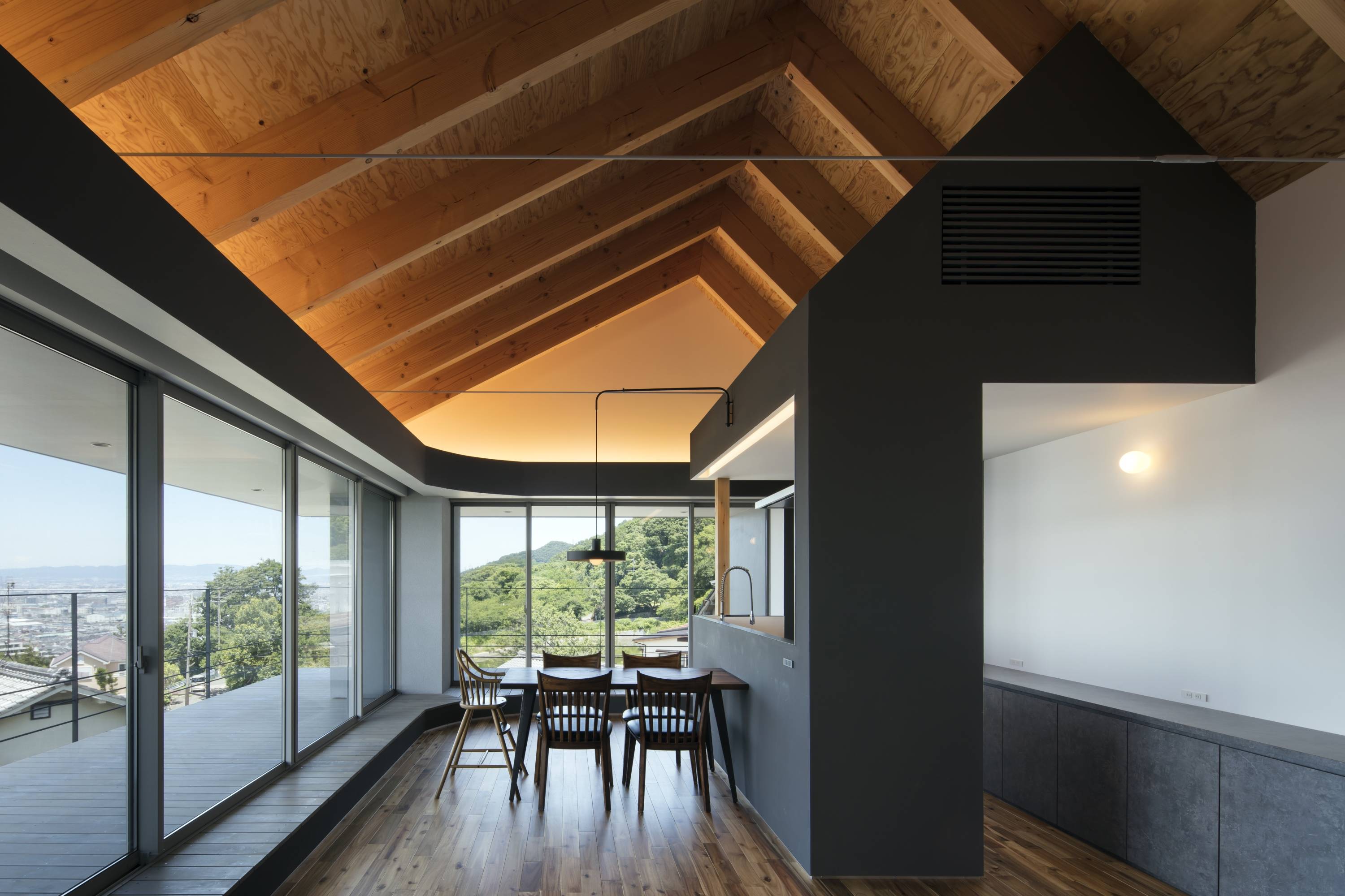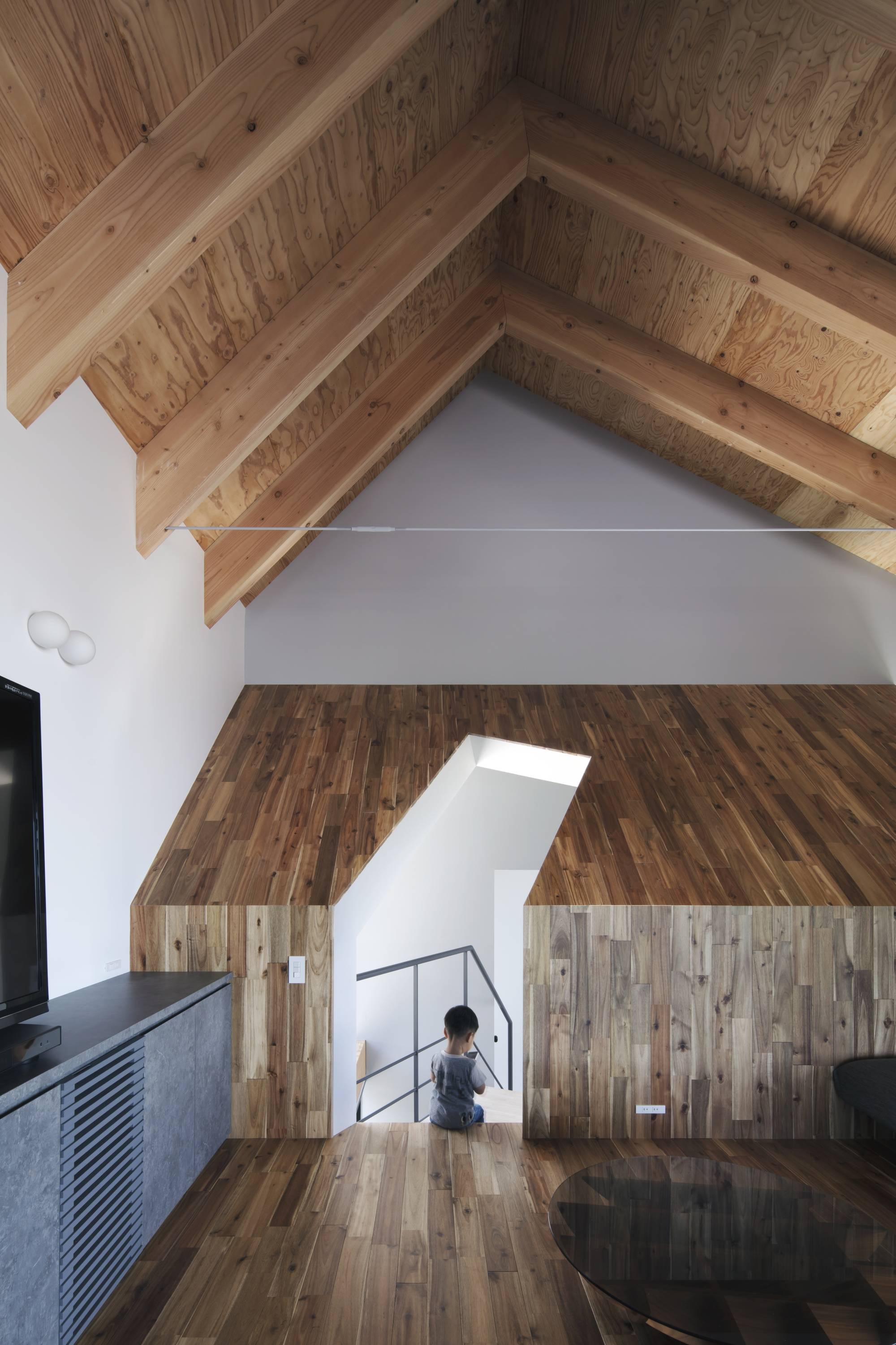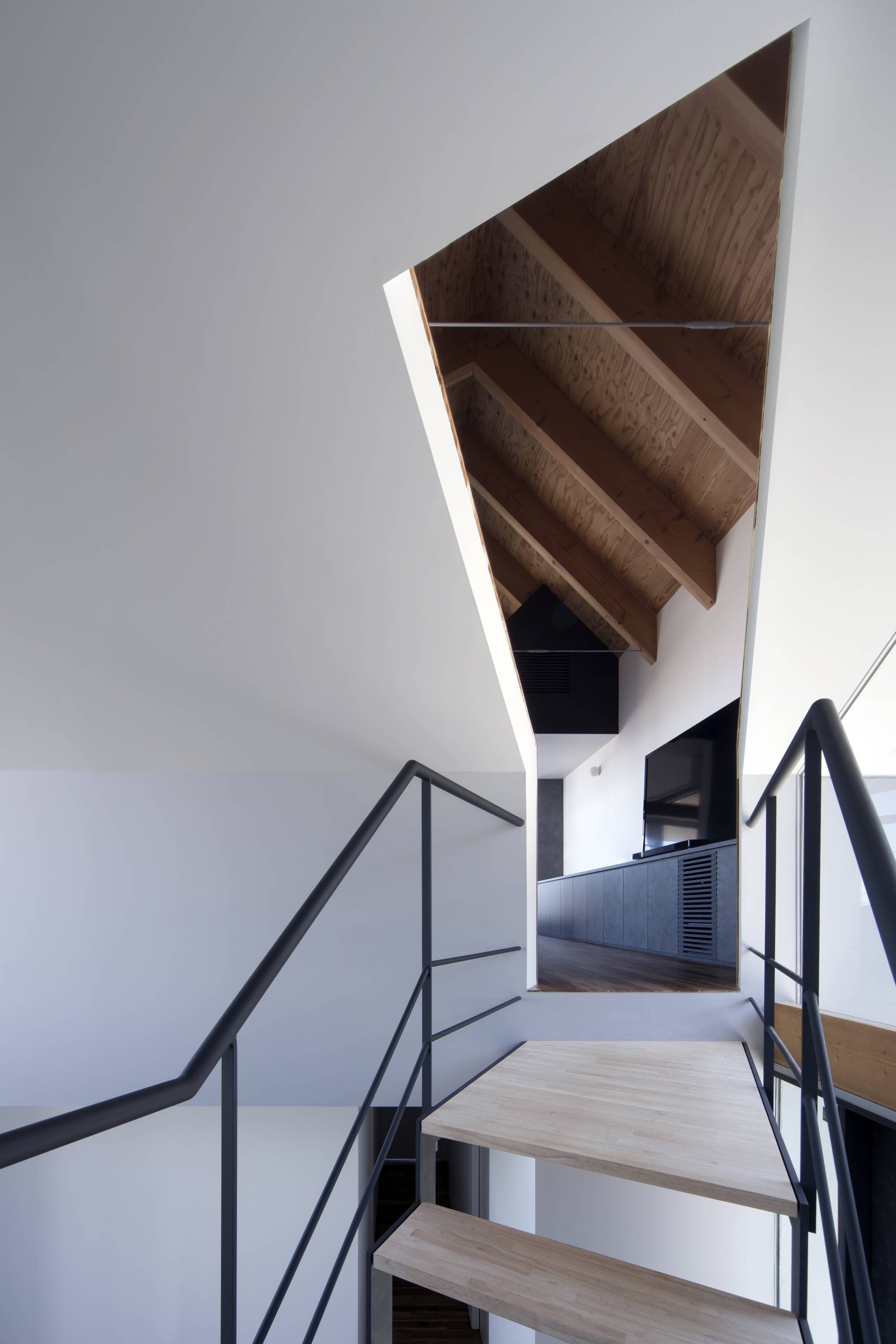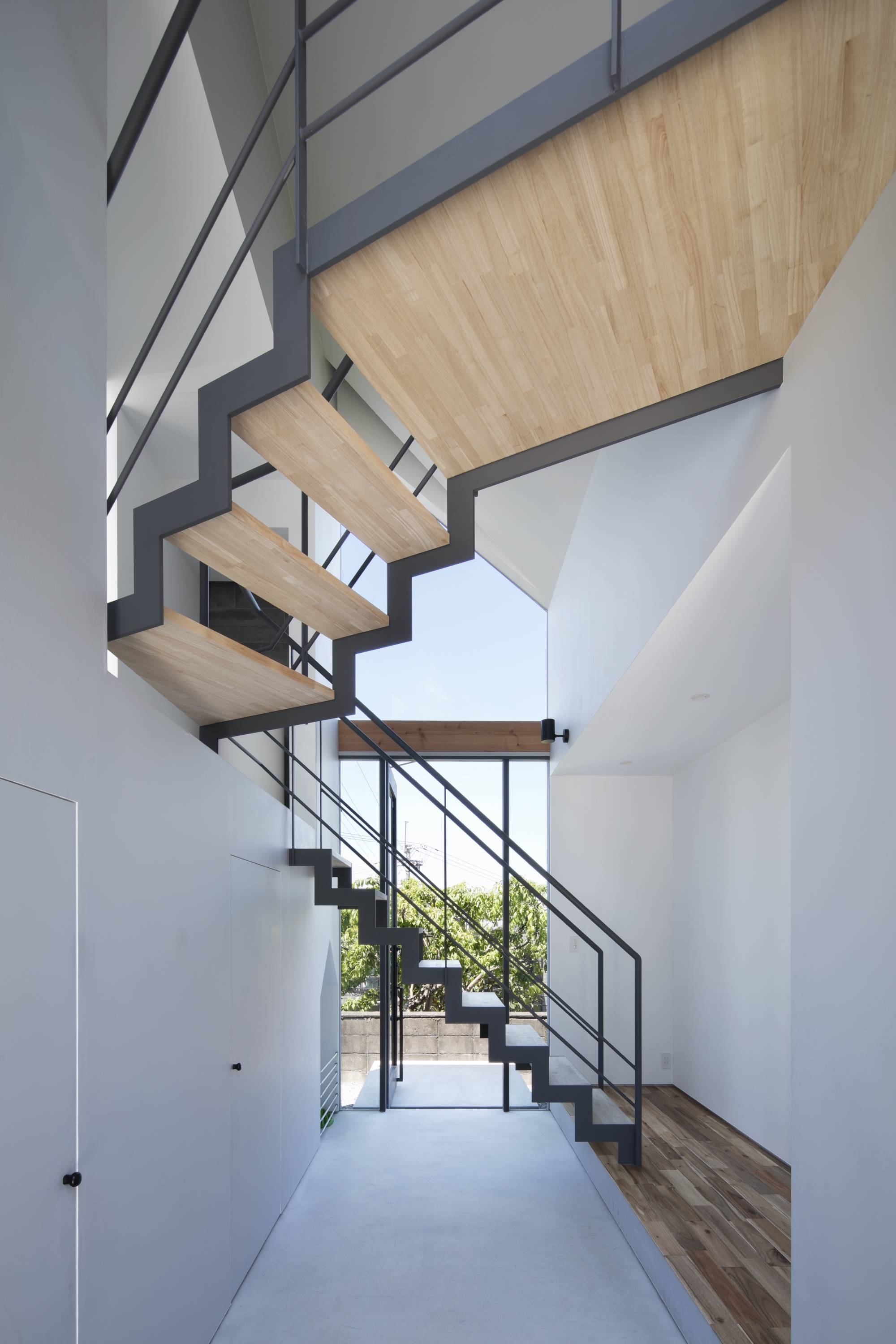 2階にLDKを配置することとし、将来の周辺環境の変化や景色を取り入れるためにも高度を確保するには最適だと考えた。また全面道路のL字路に面している旗竿地の竿の部分に玄関ホールを配置した。この玄関ホールは道路からの視界が抜けるように透明感のある空間とした。縦に切り取った景色に対し階段を交差させ視線の変化を誘導することで、LDKの眺望に期待を感じさせる装置として機能させている。階段を登りきれば天井と壁の切り込みからLDKに接続することができる。天井の高い空間にL型に配置した額縁を持つ奥行きのあるバルコニーは、立体的に効果的に景色を切り取り引込む。奥行きのあるバルコニーには、入側縁から外縁へという日本的関係性を作ることで内部から外部に向かって緩やかな連続性を築いている。天井は変形したイエ型で登梁を現しで仕上げている。